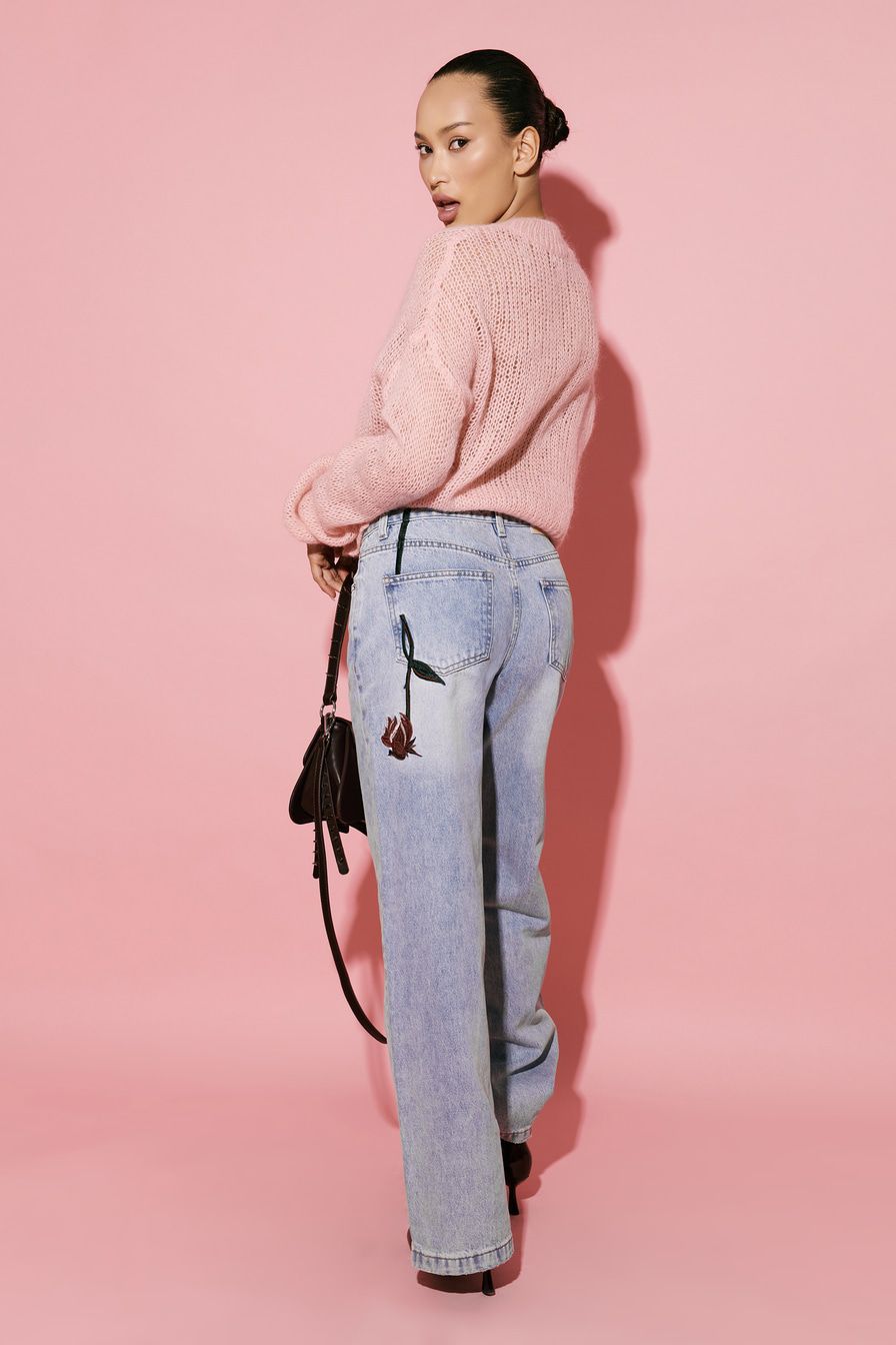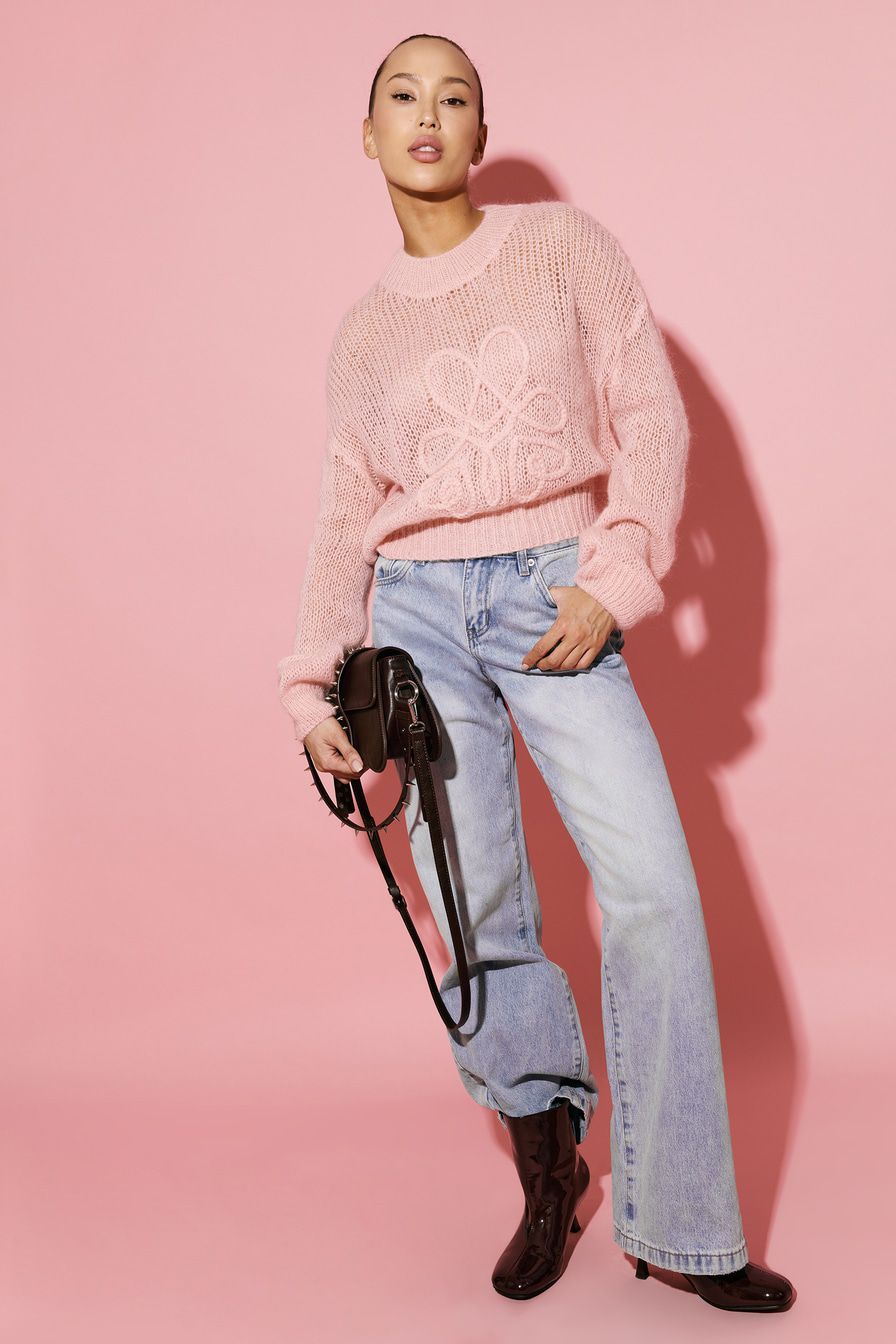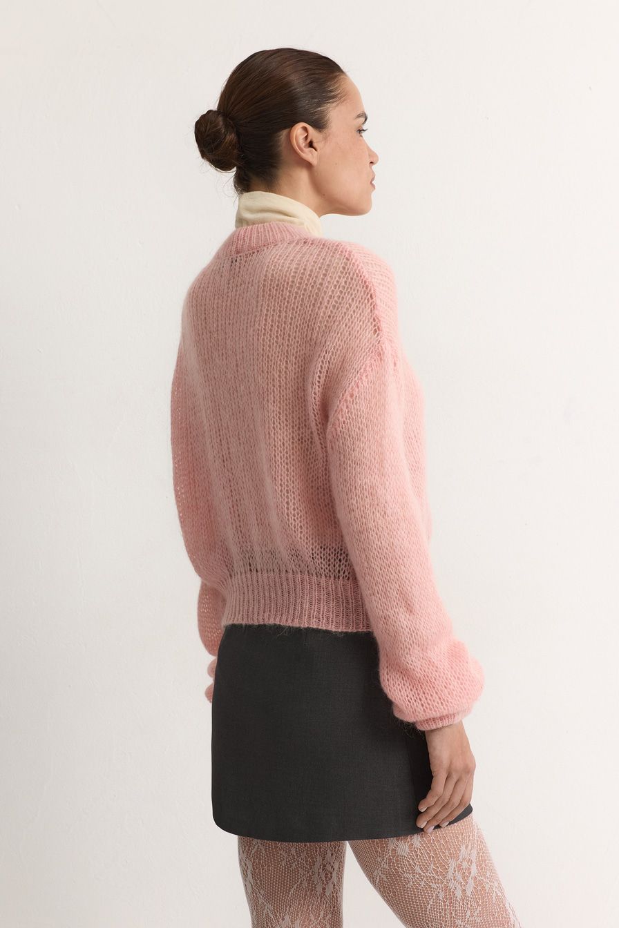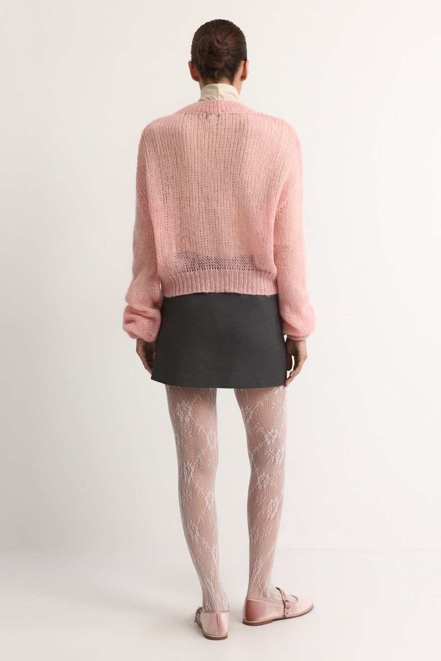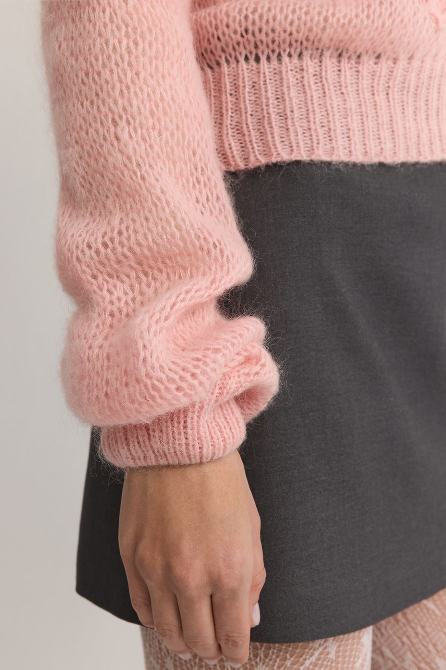 Слегка укороченный джемпер-паутинка свободного кроя выполнен из смесовой ткани с добавлением шерсти и мохера, декорирован фактурным узором.