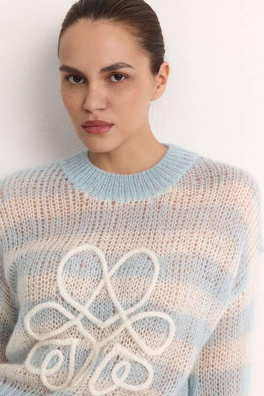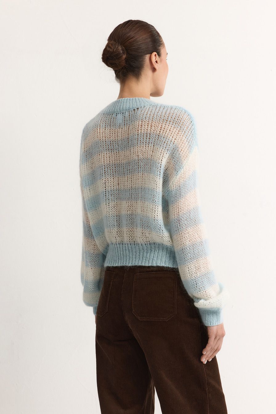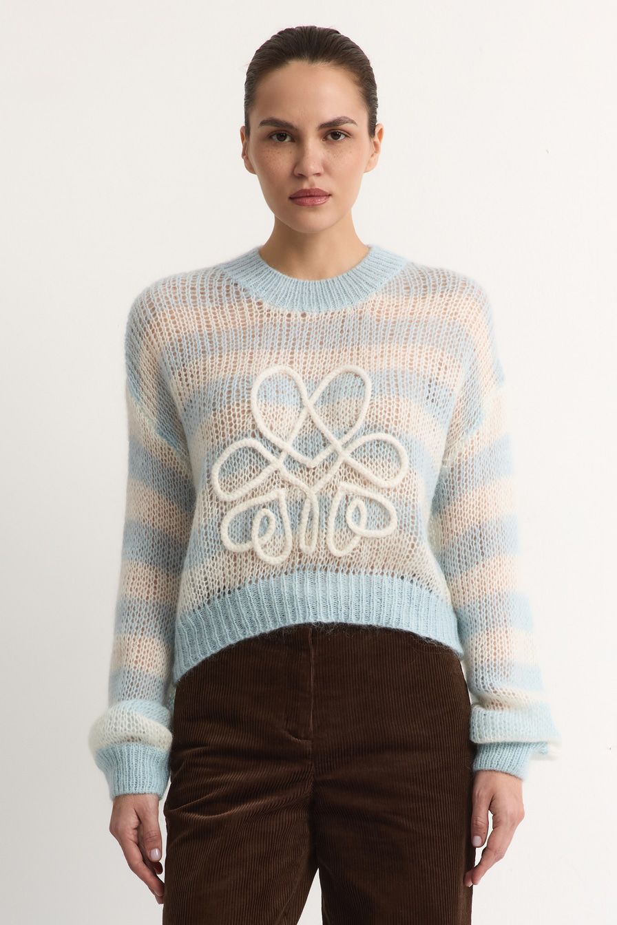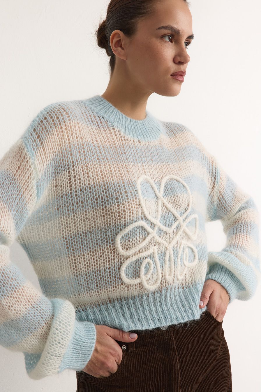 Слегка укороченный джемпер-паутинка свободного кроя выполнен из смесовой ткани с добавлением шерсти и мохера, декорирован принтом «полоска» и фактурным узором.