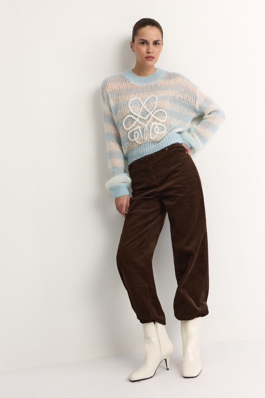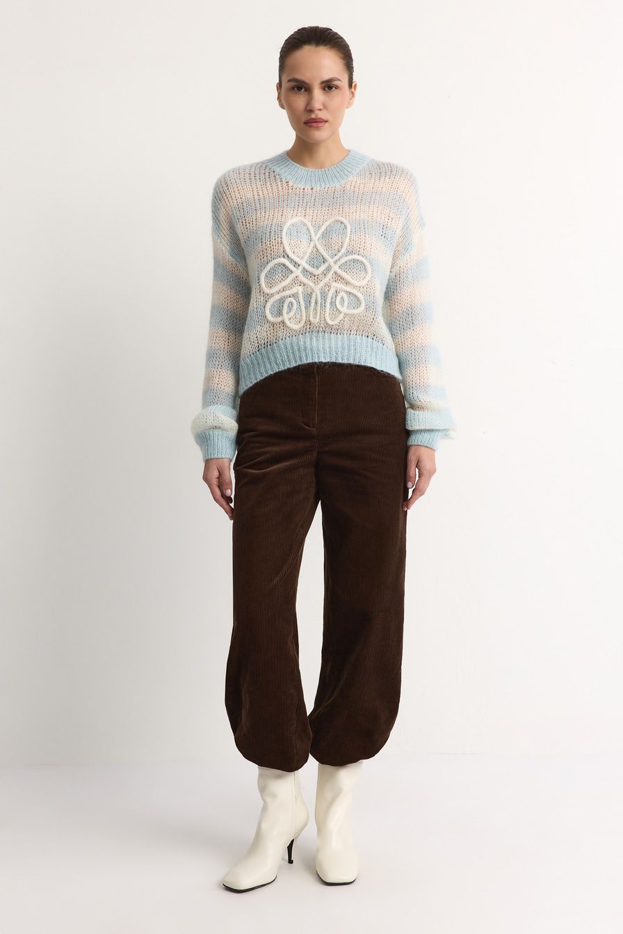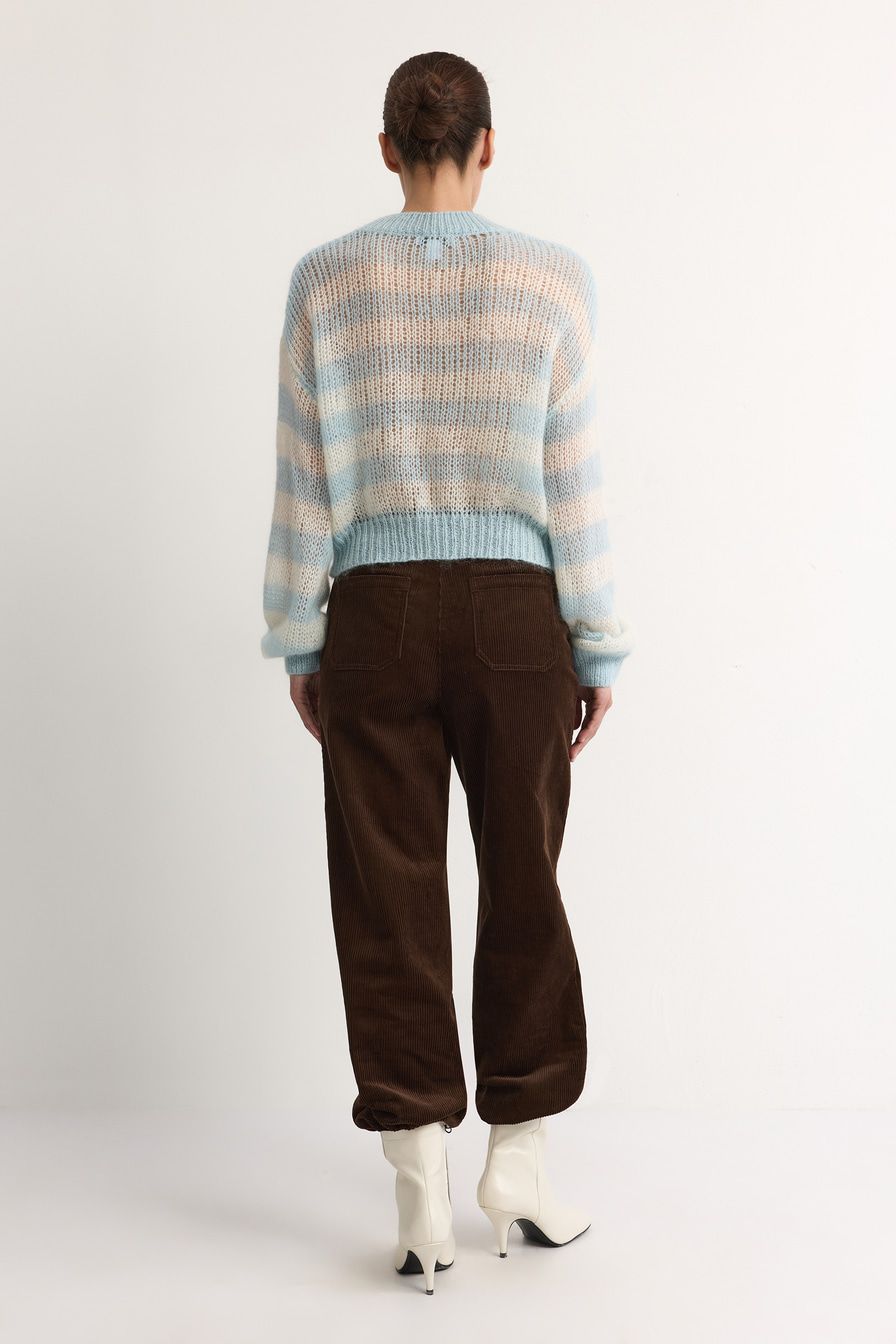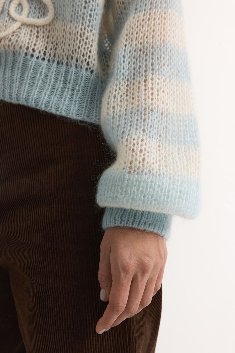 Слегка укороченный джемпер-паутинка свободного кроя выполнен из смесовой ткани с добавлением шерсти и мохера, декорирован принтом «полоска» и фактурным узором.