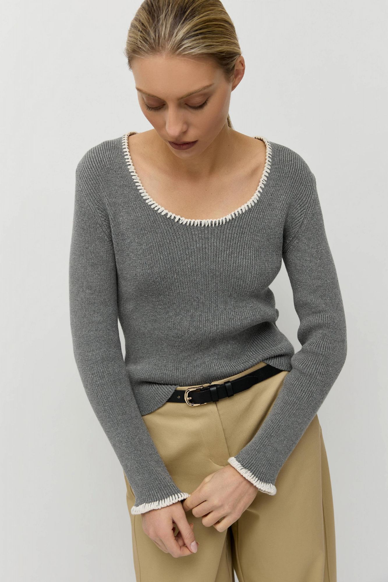 Вырез горловины и низ рукавов вручную обвязаны крючком контрастной нитью в качестве главного акцента модели. Джемпер можно носить поверх майки, футболки и первым слоем под жакет.