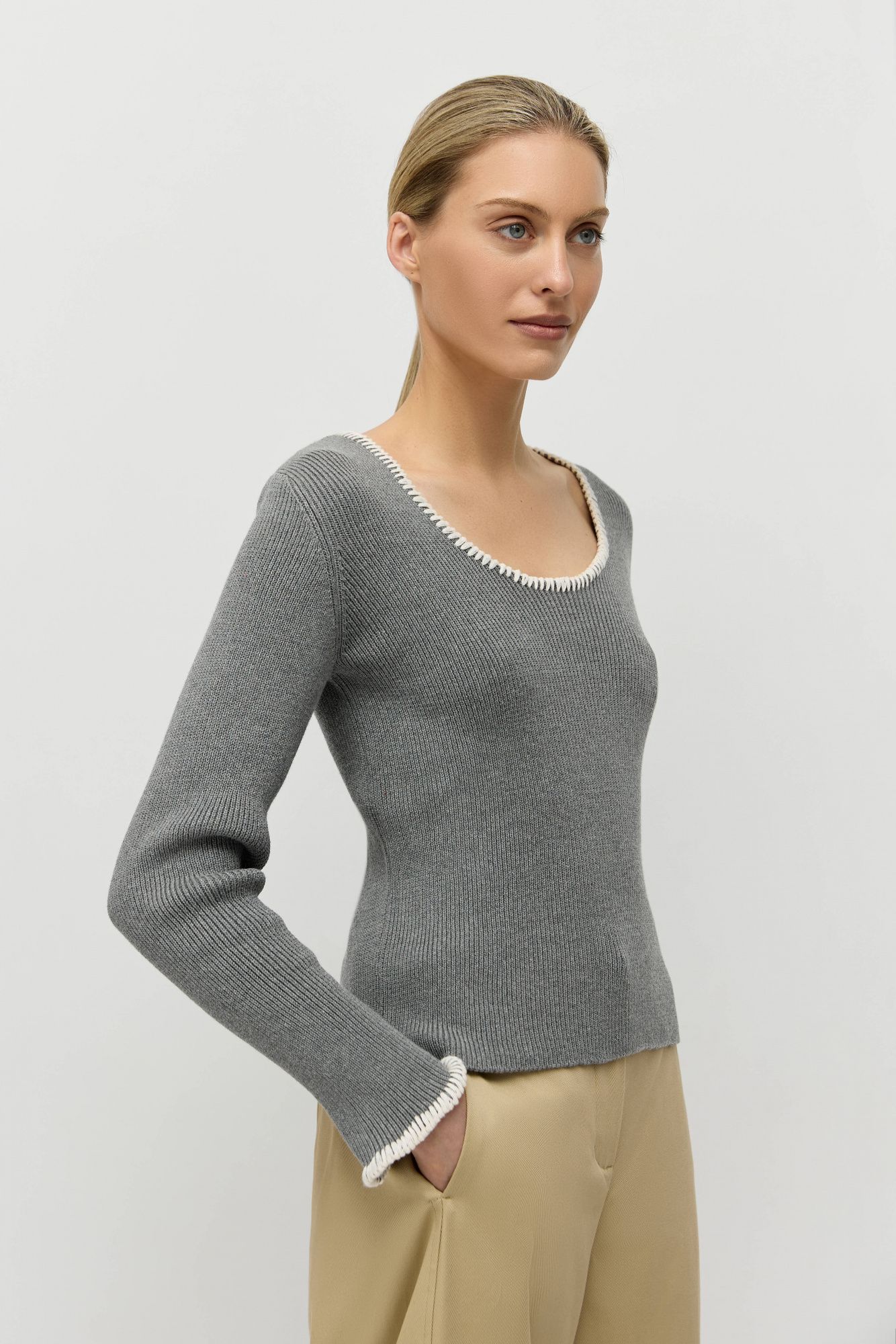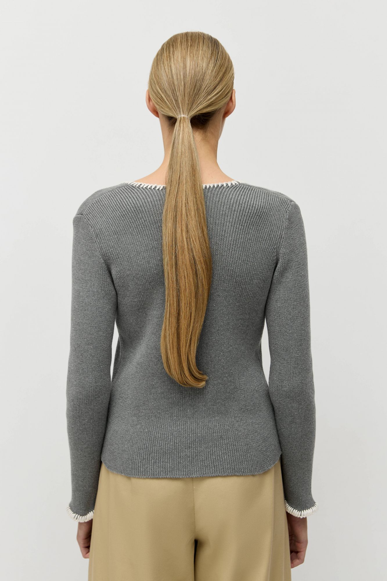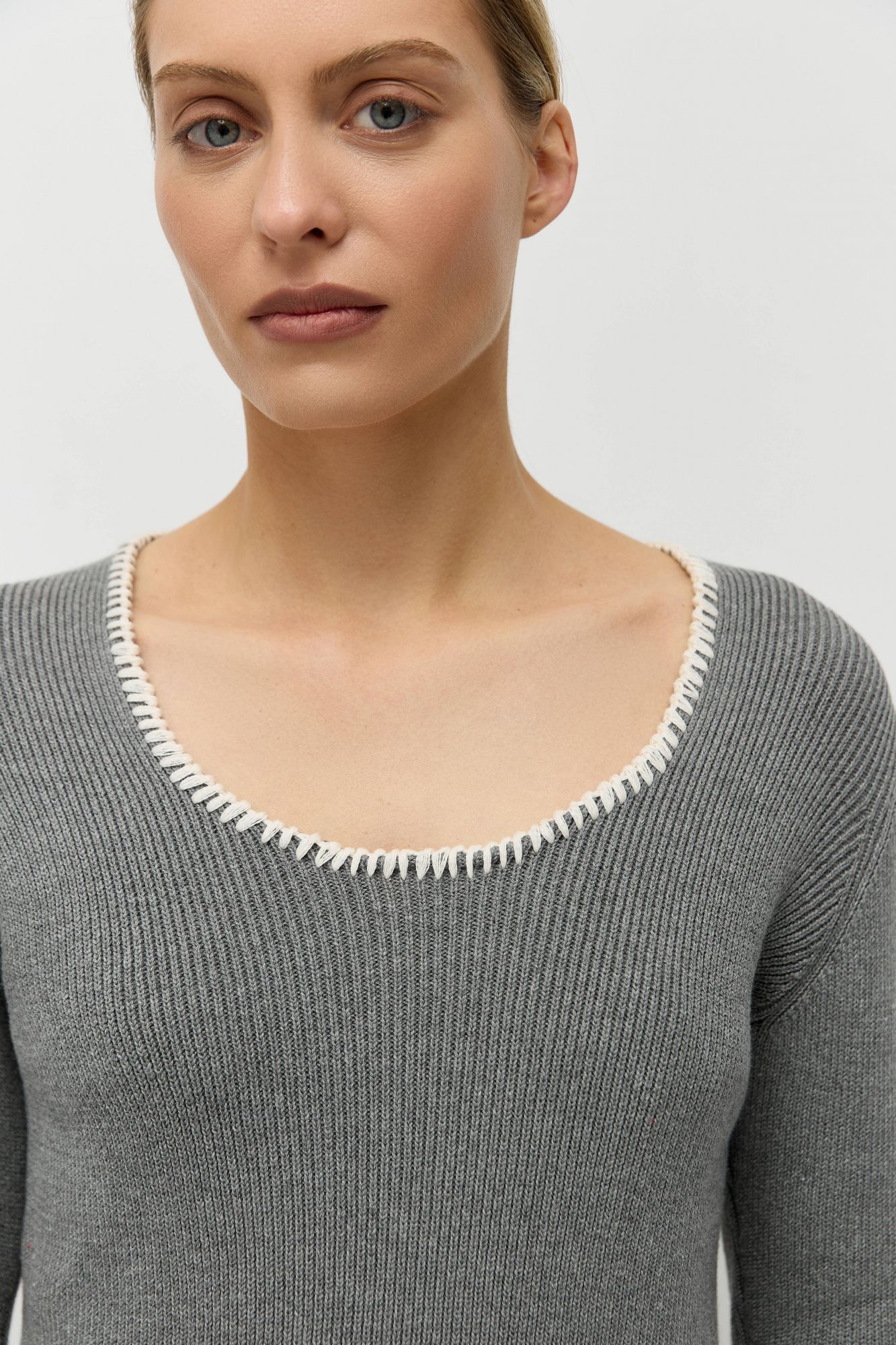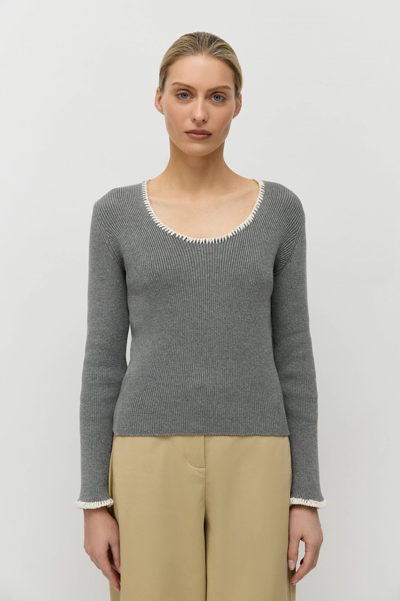 Джемпер прямого кроя связан в мелкий рубчик из натурального хлопка с легкой примесью акрила для стабильности и долговечности.
