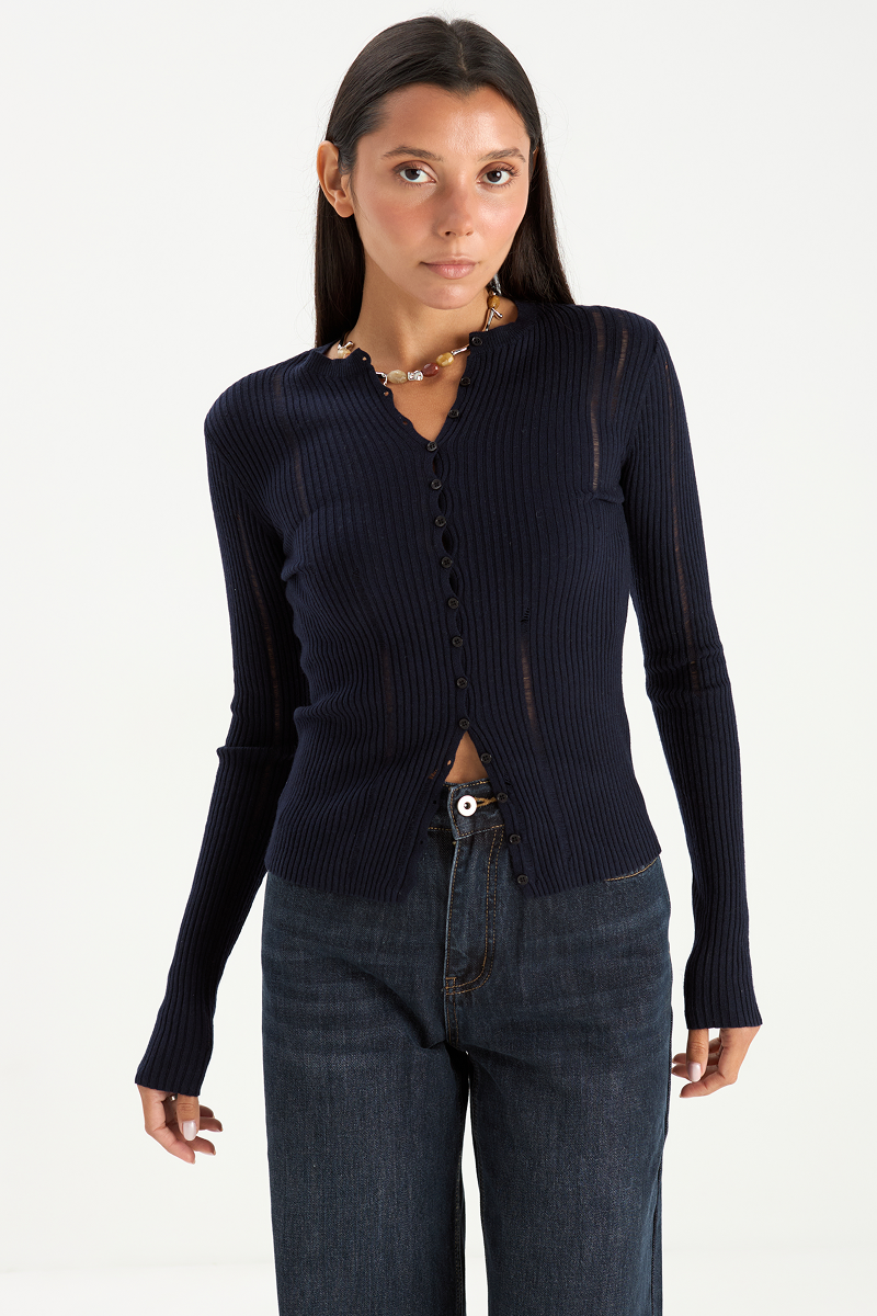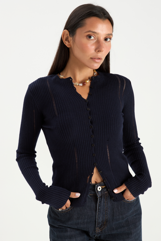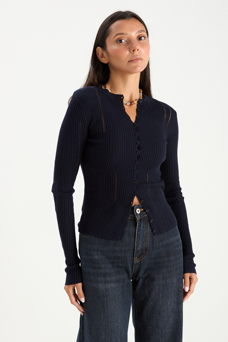 Кардиган имеет приталенный силуэт, который позволяет подчеркнуть фигуру. Пуговицы придают кардигану изящный вид и лёгкость.