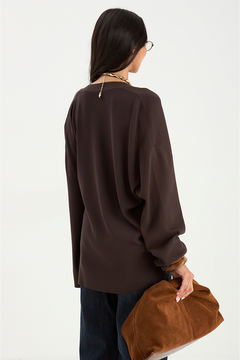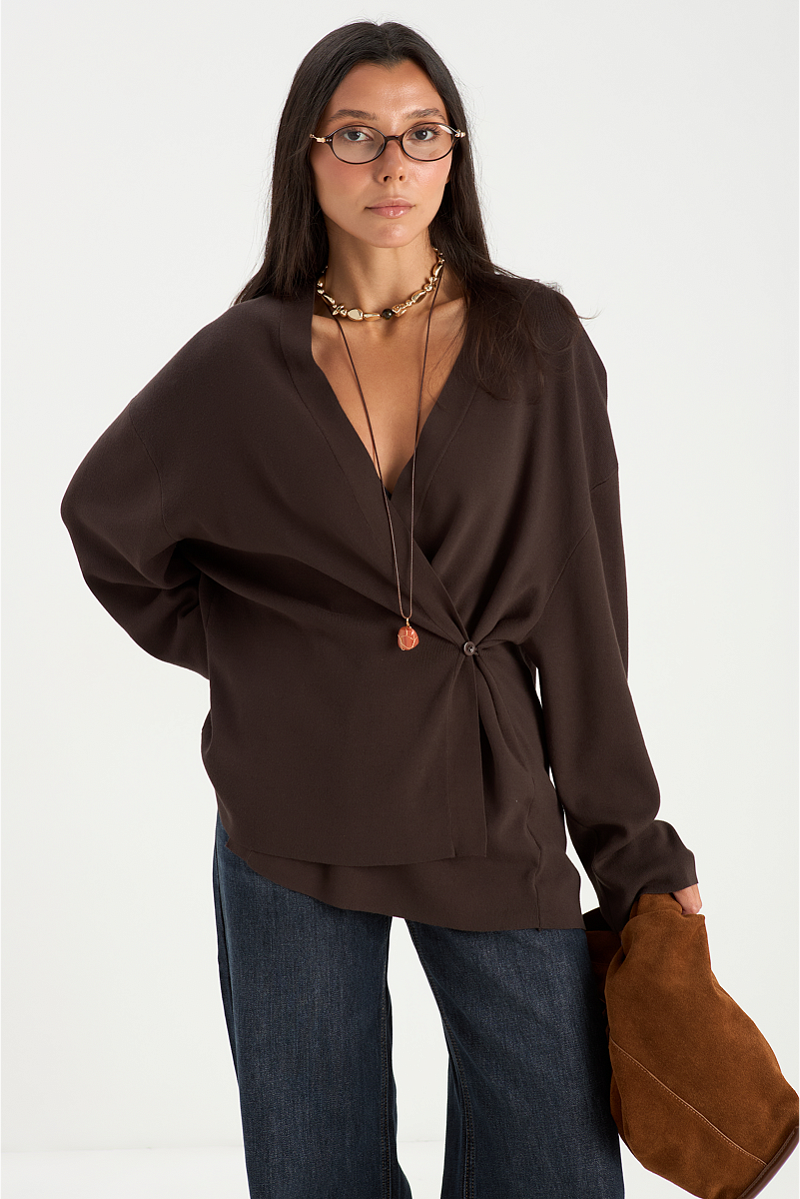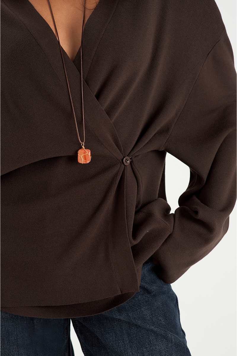 Шоколадный цвет кардигана придаёт образу теплоту и элегантность. Он легко сочетается с различными элементами одежды — от классических брюк до джинсов и юбок. Вы можете создать как повседневный, так и более изысканный образ, добавив аксессуары и подходящую обувь.