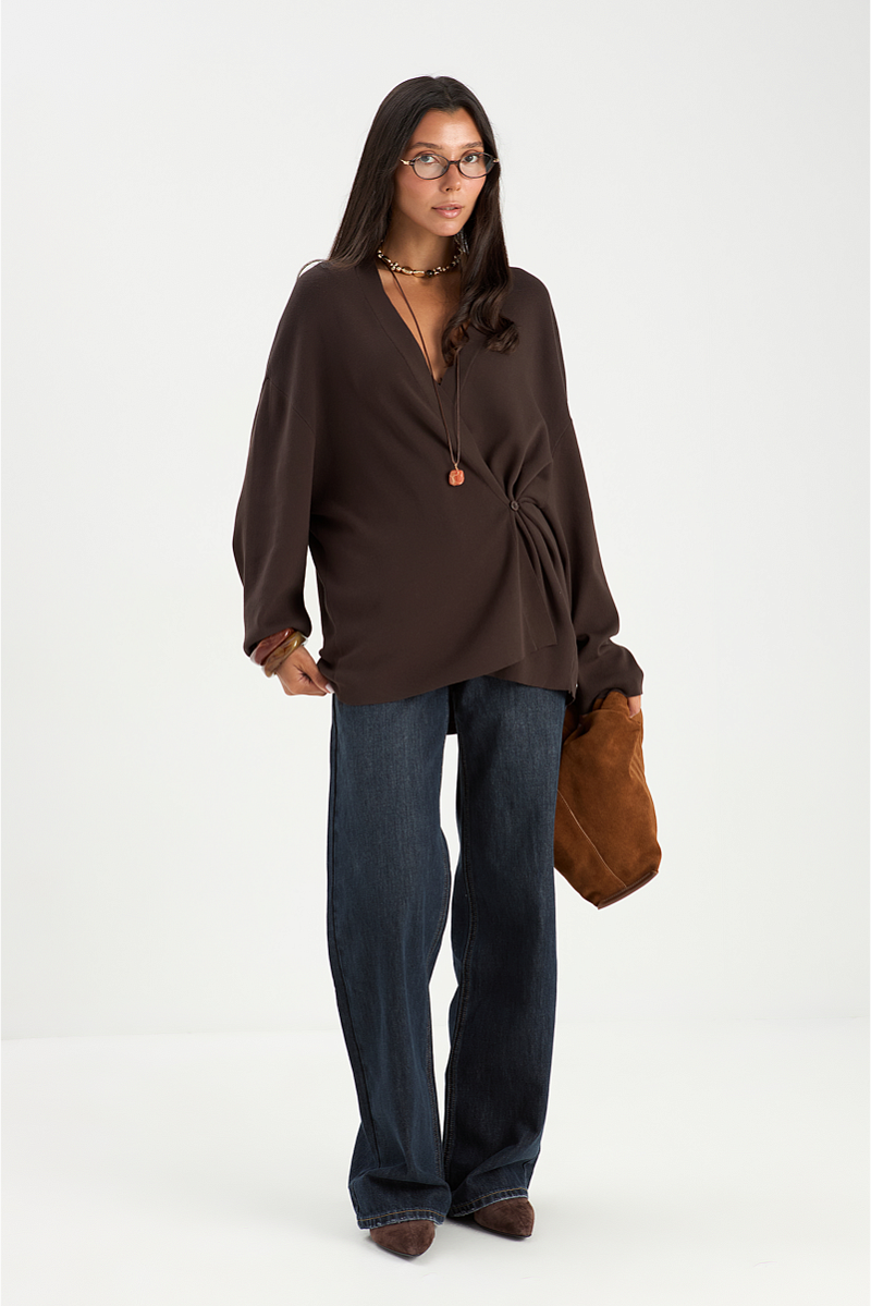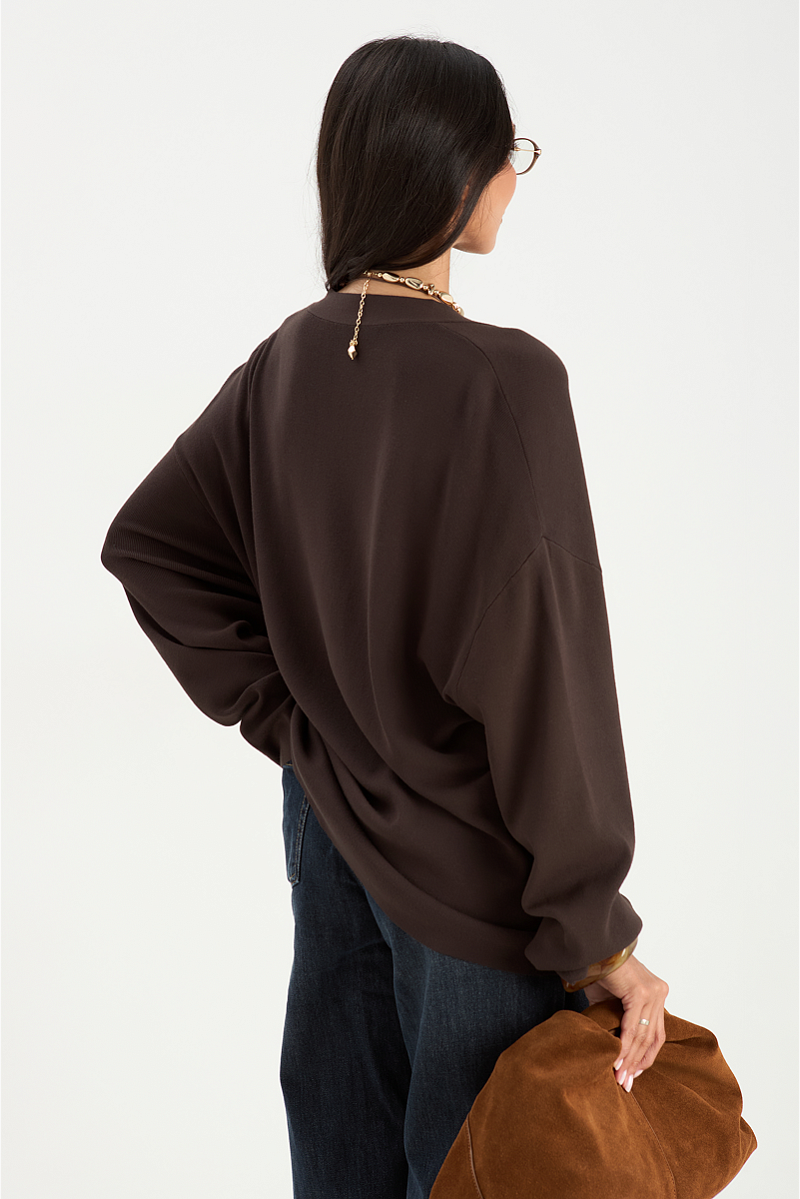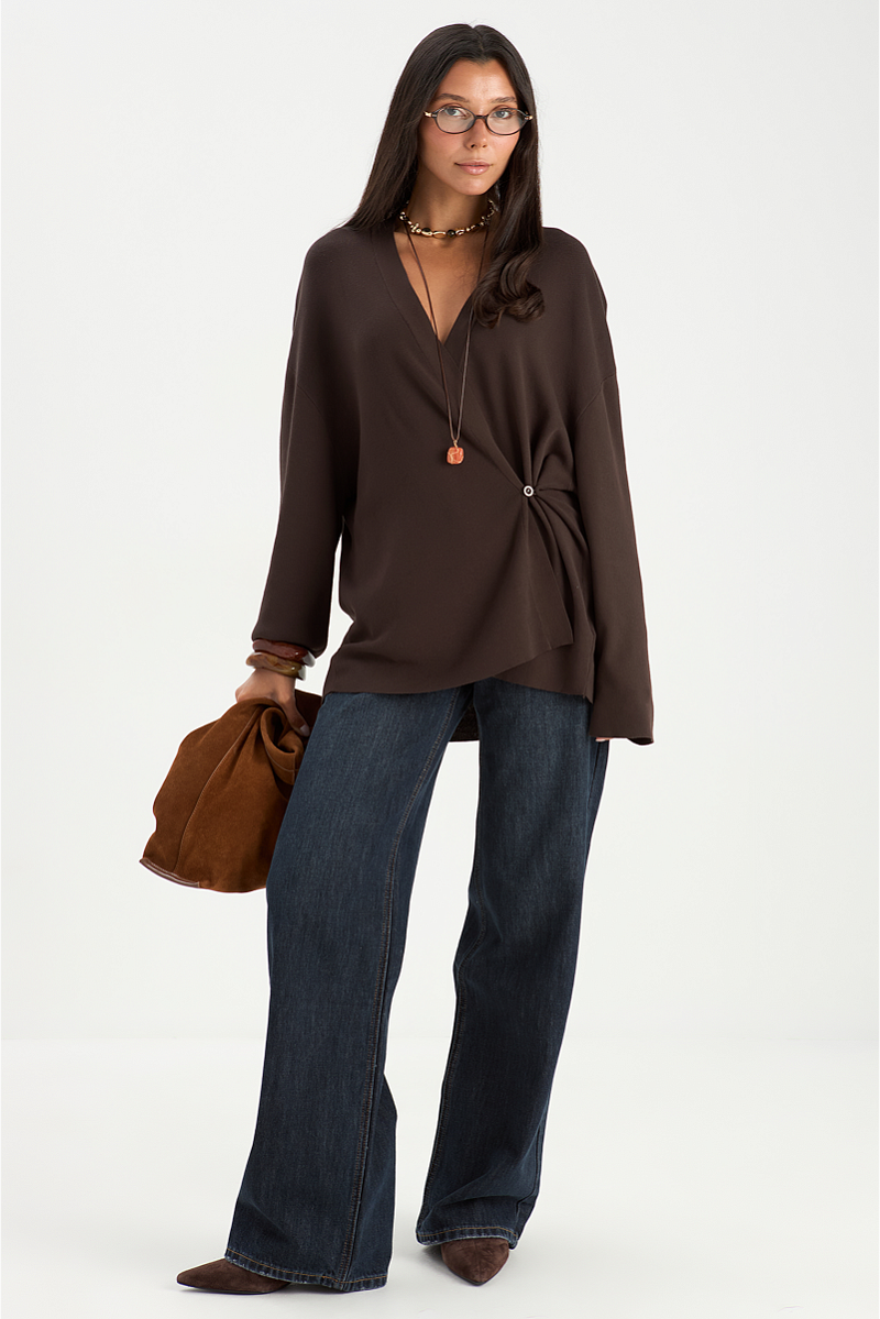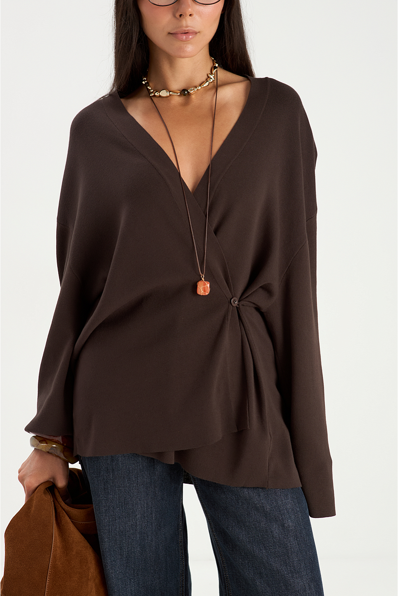 Шоколадный цвет кардигана придаёт образу теплоту и элегантность. Он легко сочетается с различными элементами одежды — от классических брюк до джинсов и юбок. Вы можете создать как повседневный, так и более изысканный образ, добавив аксессуары и подходящую обувь.
