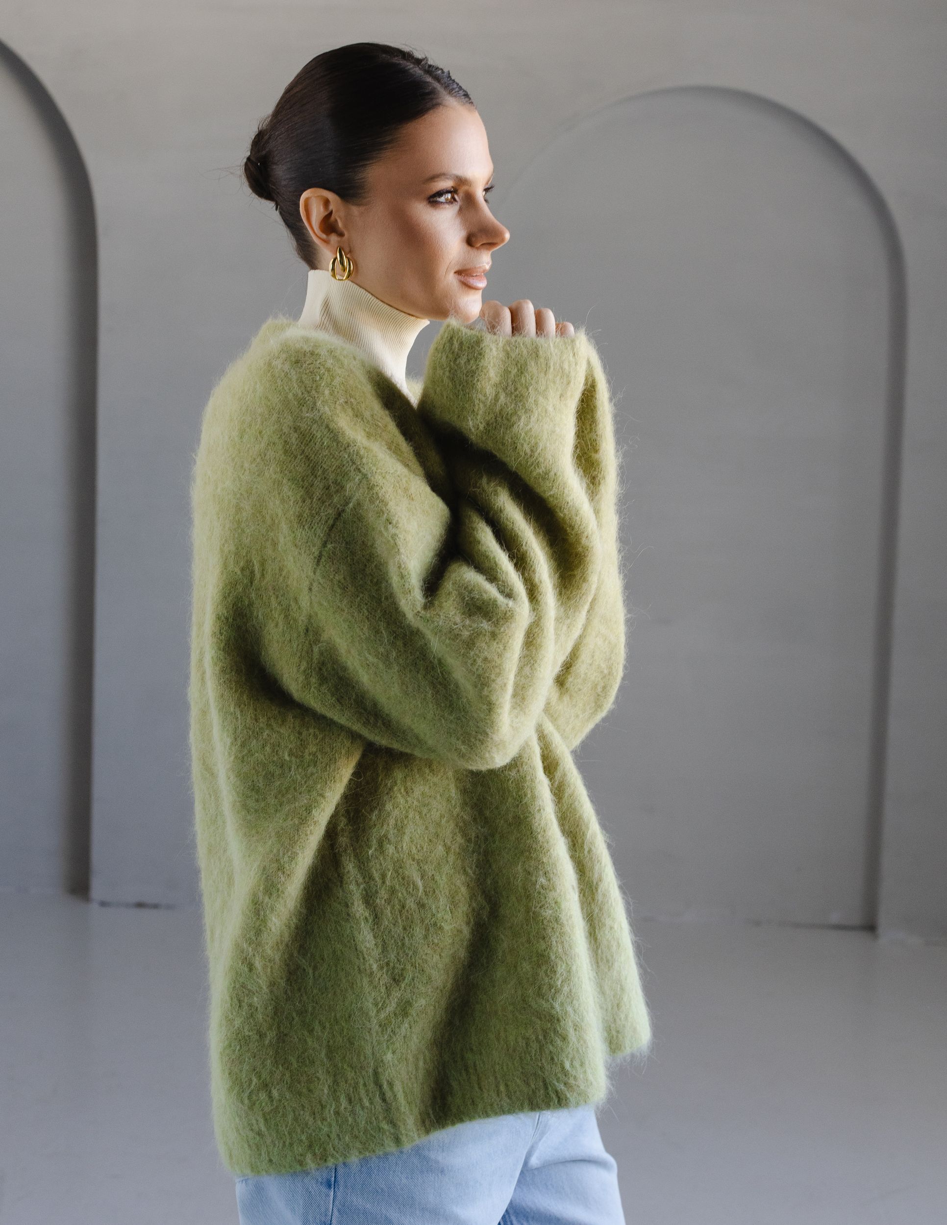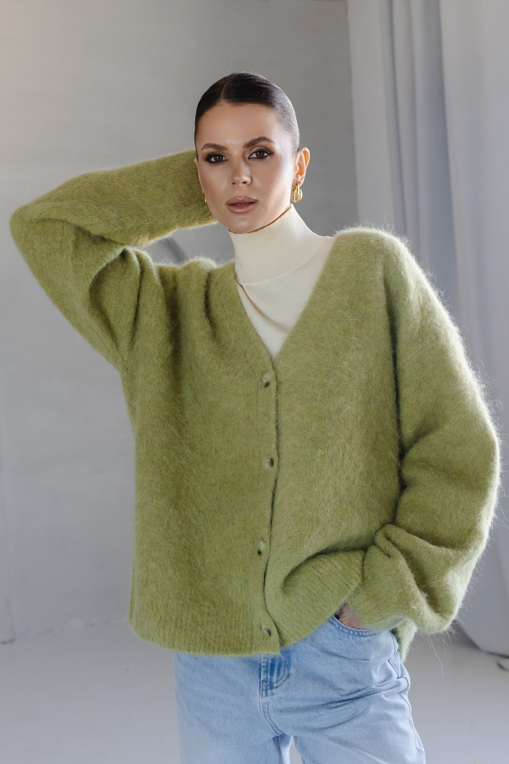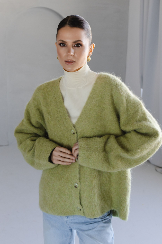 Кардиган из пушистой пряжи на основе шерсти альпаки - наш бестселлер, который идеально сочетается с комбинациями, шелковыми костюмами, джинсами и футболками.