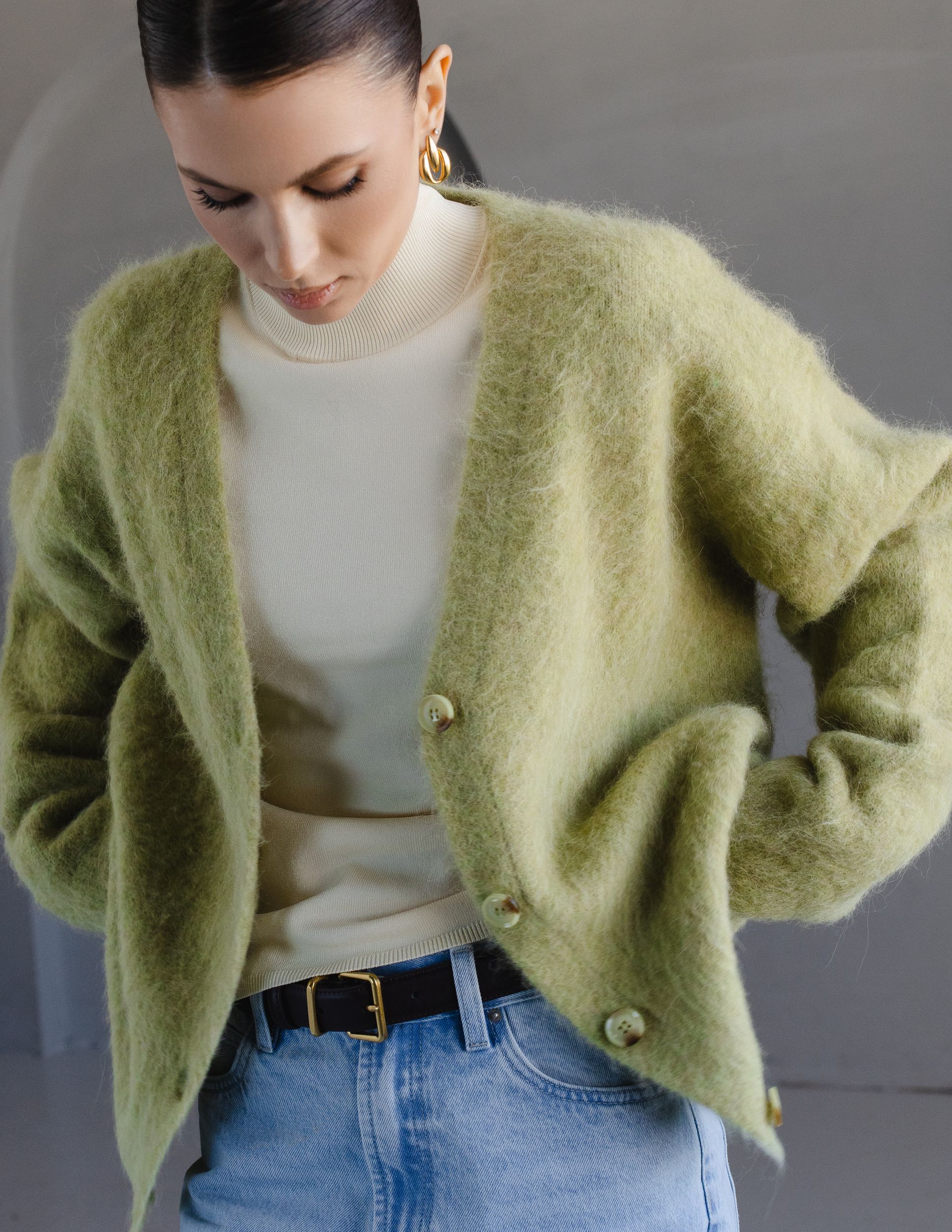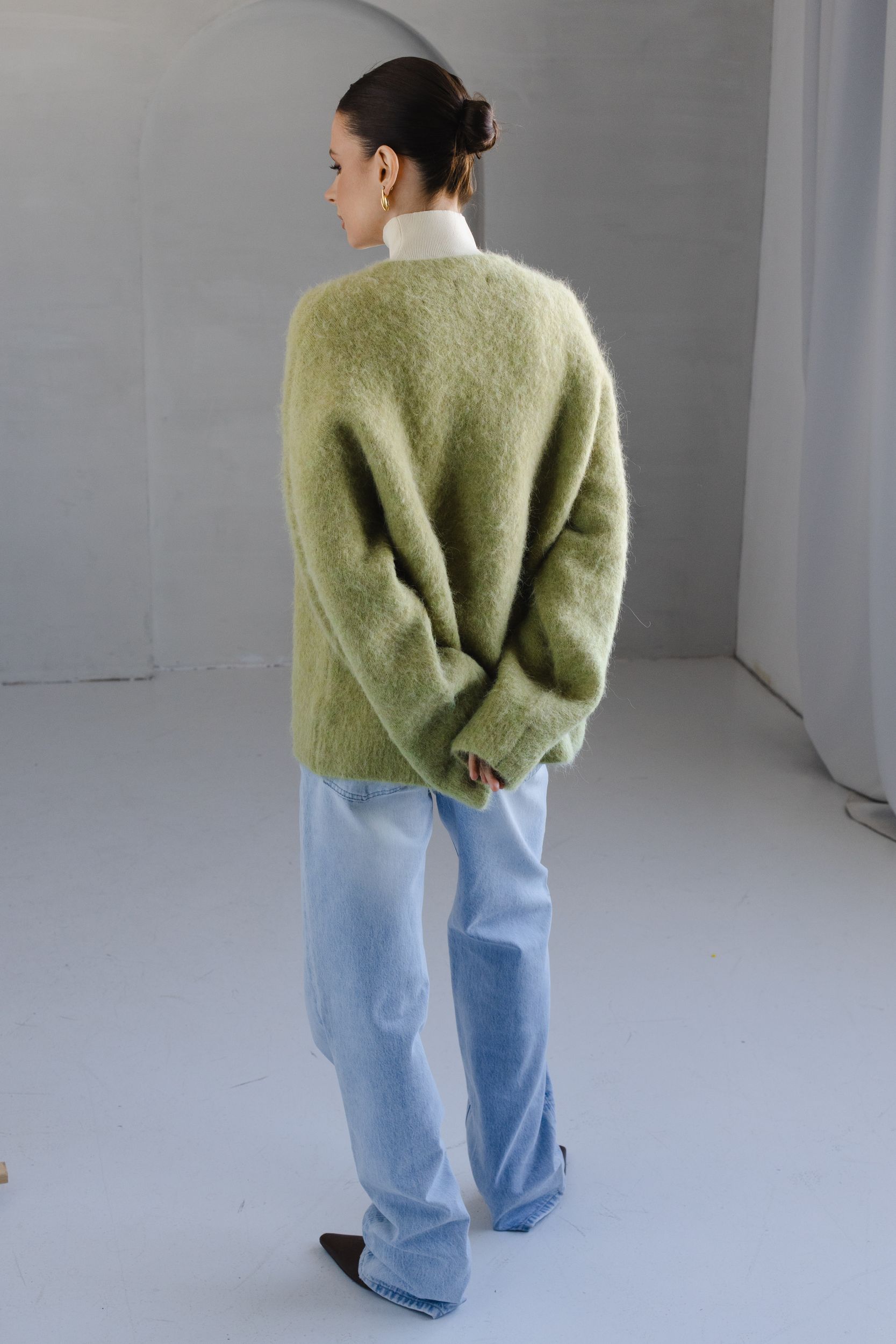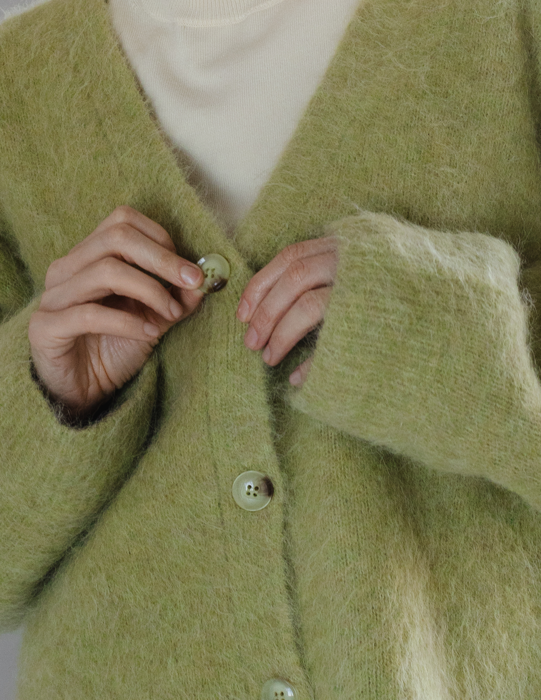 Кардиган из пушистой пряжи на основе шерсти альпаки - наш бестселлер, который идеально сочетается с комбинациями, шелковыми костюмами, джинсами и футболками.