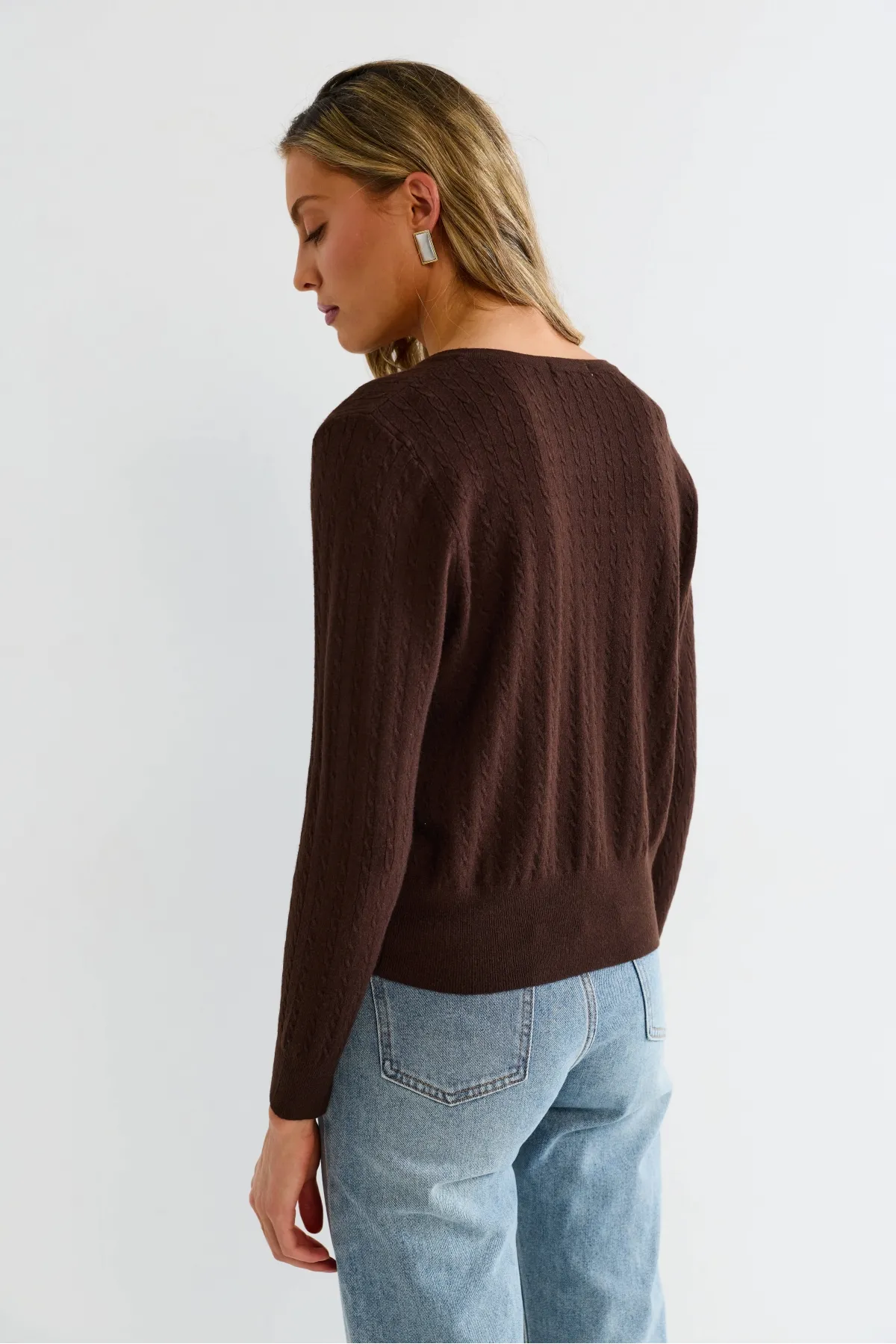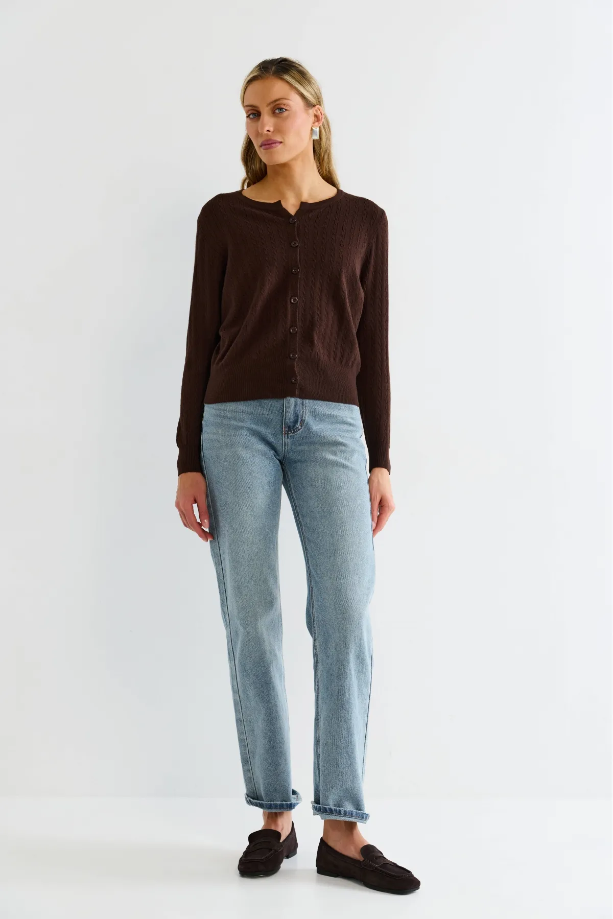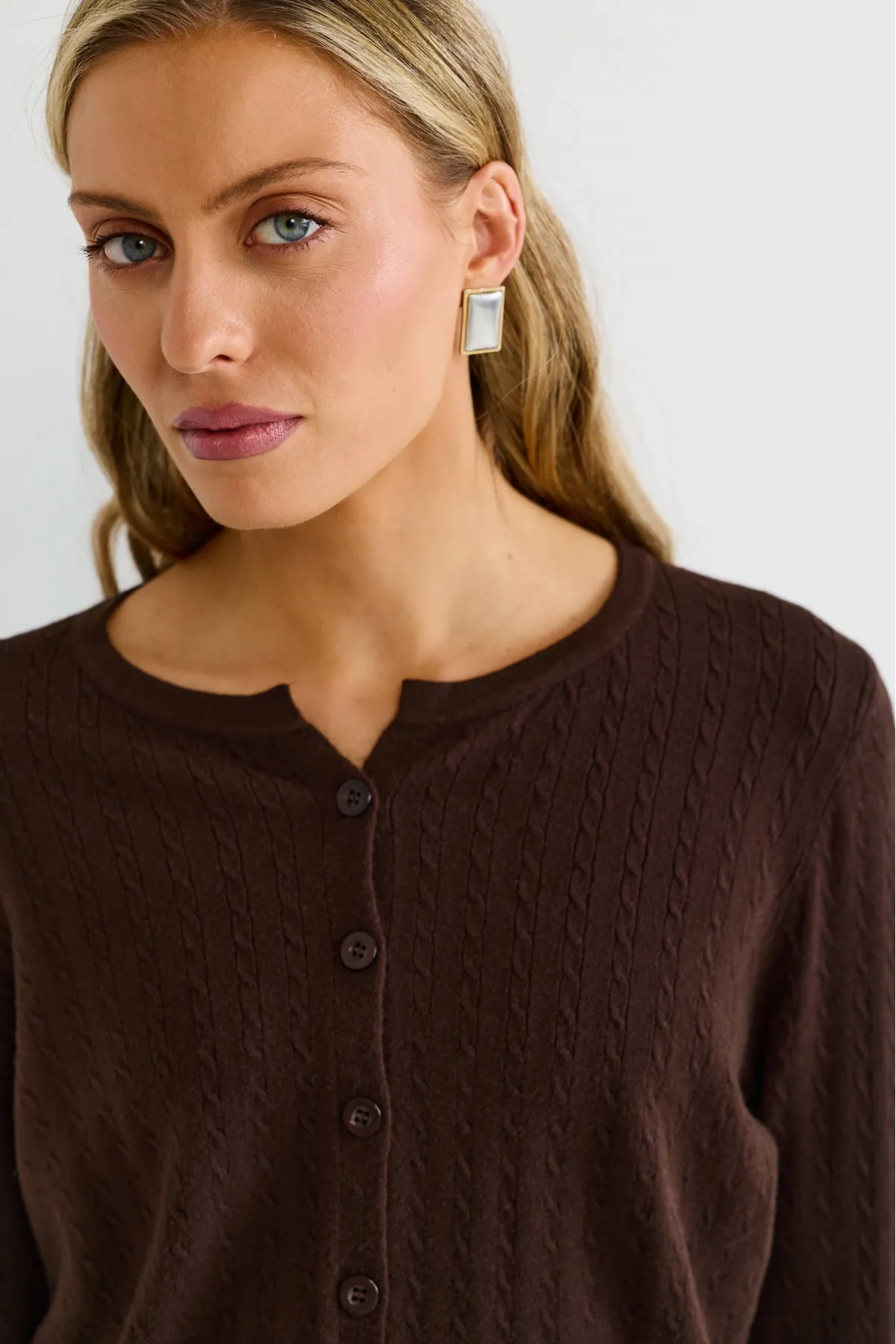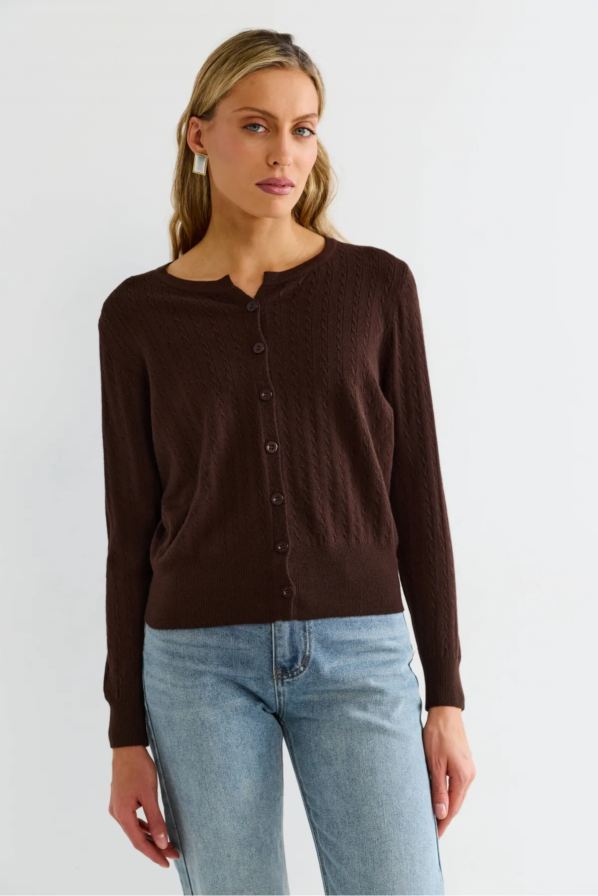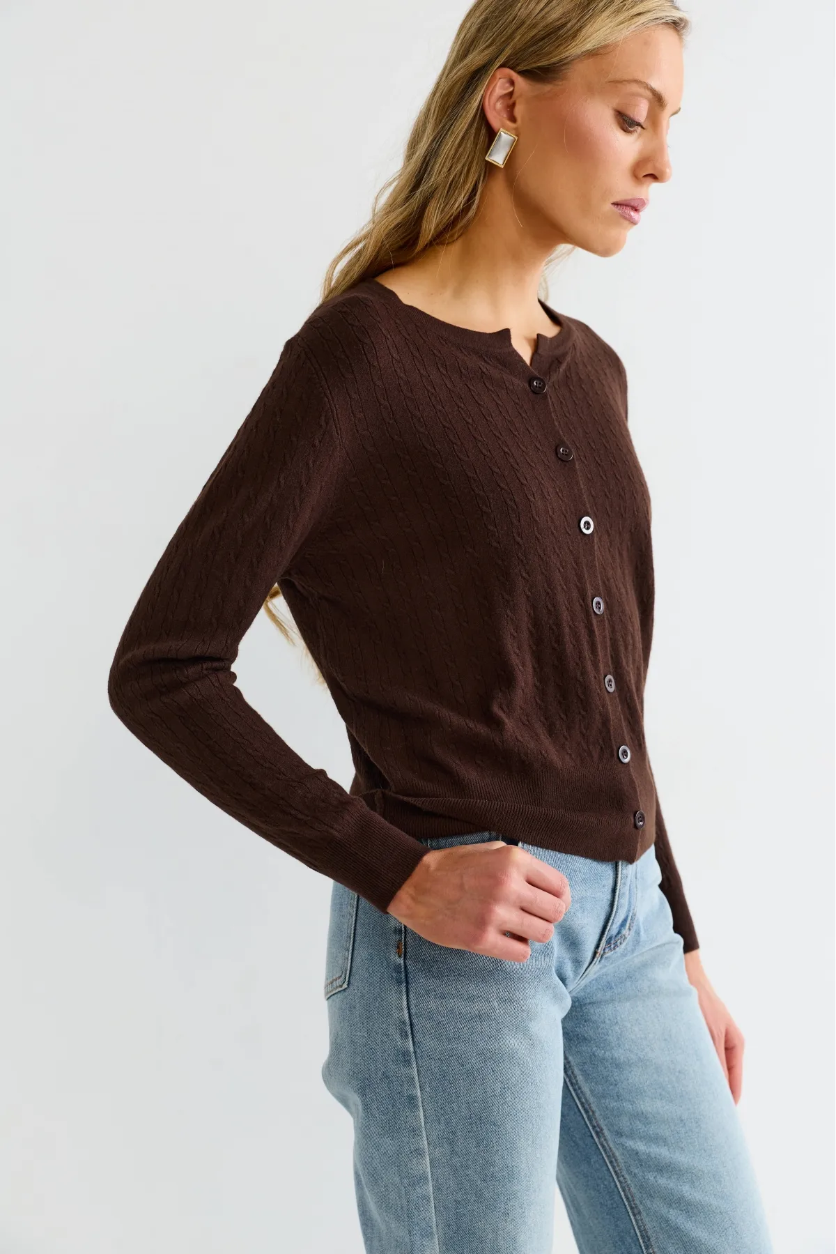 Тонкий кардиган с классической вязкой «косичка». Силуэт по фигуре аккуратно подчёркивает, а пуговицы в тон сохраняют сдержанную и элегантную эстетику. Модель визуально выделяет ключицы, делая их более изящными и добавляя образу женственности.