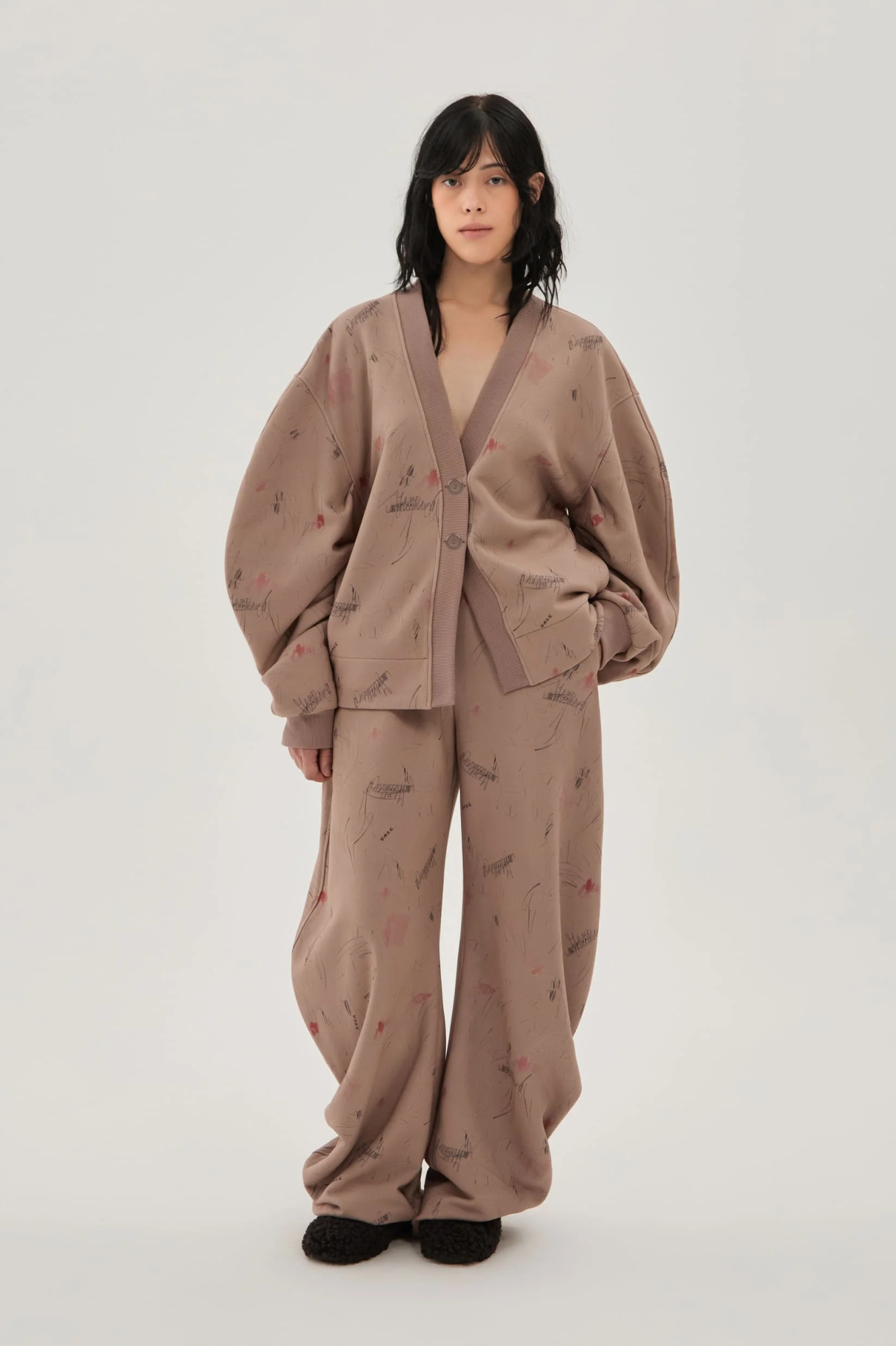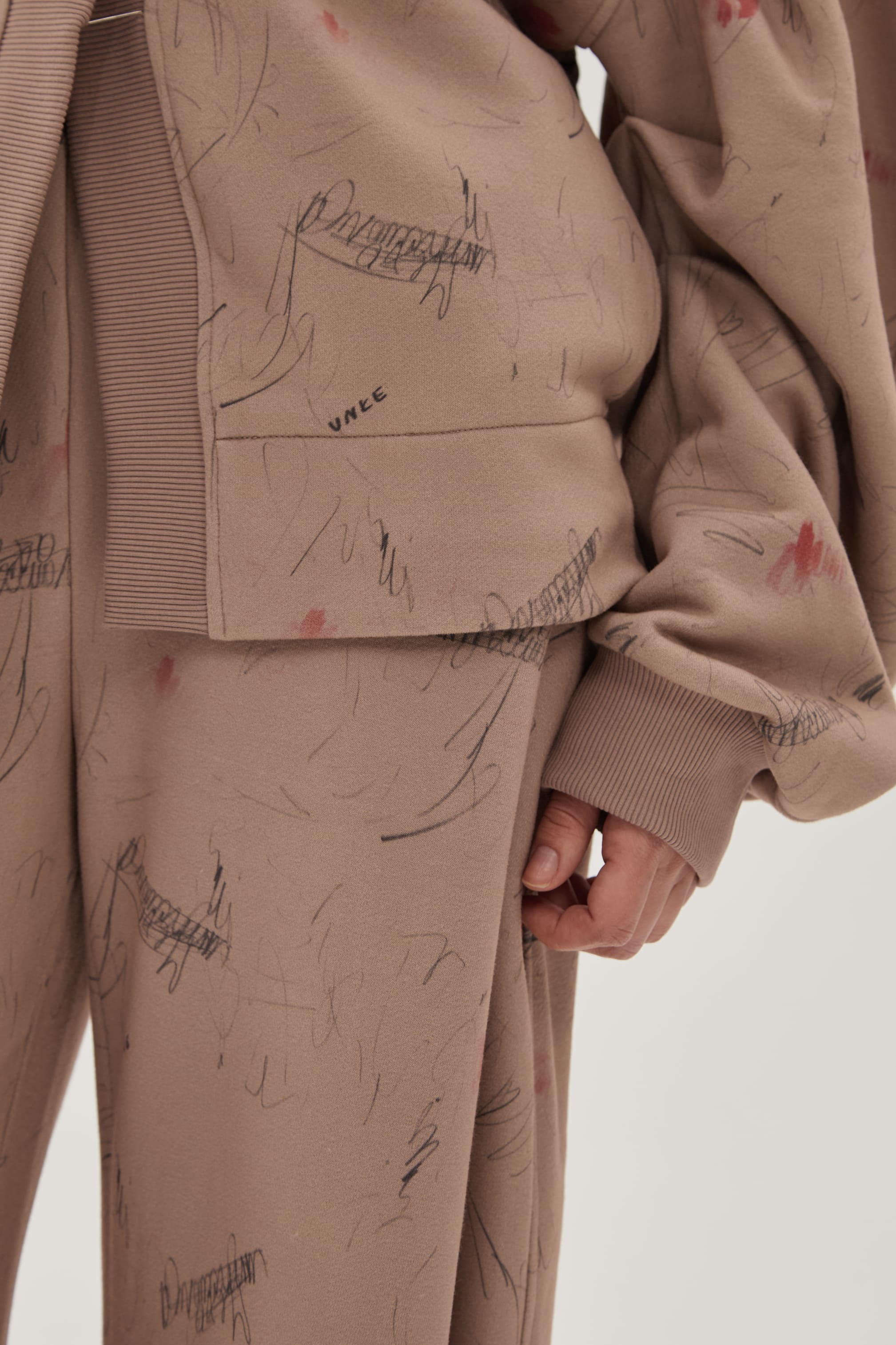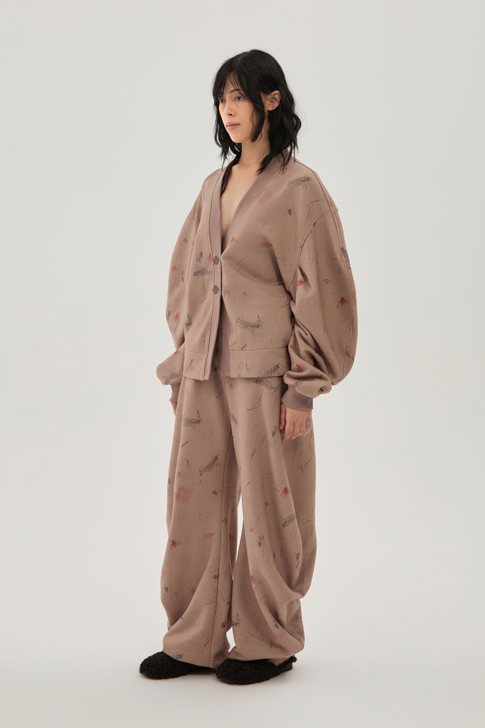 Кардиган из запринтованного в карандашные росчерки и акварельные пятна хлопкового бархатистого трикотажа с эффектом велюровой бумаги. Мягкий полуприталенный скульптурный силуэт с объемным рукавом и регулировкой на завязки сзади по талии.