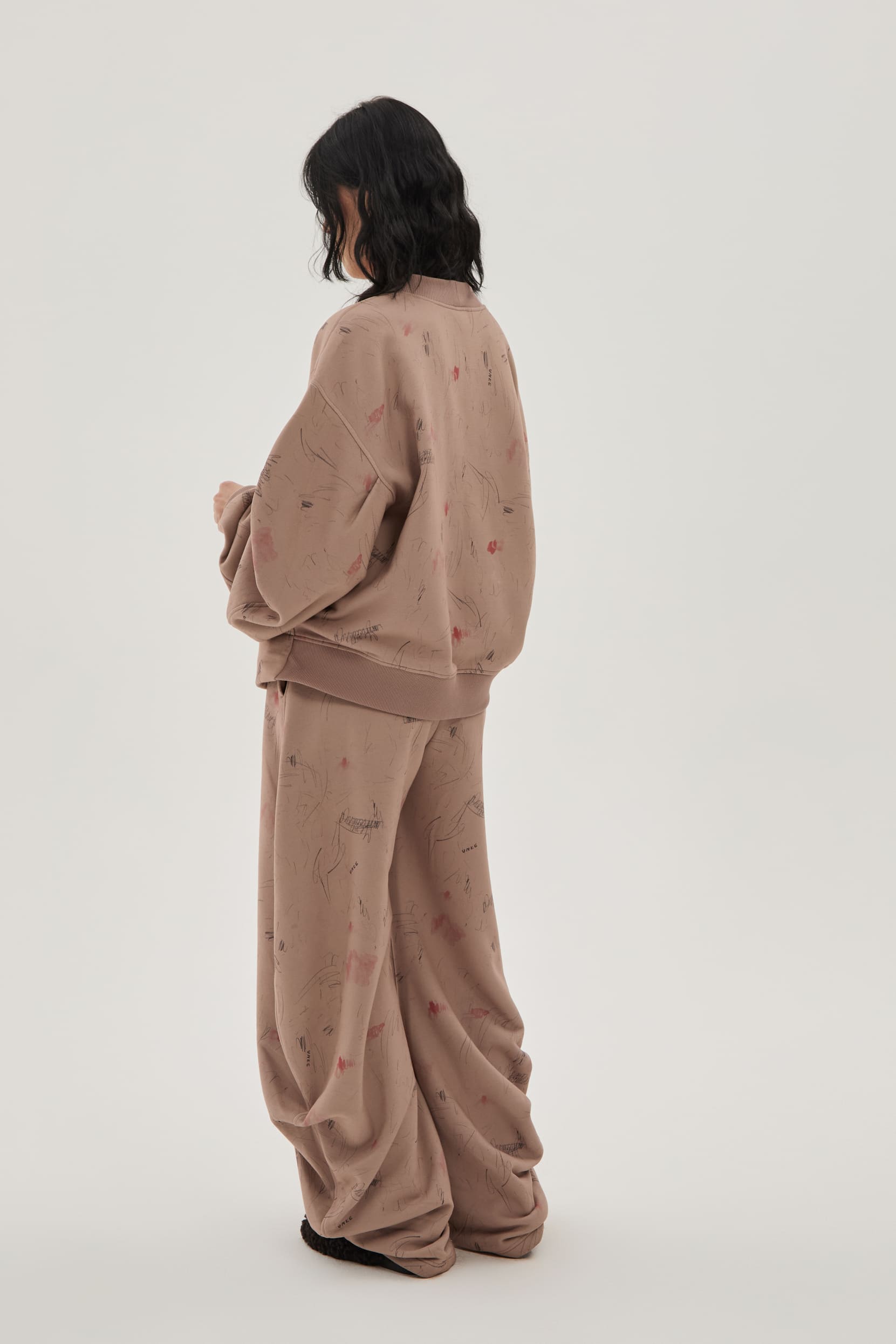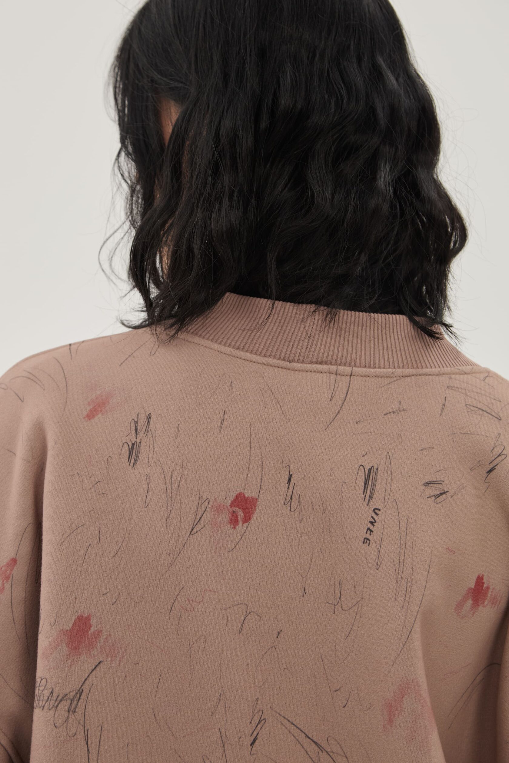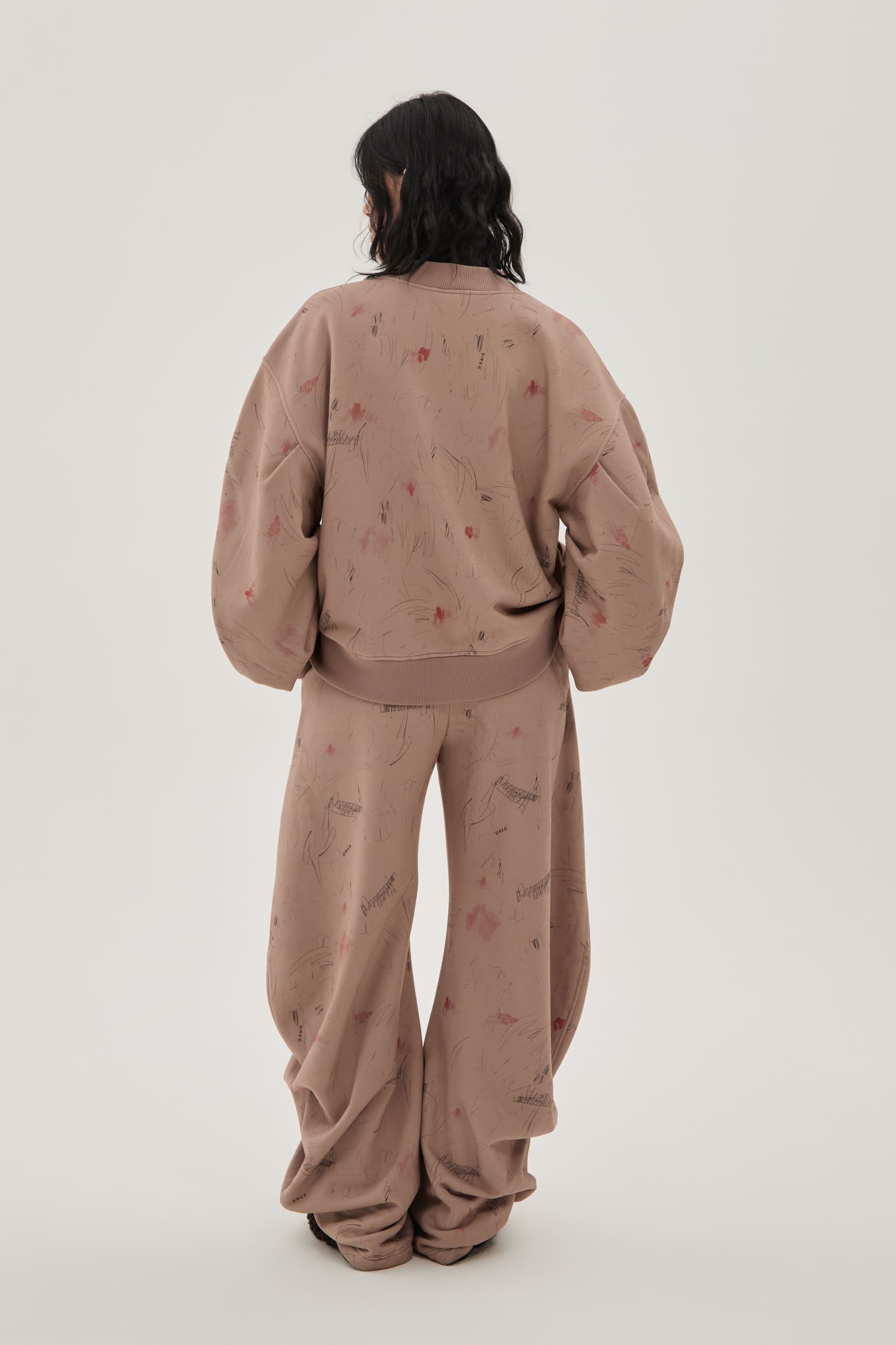 Кардиган из запринтованного в карандашные росчерки и акварельные пятна хлопкового бархатистого трикотажа с эффектом велюровой бумаги. Мягкий полуприталенный скульптурный силуэт с объемным рукавом и регулировкой на завязки сзади по талии.