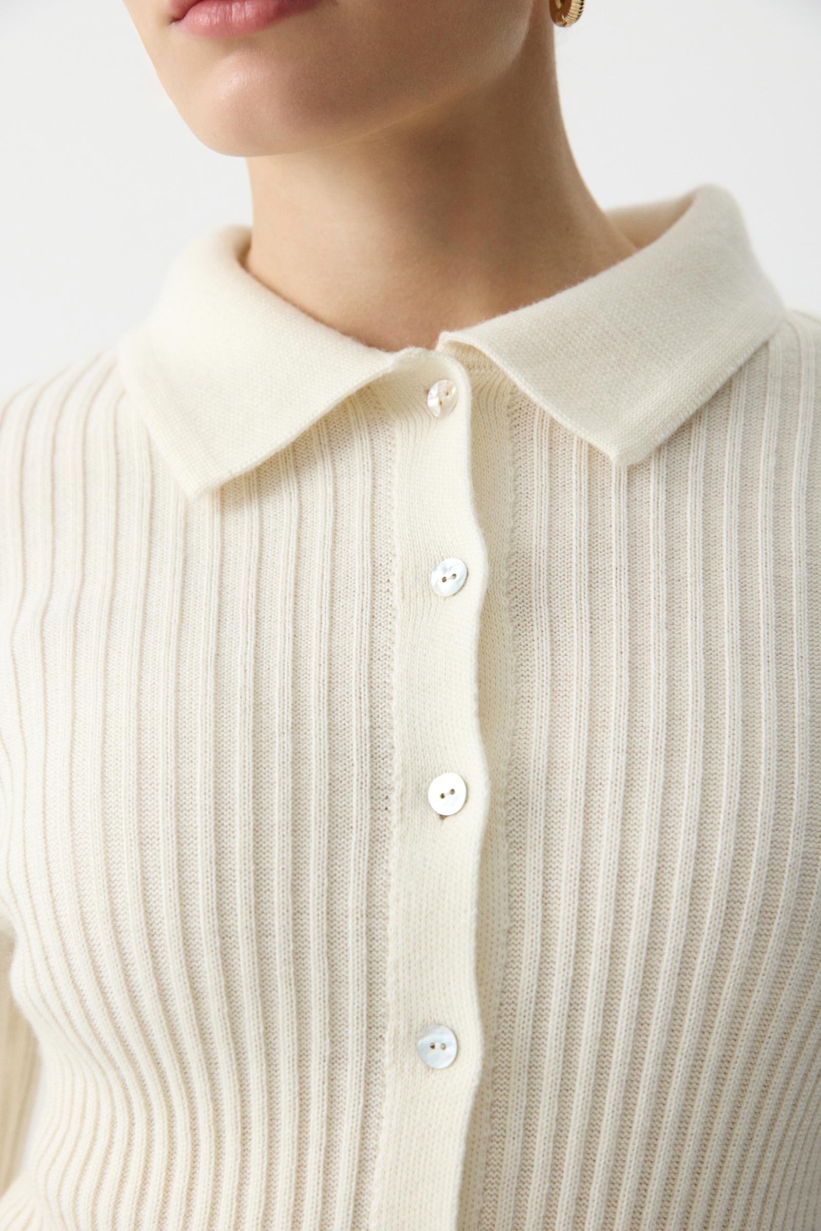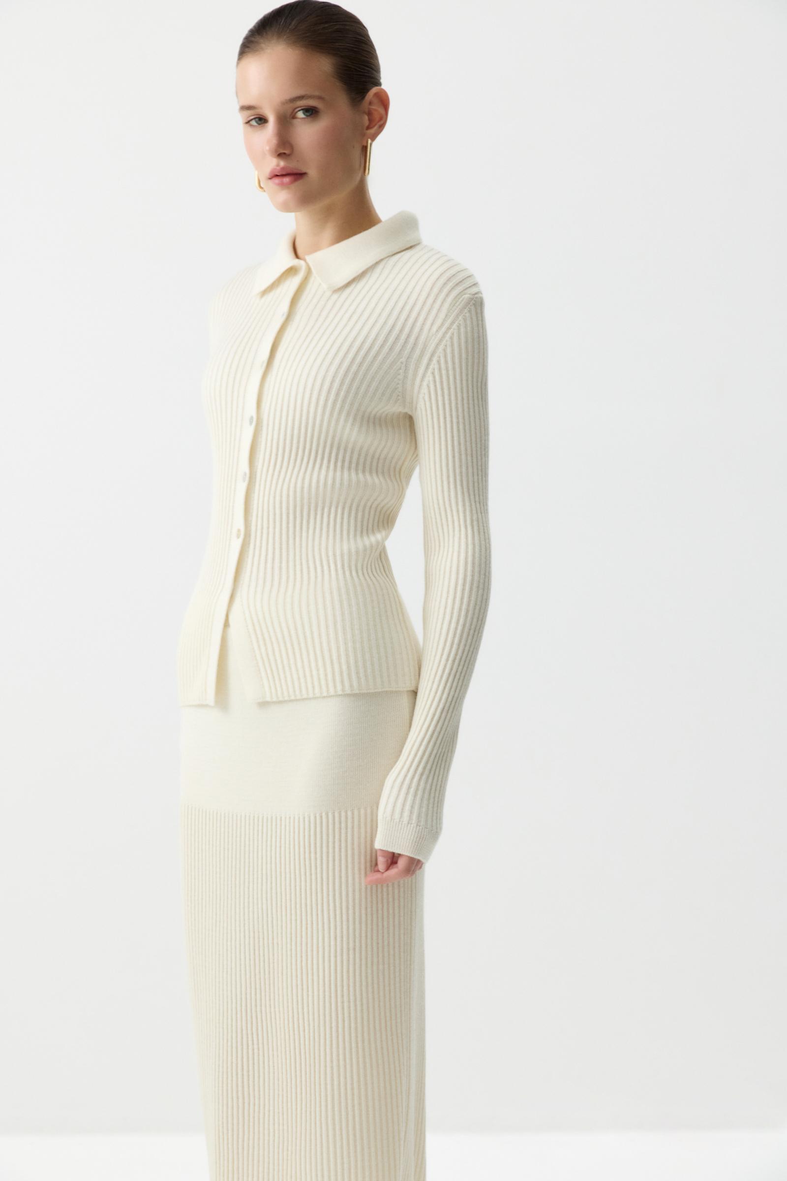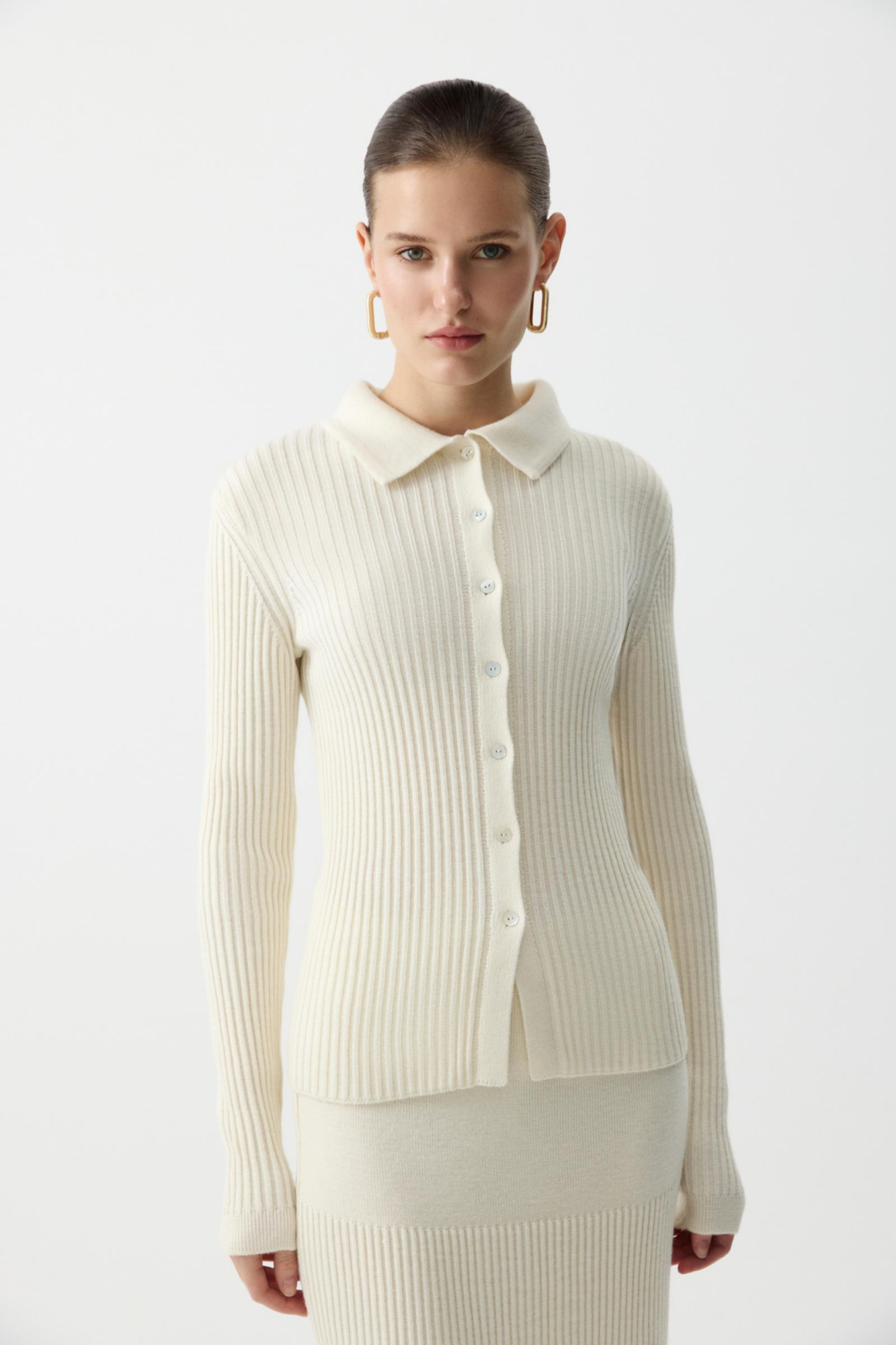 Кардиган с воротником поло с длинным рукавом. Кардиган выполнен из мягкой пряжи с шерстью мериноса в составе. Застежка на планку с пуговицами. Благодаря плотному типу вязки с вертикальными ярковыраженным артворком, кардиган подчеркивает и визуально удлиняет силуэт.
