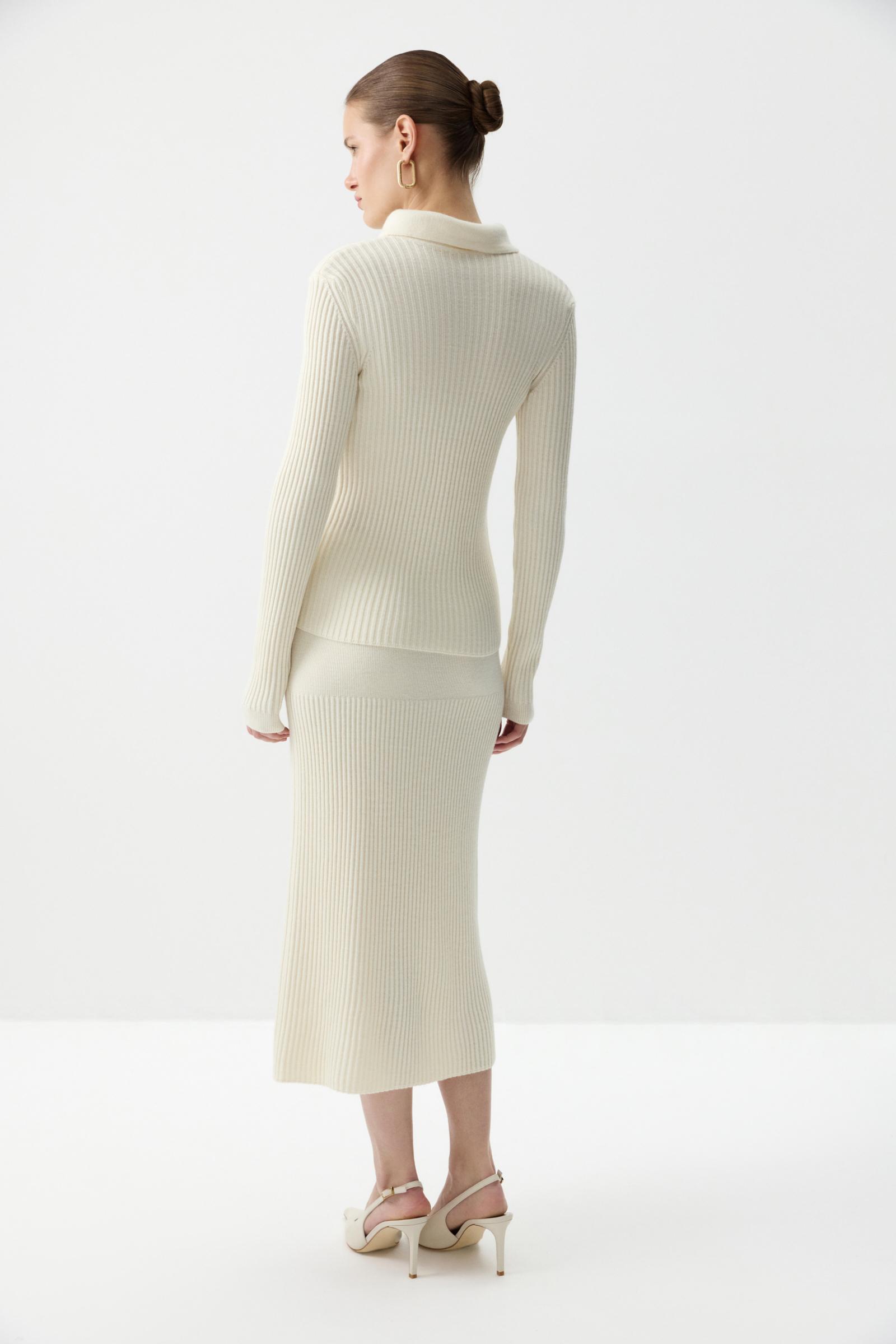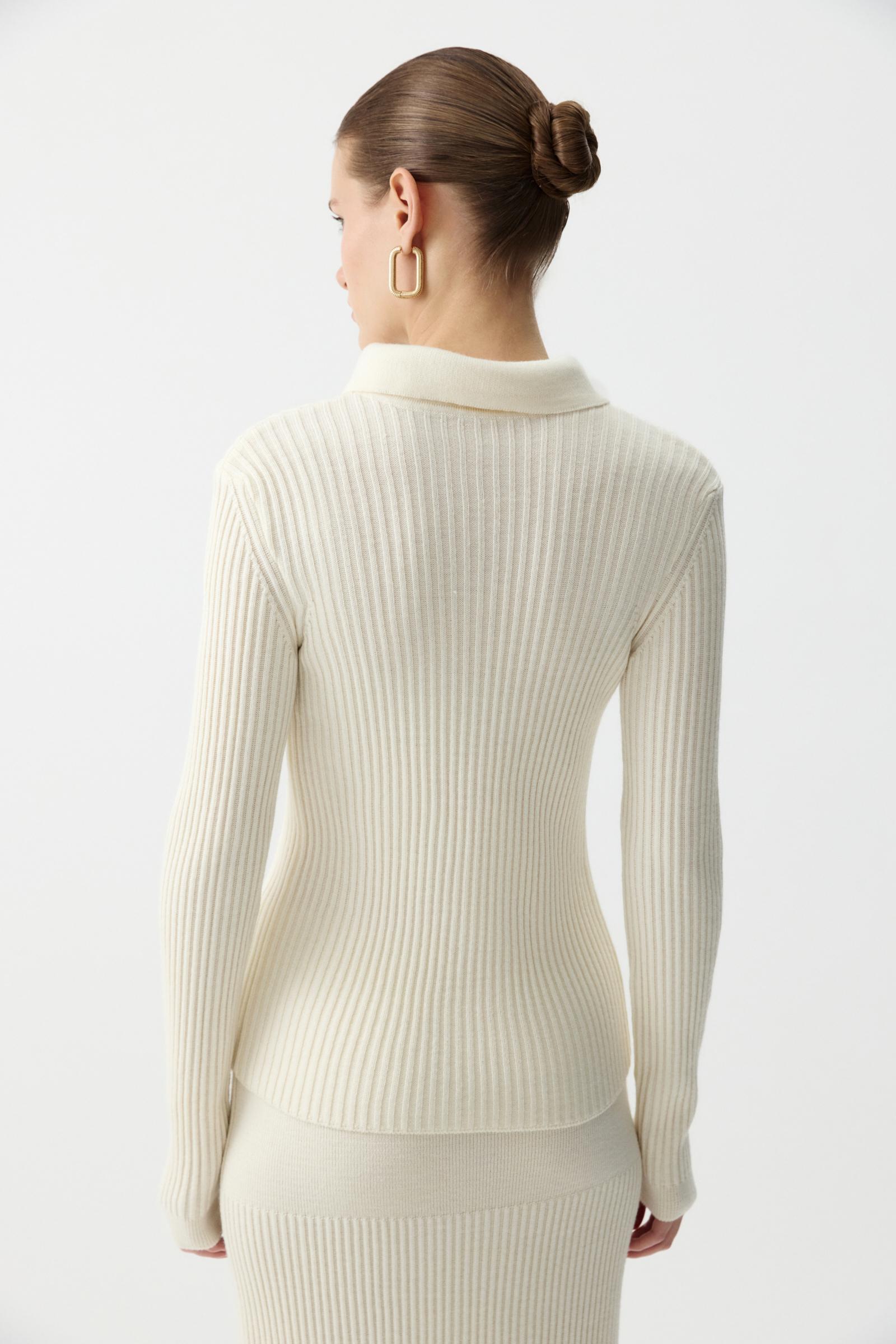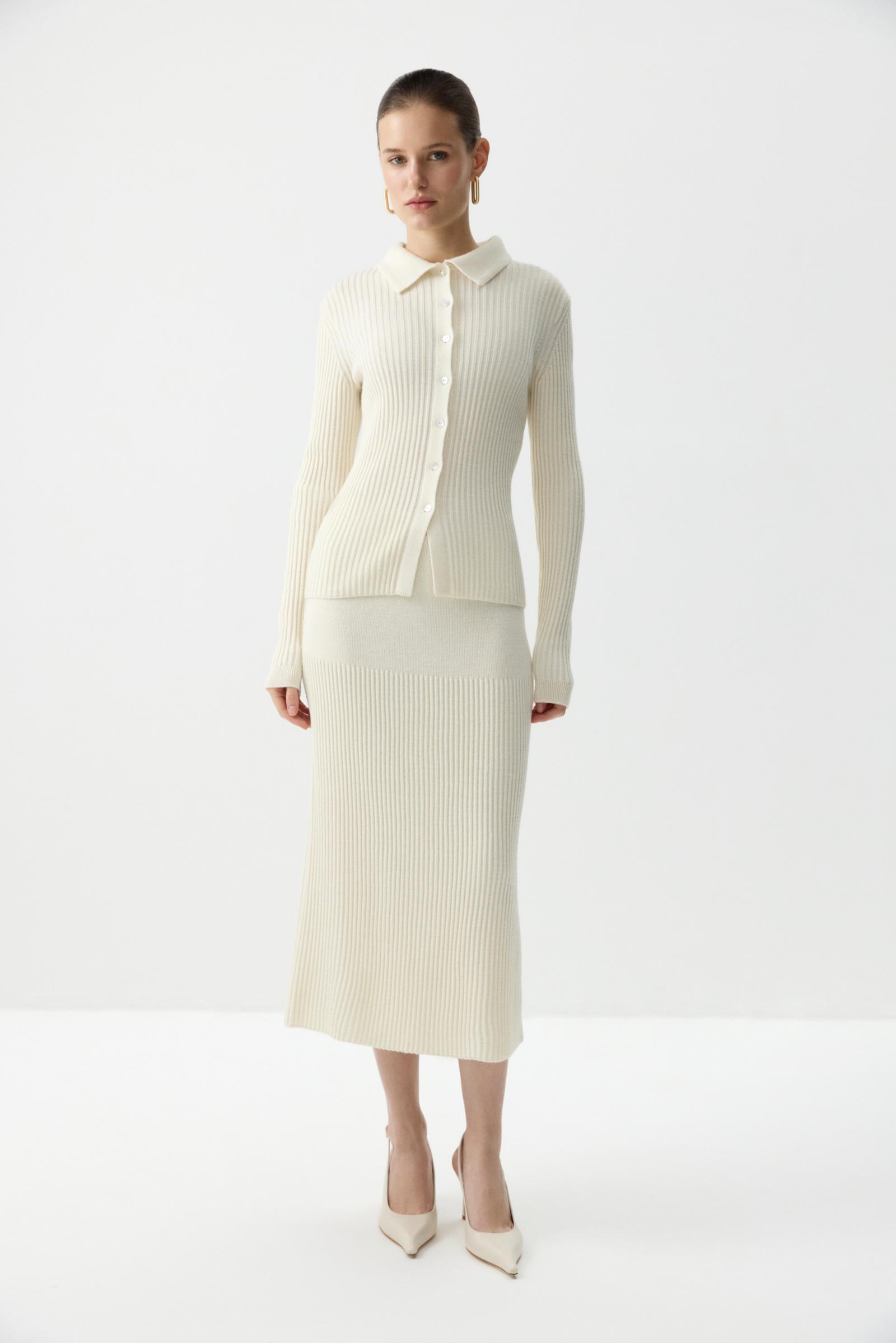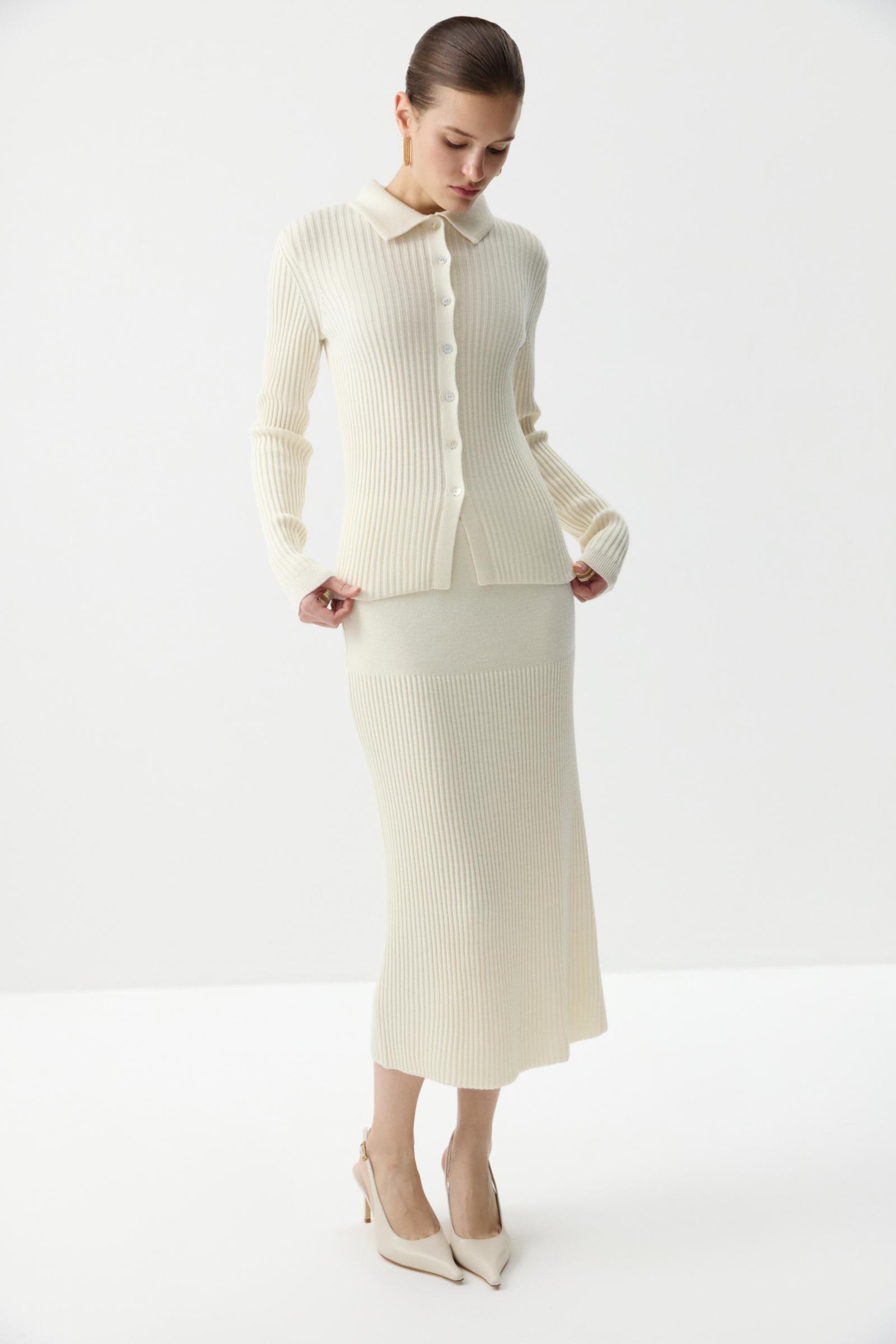 Кардиган с воротником поло с длинным рукавом. Кардиган выполнен из мягкой пряжи с шерстью мериноса в составе. Застежка на планку с пуговицами. Благодаря плотному типу вязки с вертикальными ярковыраженным артворком, кардиган подчеркивает и визуально удлиняет силуэт.
