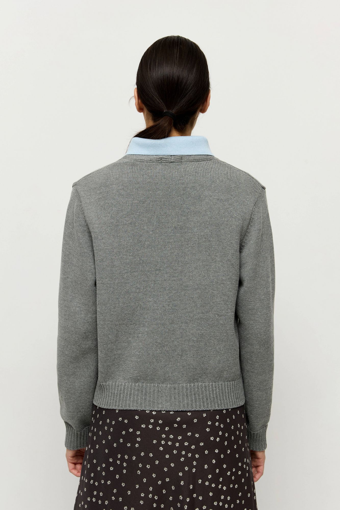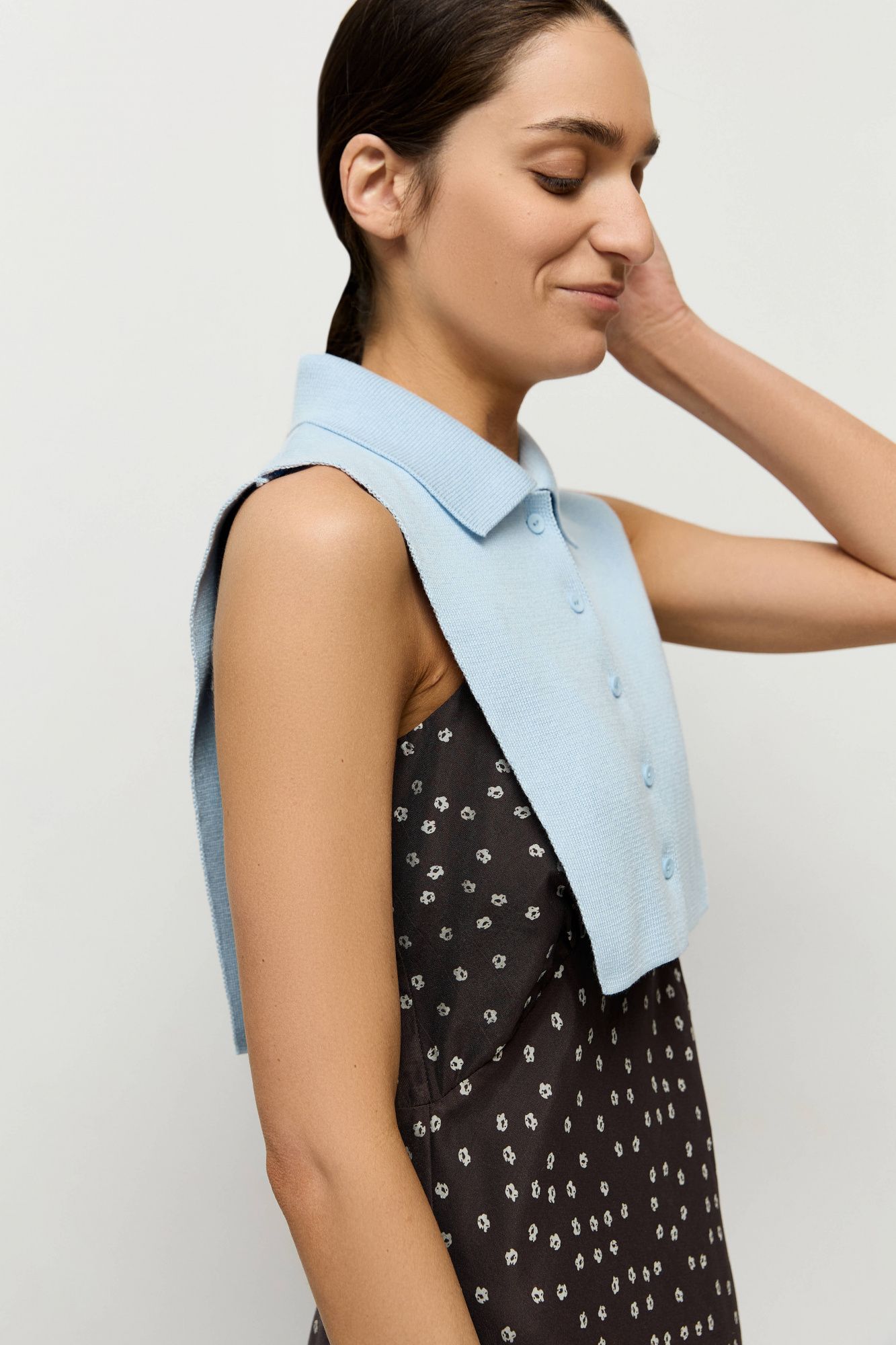 В комплект к нему предусмотрена съемная манишка, имитирующая выглядывающий воротник, которая фиксируется пуговицами.