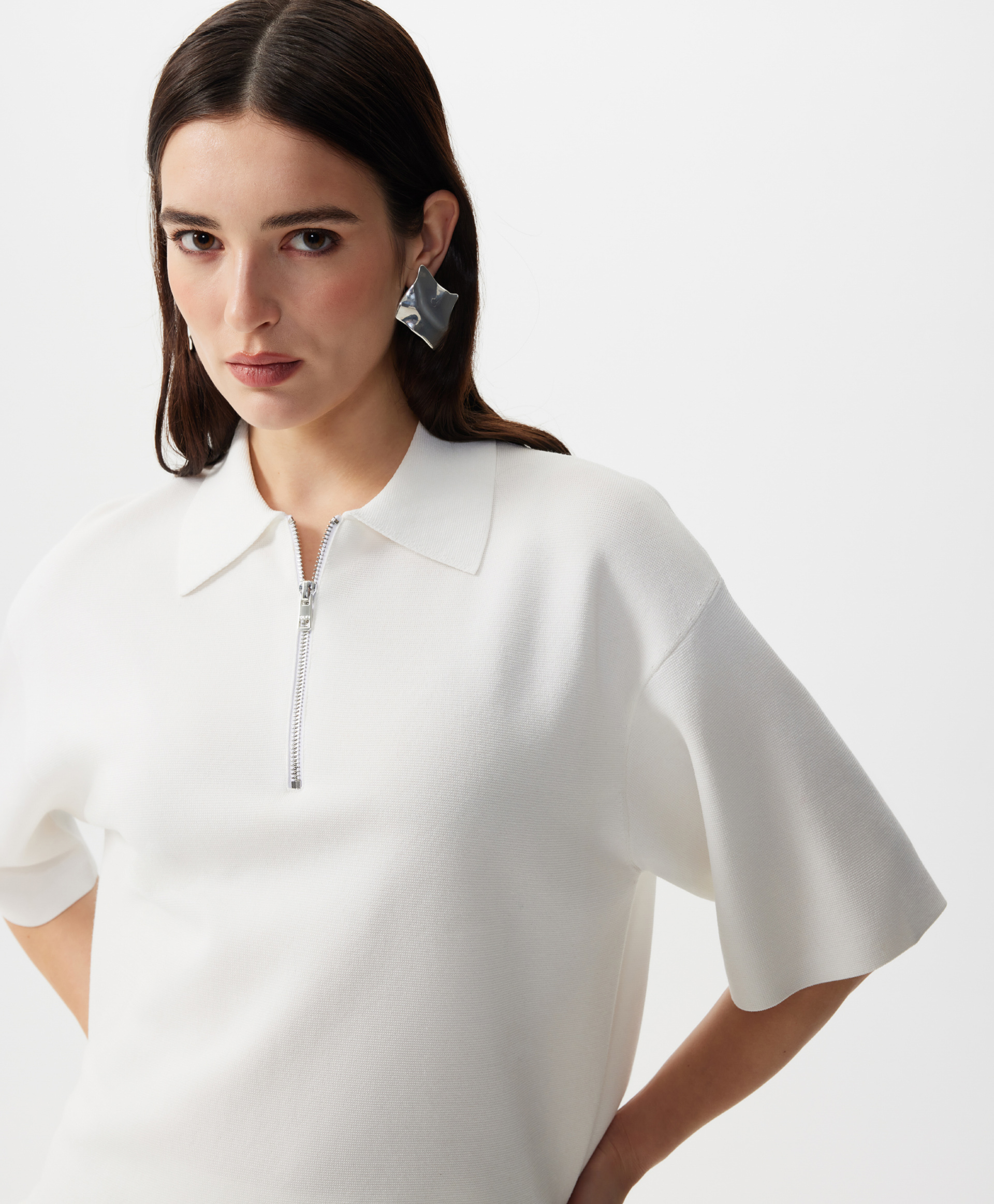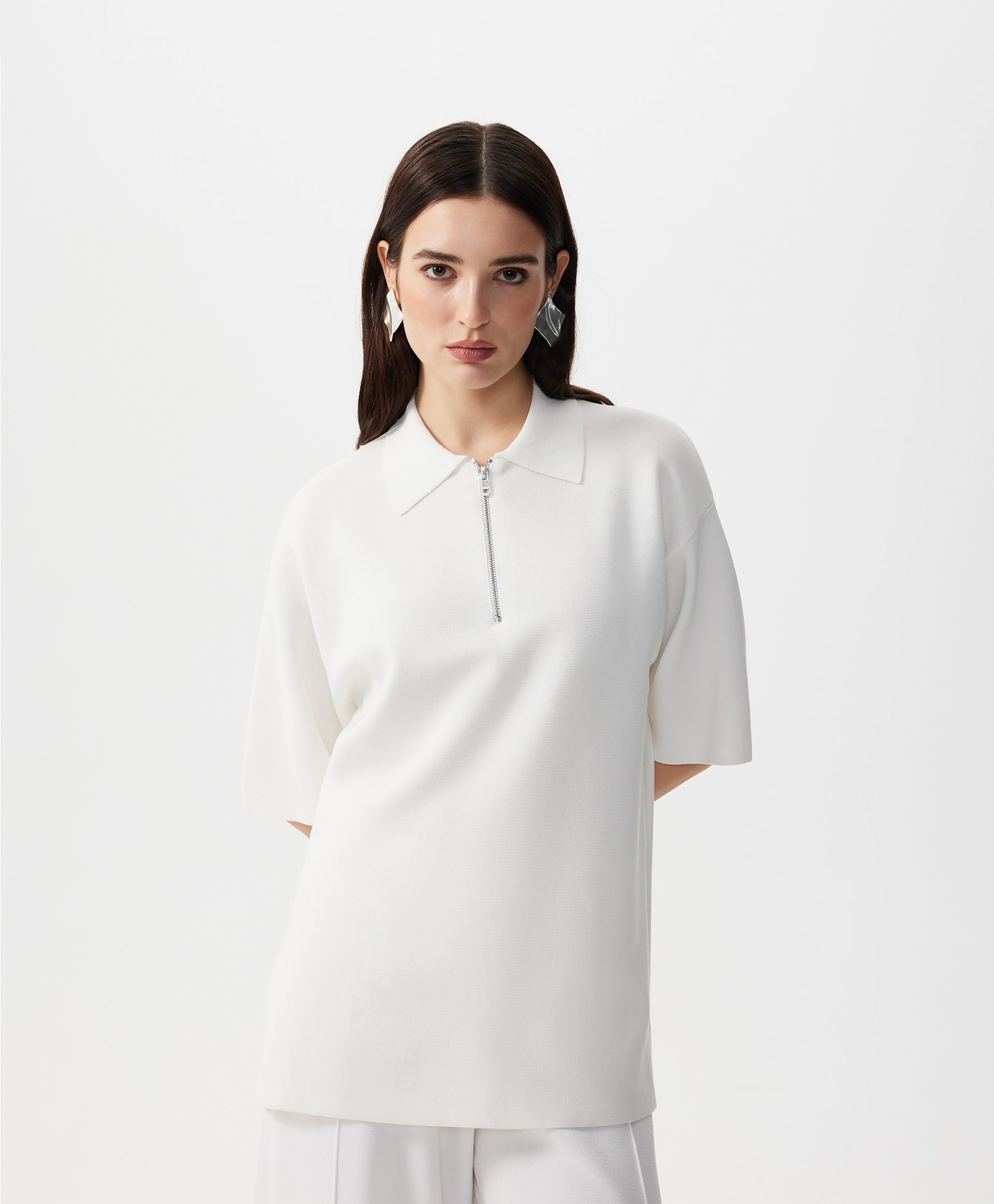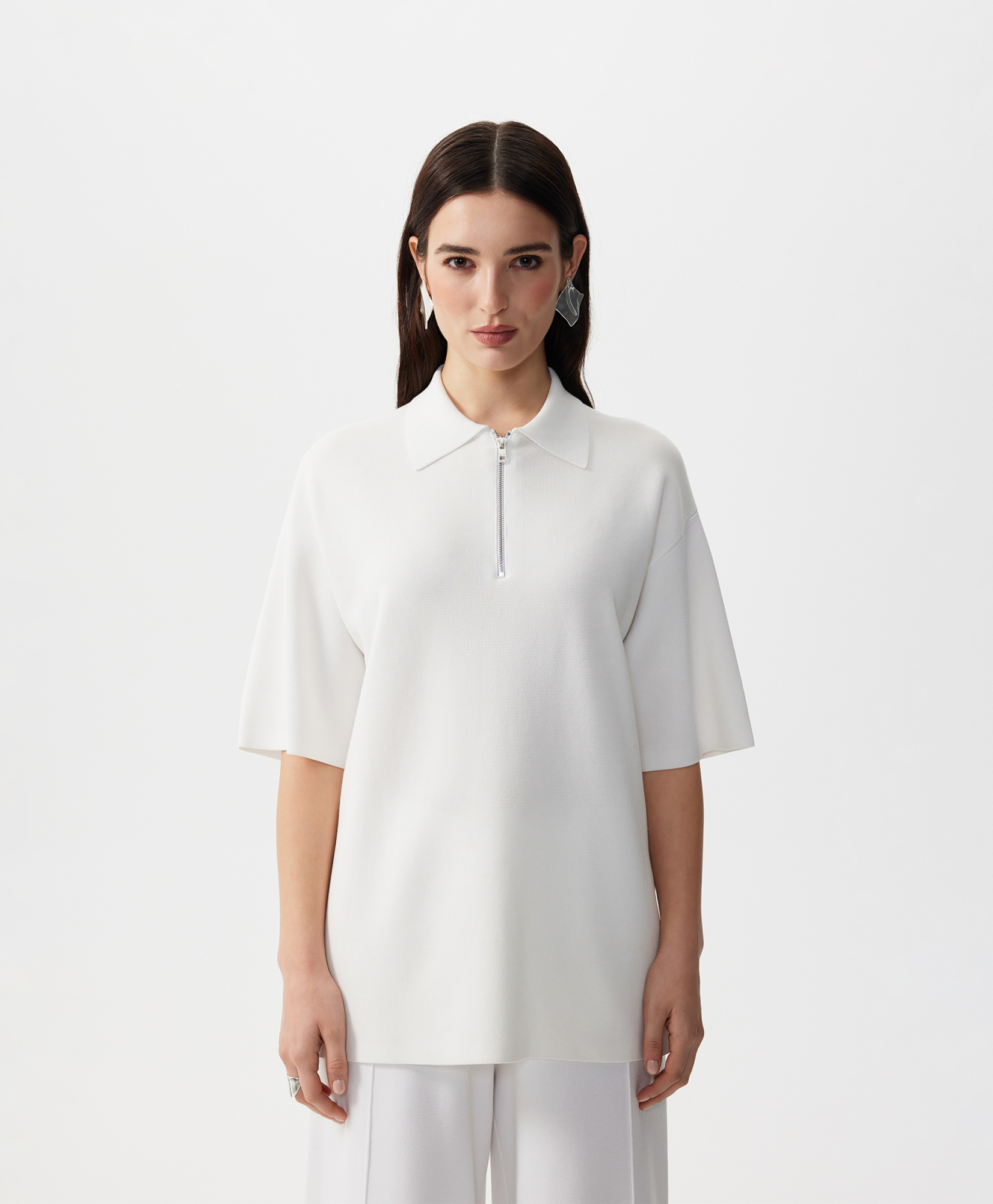 Поло с коротким рукавом силуэта оверсайз - ода минимализму! Благородный молочный цвет, выверенная форма и точные четкие линии - это не только утонченность, деликатность, культура подачи образа, это мироощущение, стиль жизни, исключающий все лишнее, искусственное, напускное. Поло выполнено из вязаного трикотажа, имеющего беспрецедентный состав с высоким содержанием натурального шелка. Вискоза, шелк, тенсель в переплетении джерси обеспечивают мягкость, эластичность, формоустойчивость, воздухопроницаемость, превосходный тактильный контакт с кожей. Поло застегивается на металлическую серебряную молнию. Высокие разрезы в боковых швах наделяют изделие комфортом и демократичностью повседневного городского стиля, делая поло универсальным вариантом, позволяющим женщине выглядеть безупречно и днем в офисе, и вечером - на элегантном ужине или в театре.