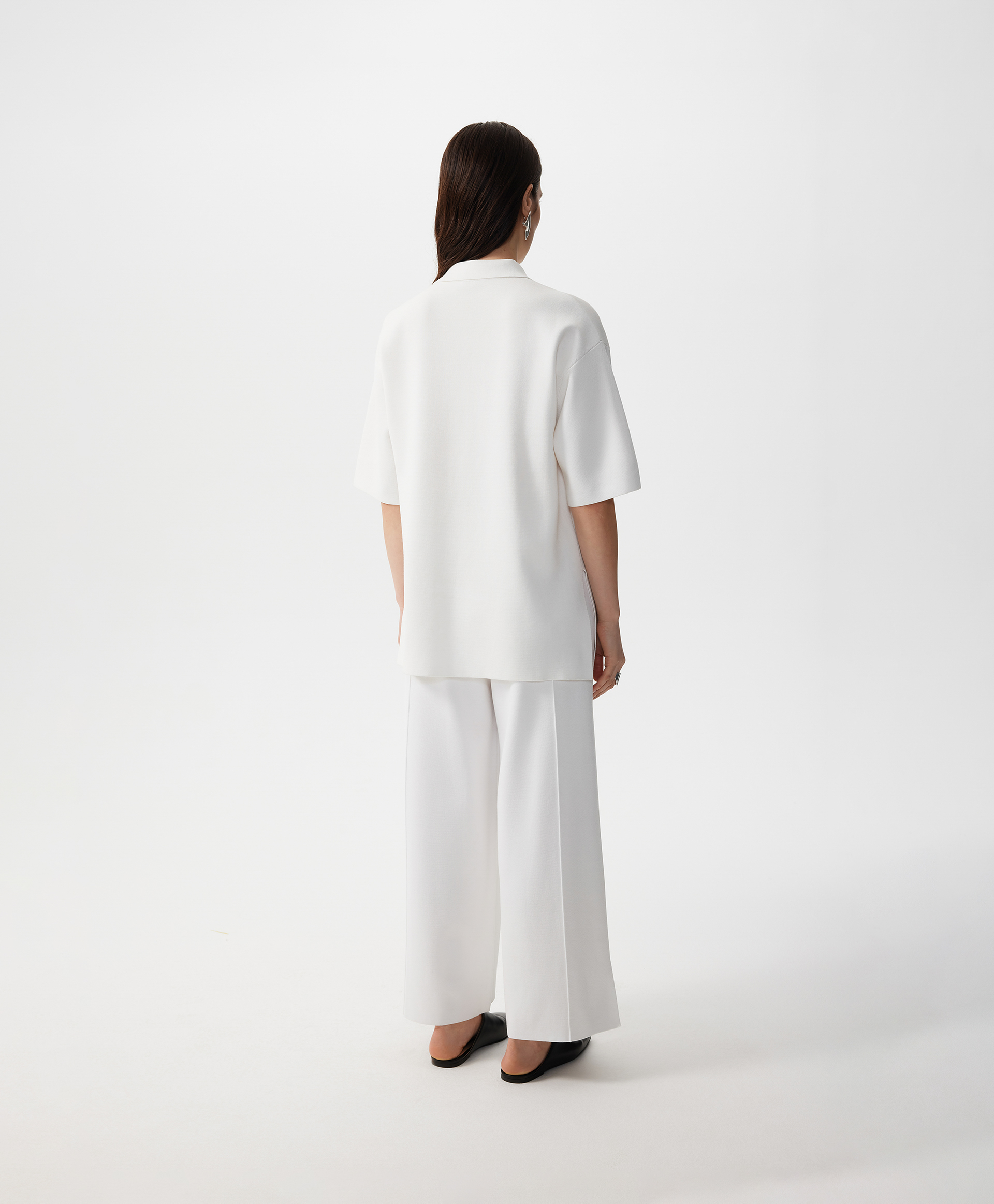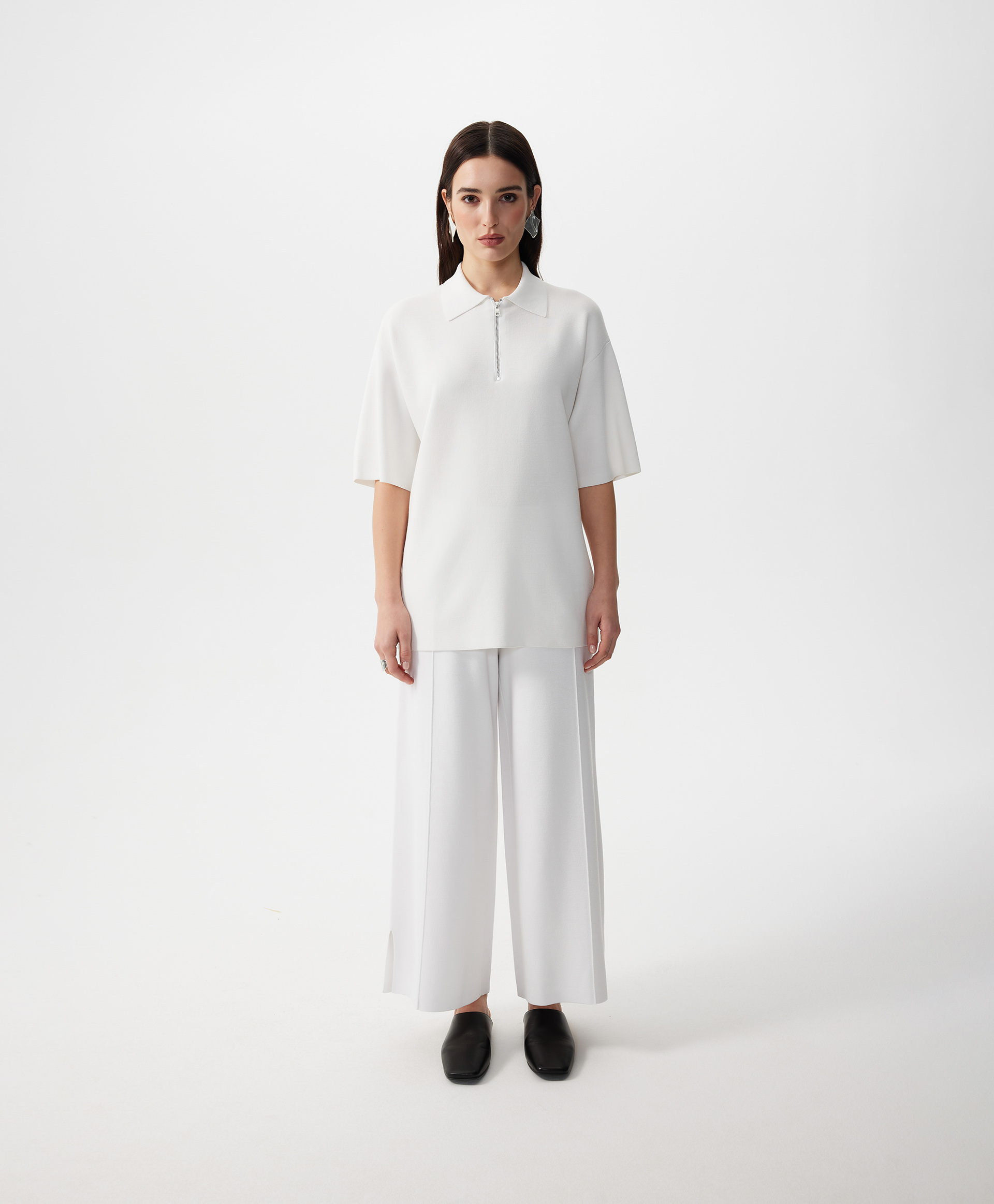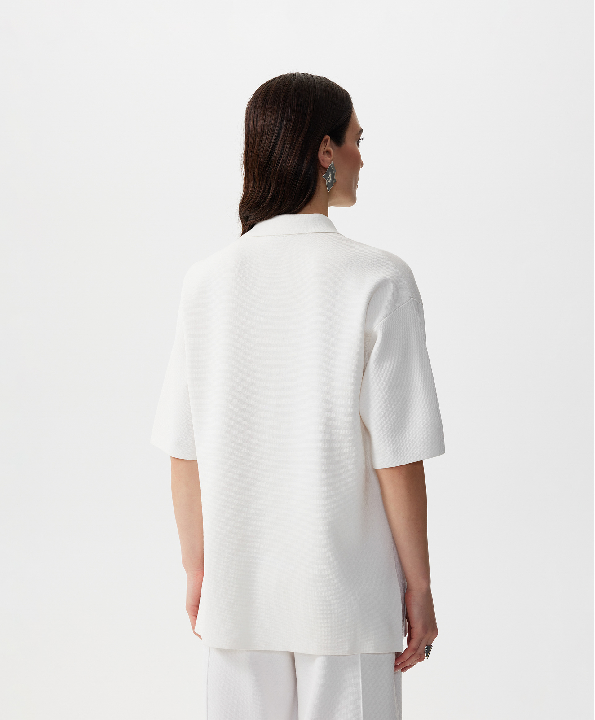 Поло с коротким рукавом силуэта оверсайз - ода минимализму! Благородный молочный цвет, выверенная форма и точные четкие линии - это не только утонченность, деликатность, культура подачи образа, это мироощущение, стиль жизни, исключающий все лишнее, искусственное, напускное. Поло выполнено из вязаного трикотажа, имеющего беспрецедентный состав с высоким содержанием натурального шелка. Вискоза, шелк, тенсель в переплетении джерси обеспечивают мягкость, эластичность, формоустойчивость, воздухопроницаемость, превосходный тактильный контакт с кожей. Поло застегивается на металлическую серебряную молнию. Высокие разрезы в боковых швах наделяют изделие комфортом и демократичностью повседневного городского стиля, делая поло универсальным вариантом, позволяющим женщине выглядеть безупречно и днем в офисе, и вечером - на элегантном ужине или в театре.
