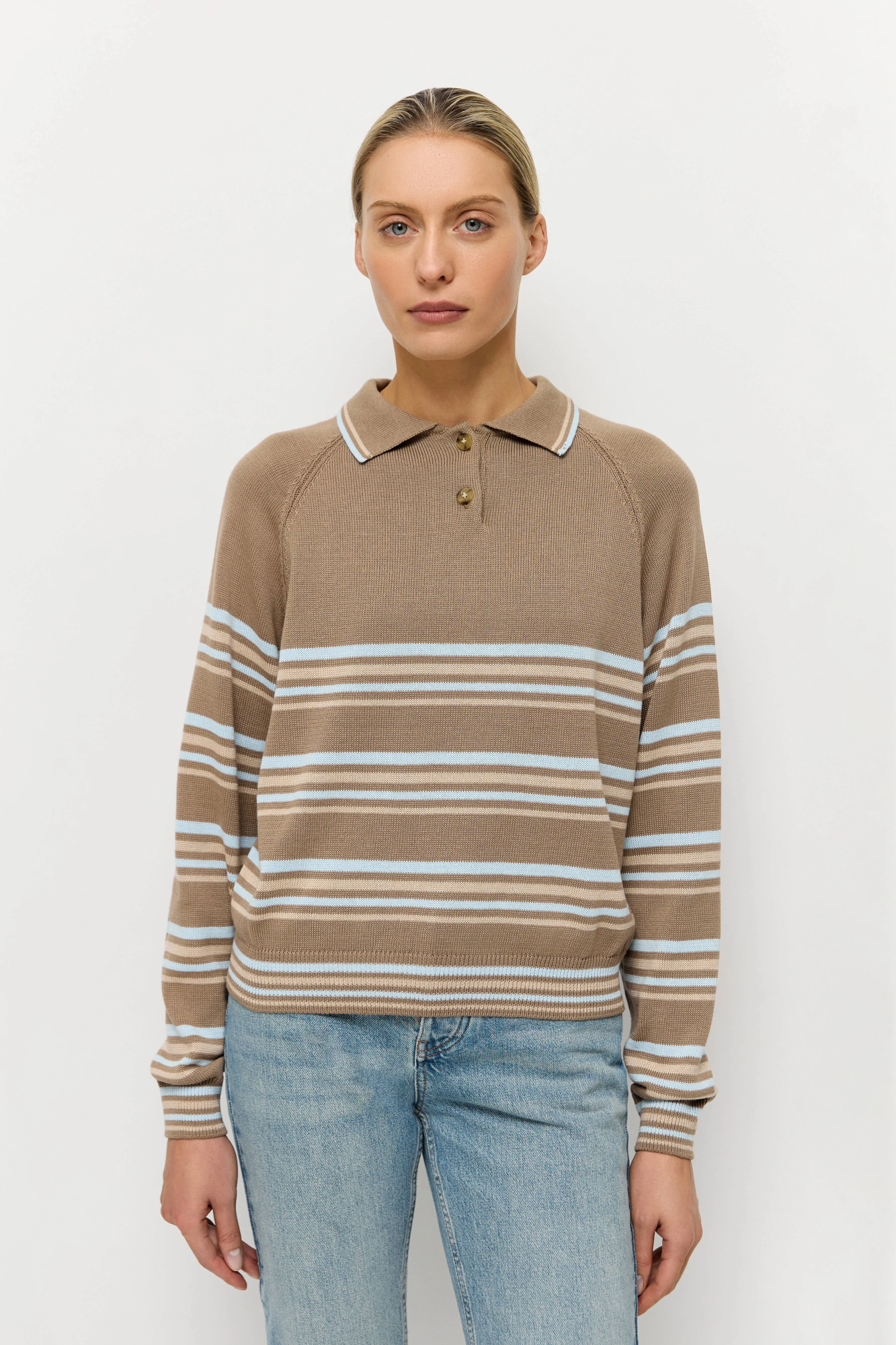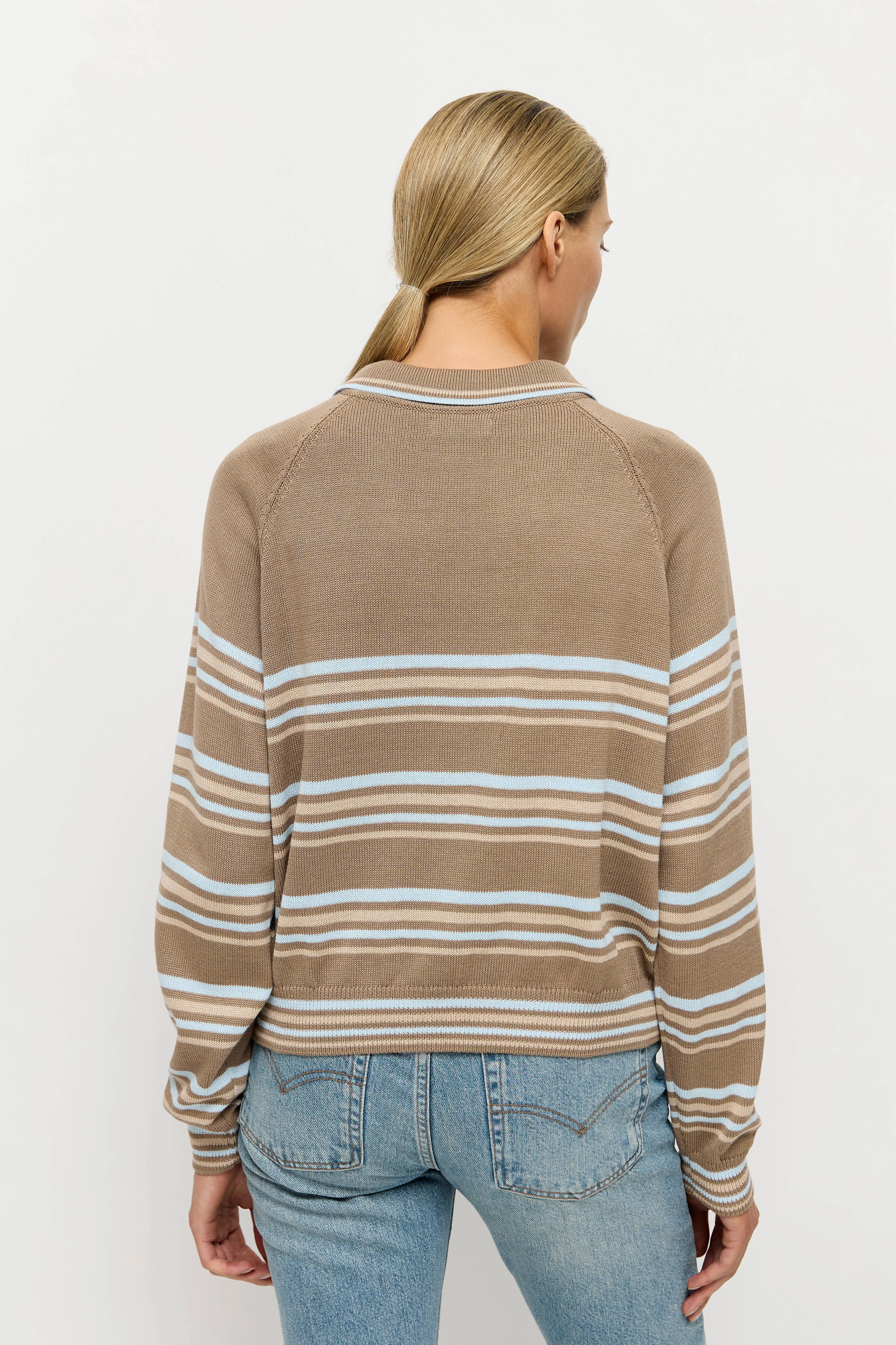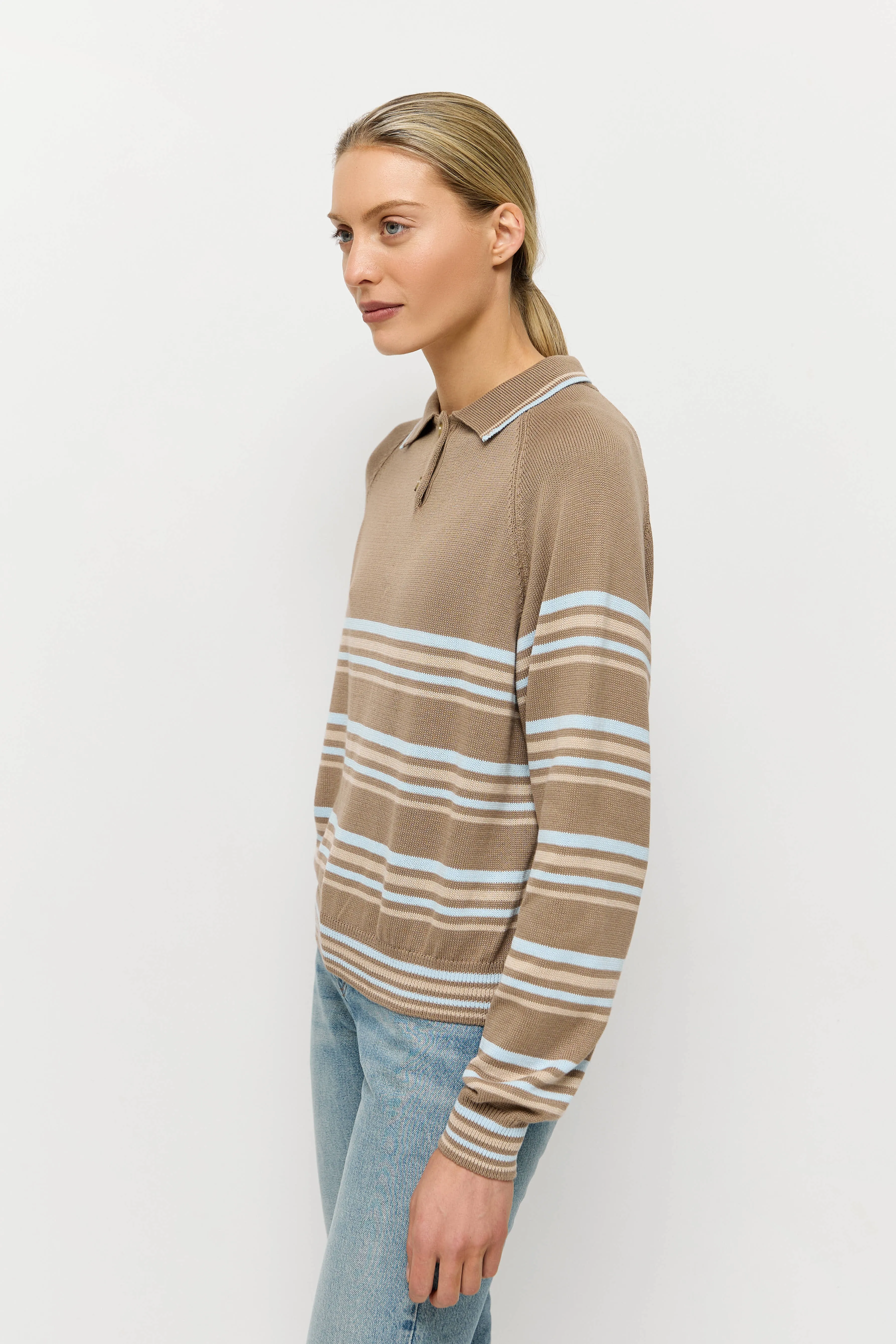 Отложной классический воротник с контрастным кантом, длинные рукава-реглан с вывязаннами в резинку манжетами. По низу поло также предусмотрена резинка, которая визуально стягивает силуэт.