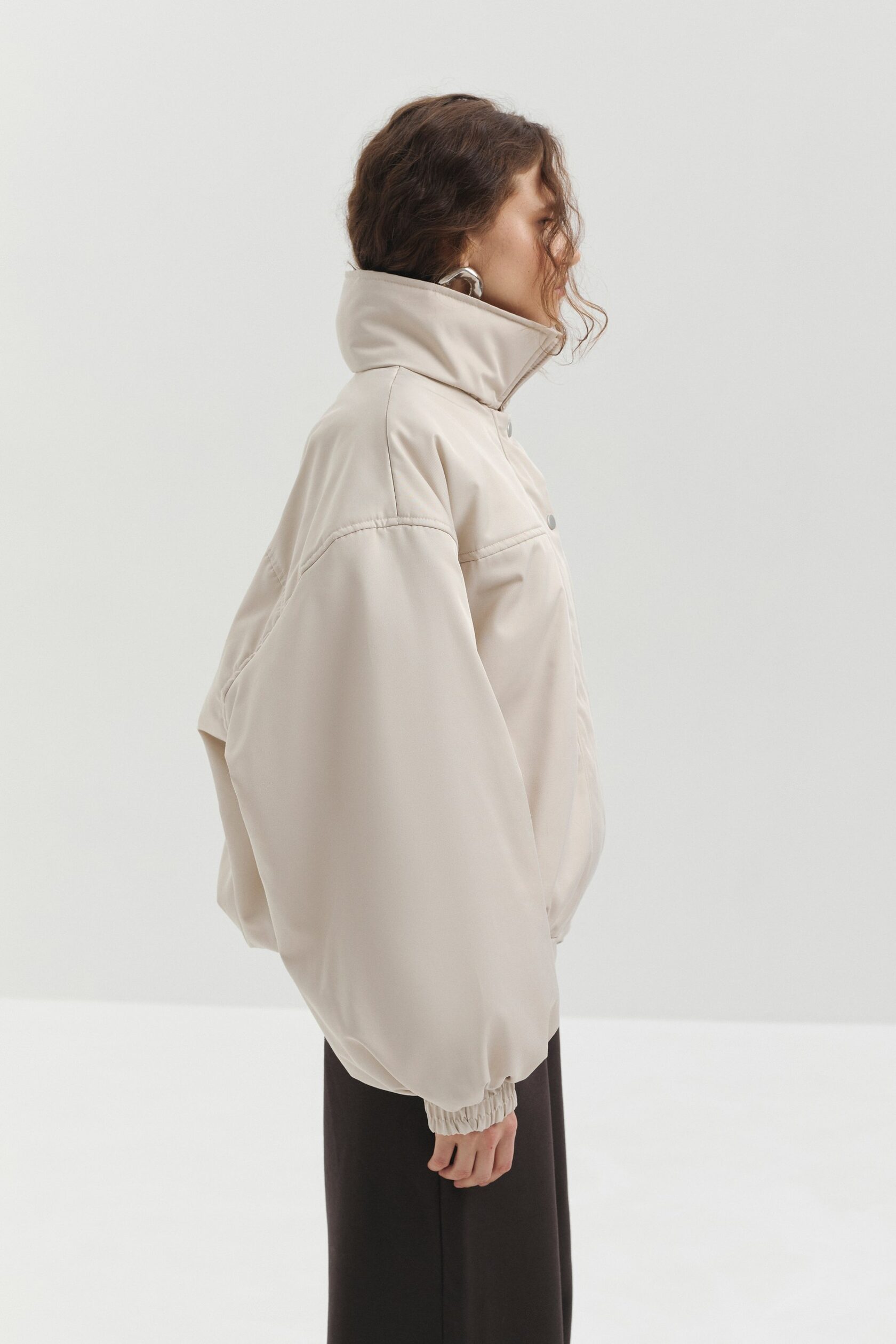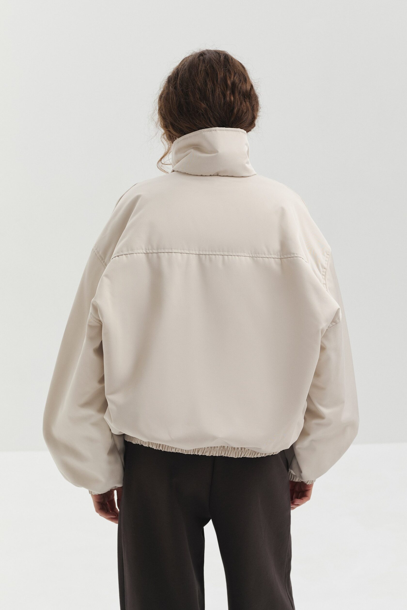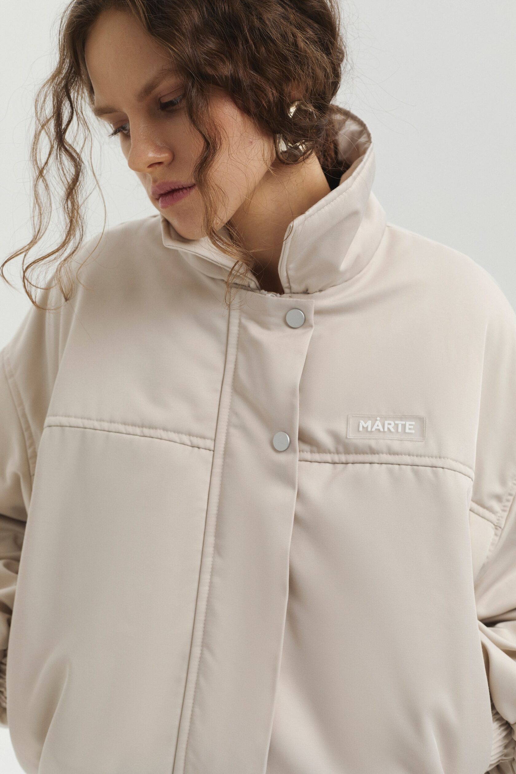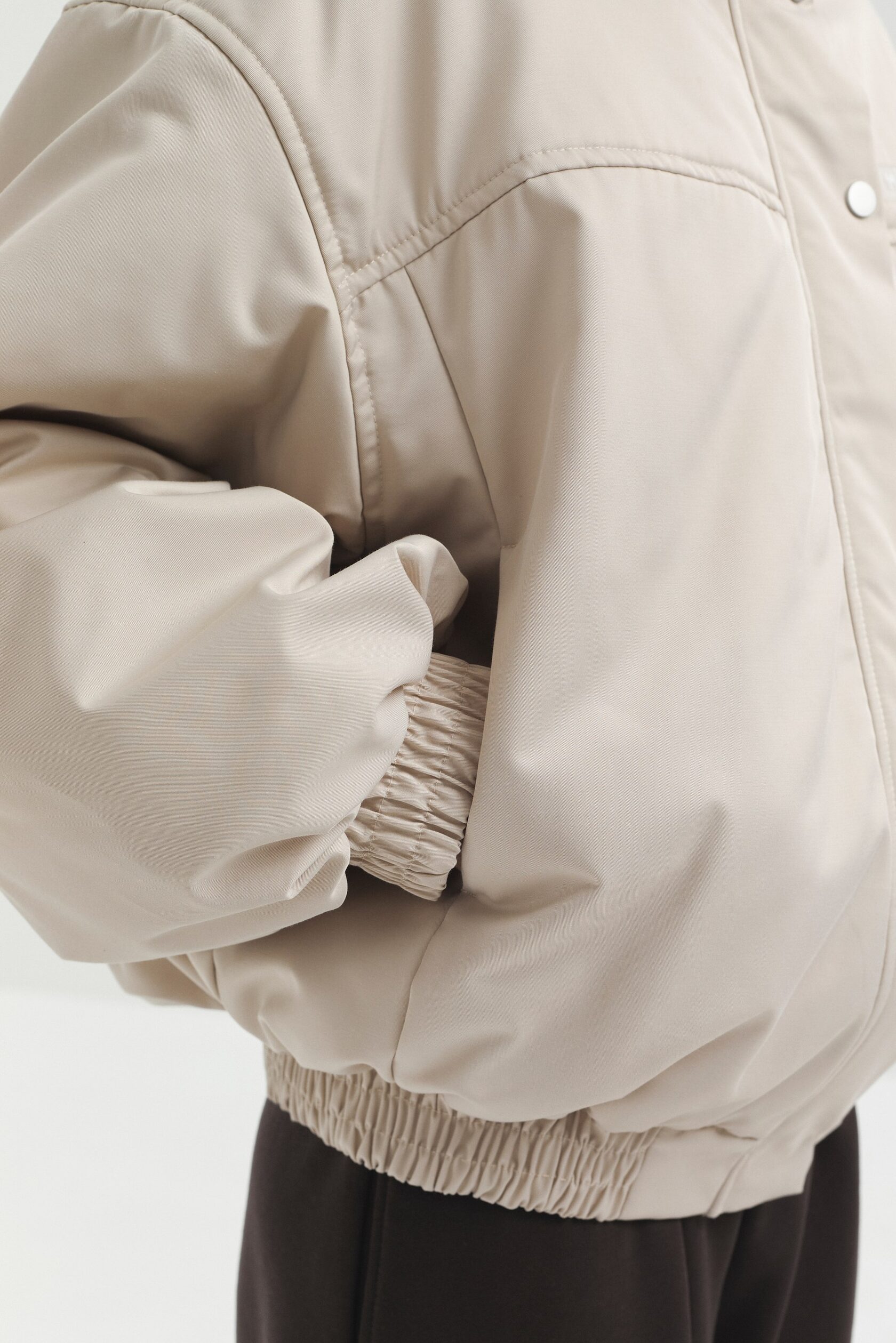 Укороченный бомбер с отложным воротником из плотной, мягкой и тактильно приятной мембраны с водоотталкивающей пропиткой.