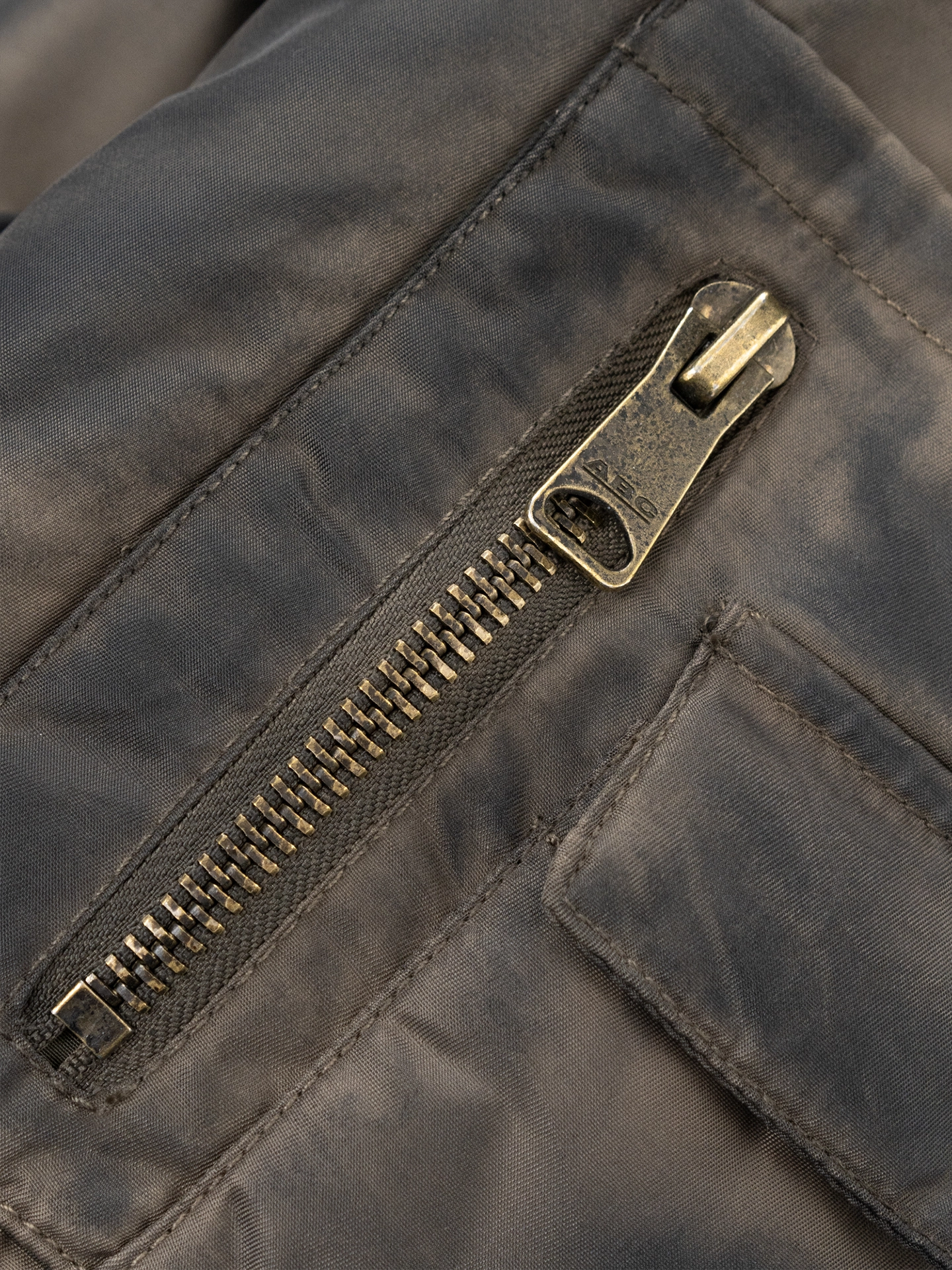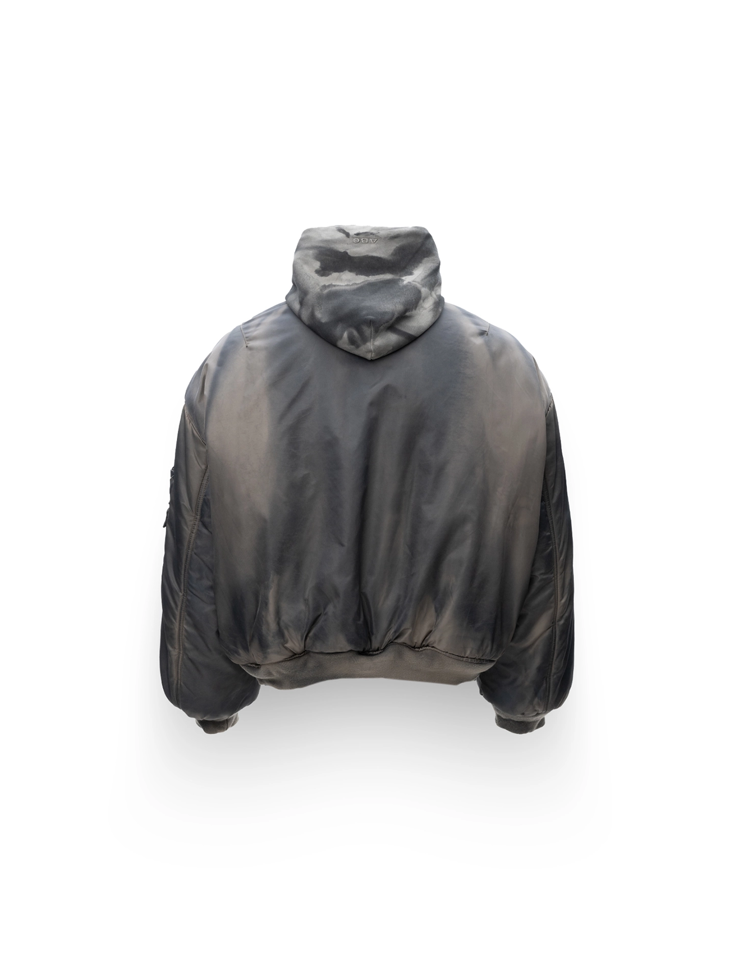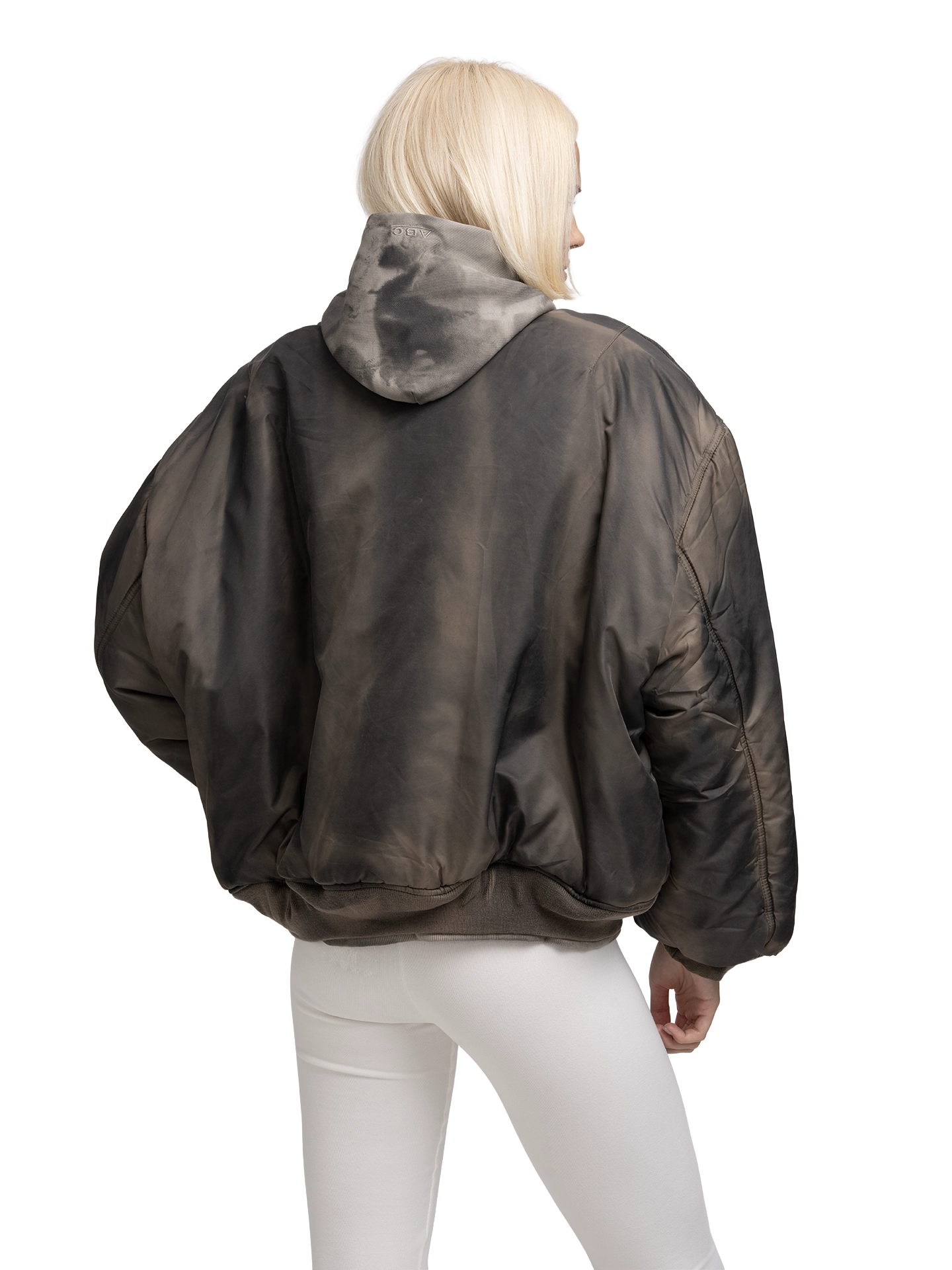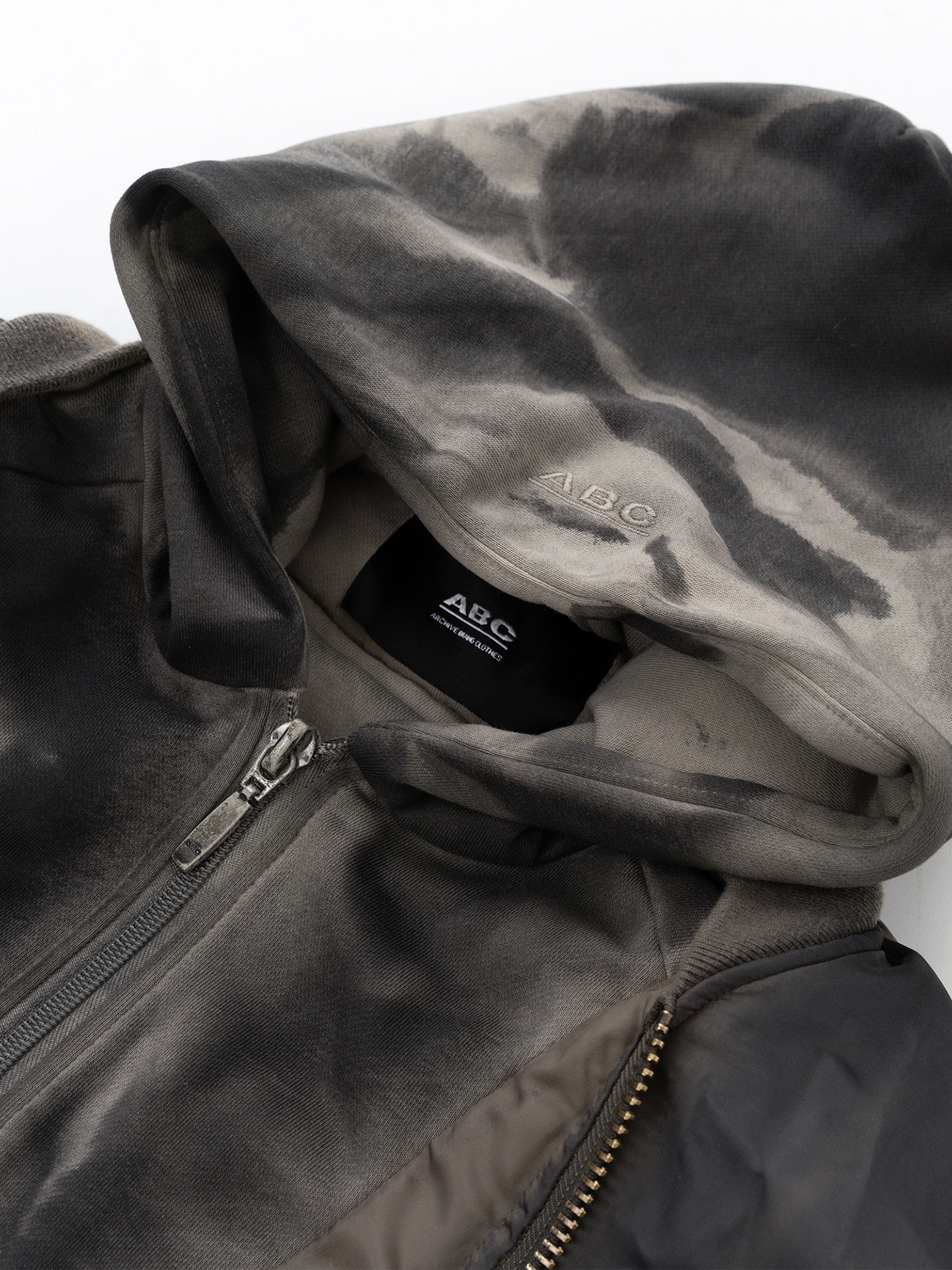 Внешняя часть выполнена из нейлона, внутренняя подкладка и капюшон — из плотного мягкого футера. Каждая модель окрашена вручную, создавая уникальный эффект цветового перехода. Фурнитура из стали с логотипом ABC.