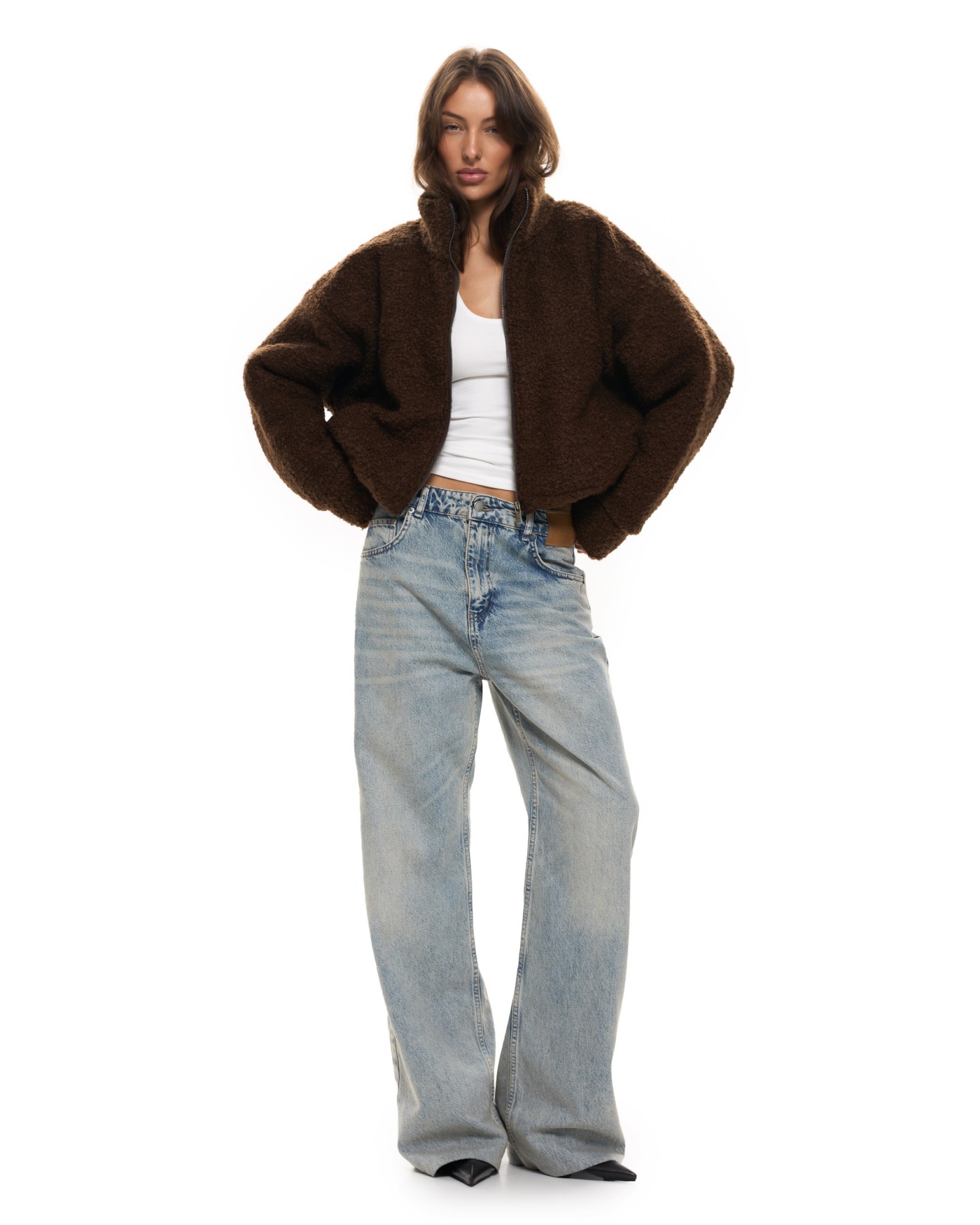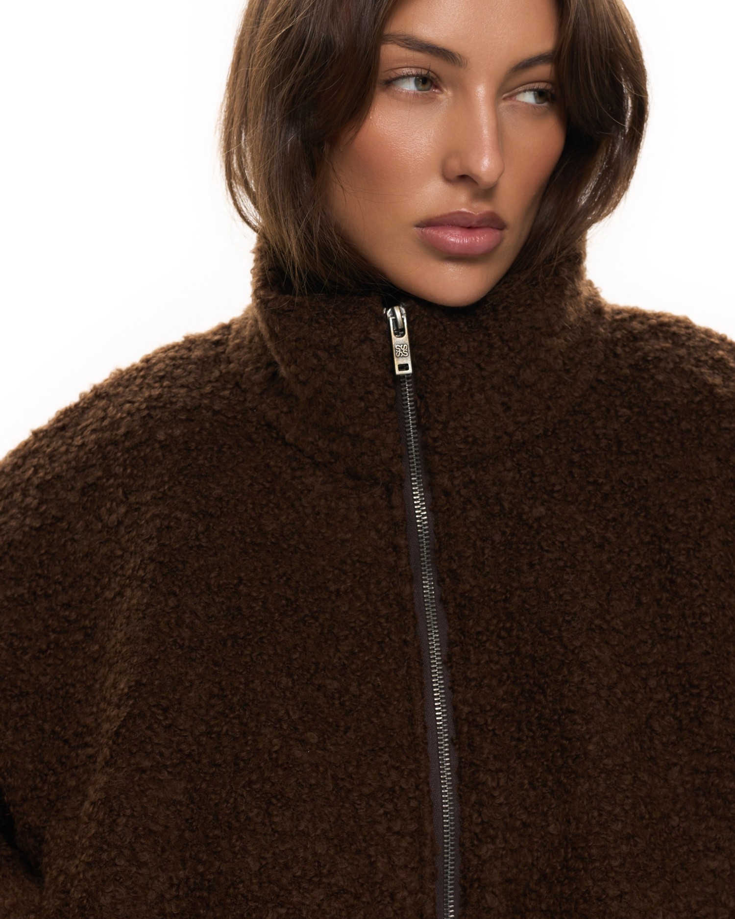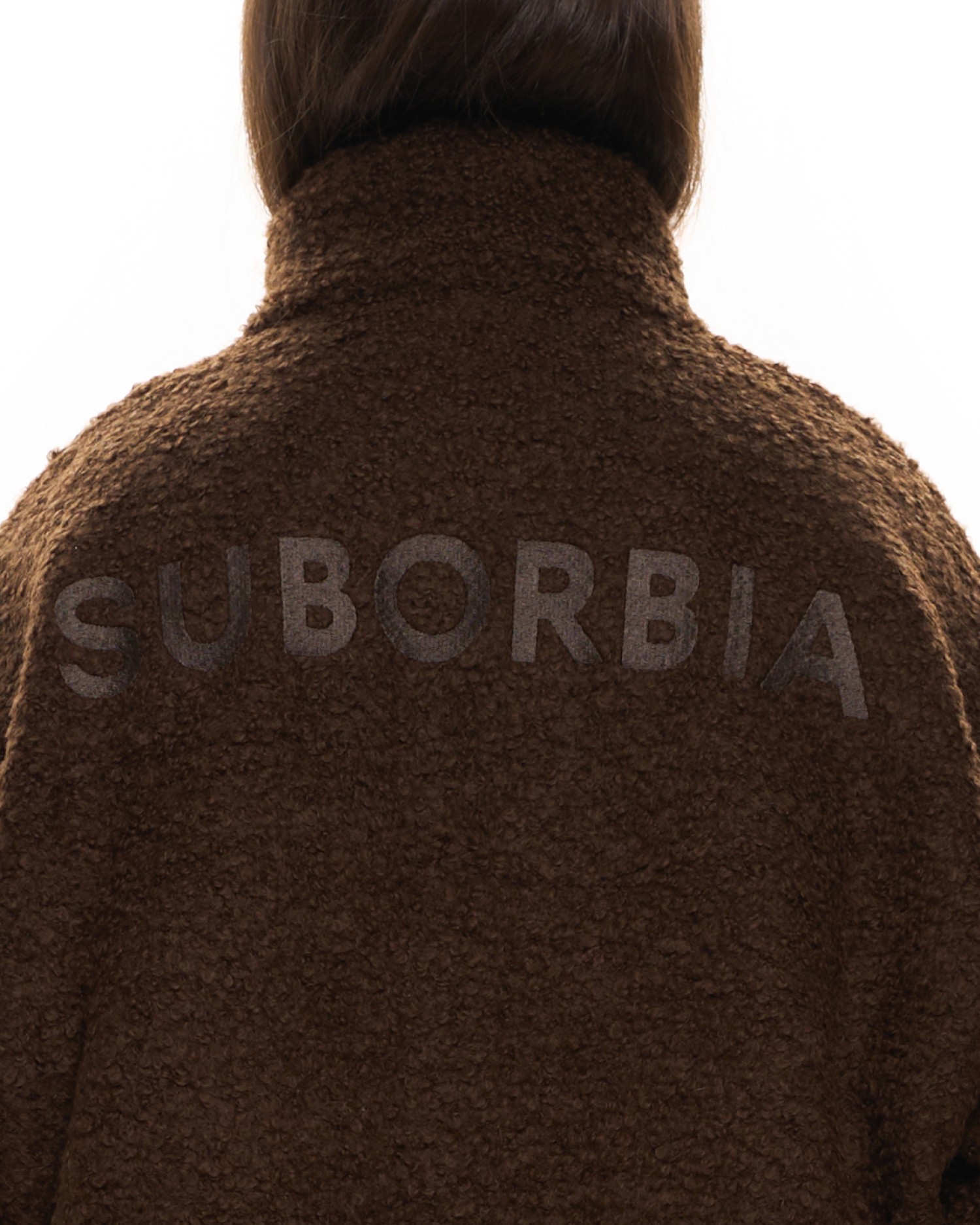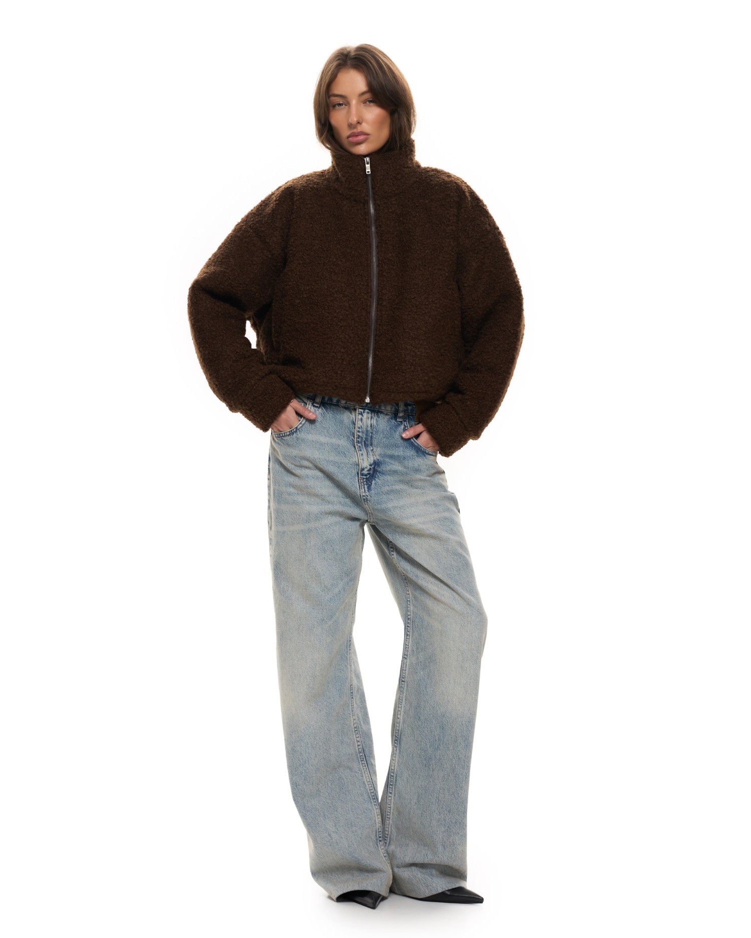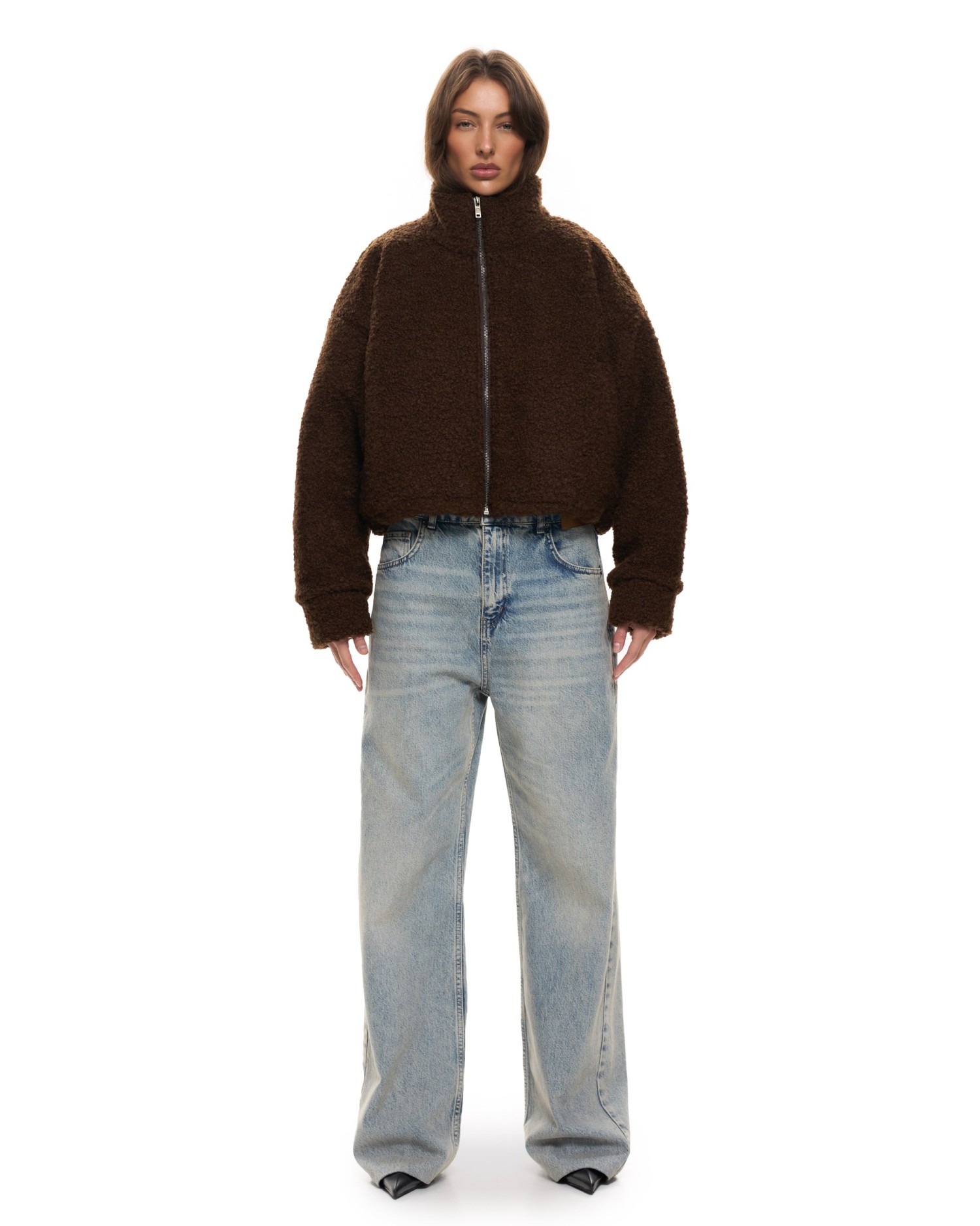 Бомбер свободного кроя из фактурной ткани с добавлением шерсти.