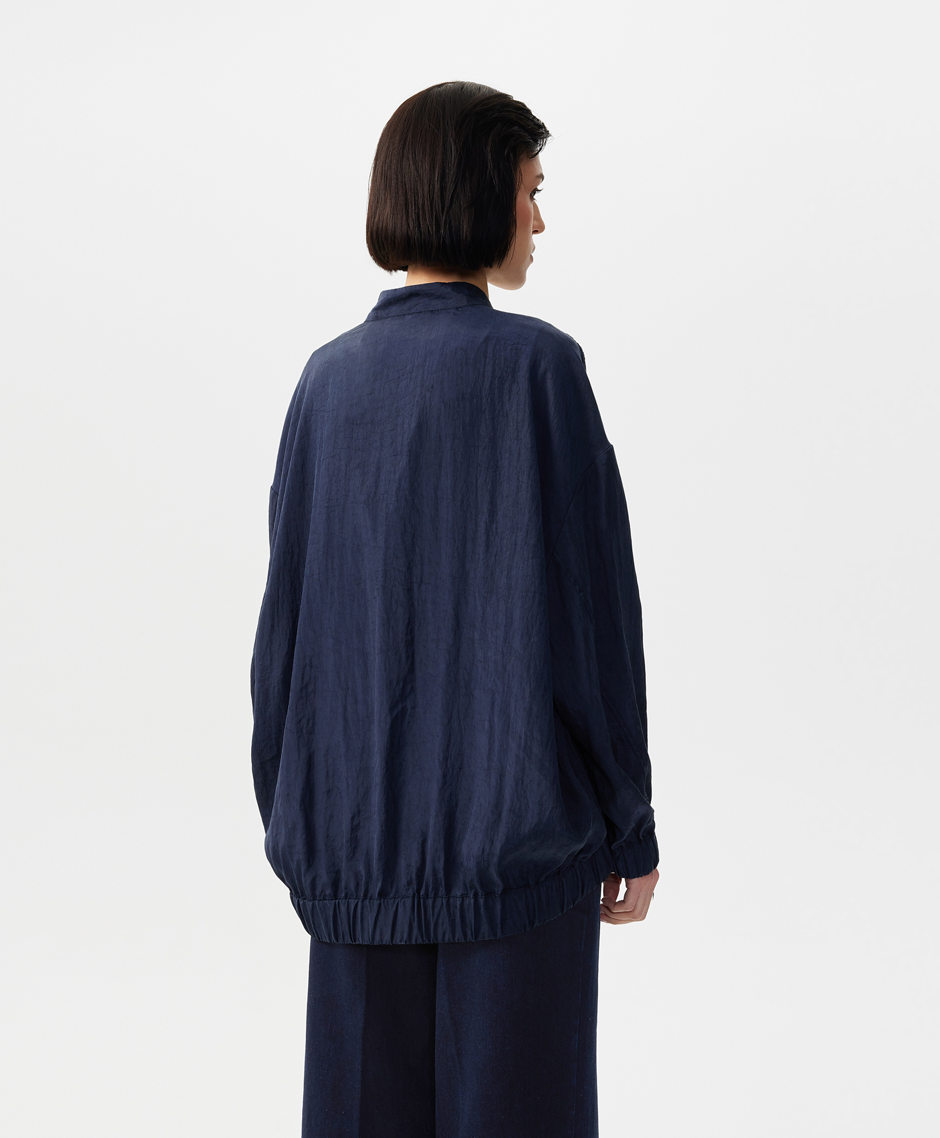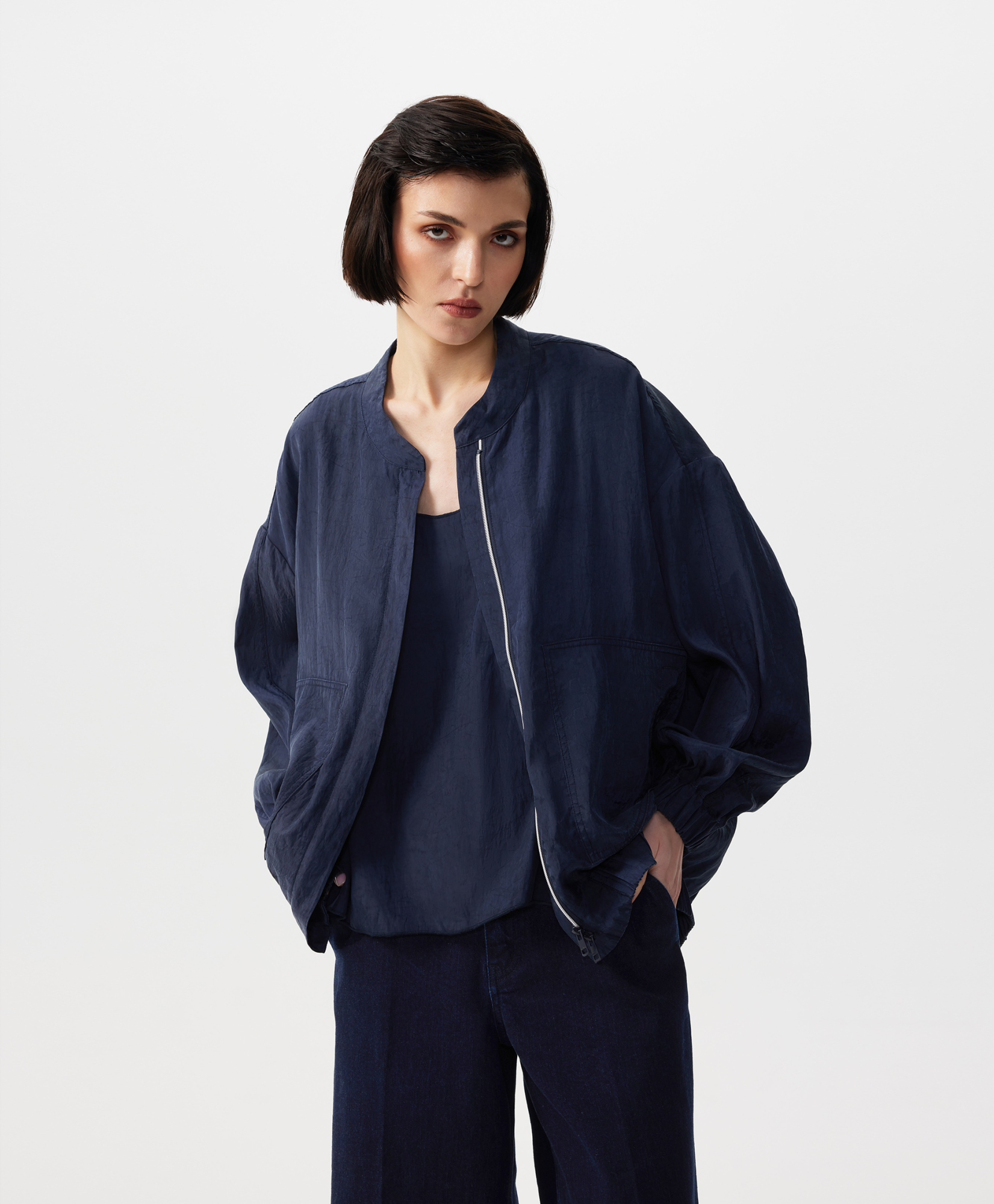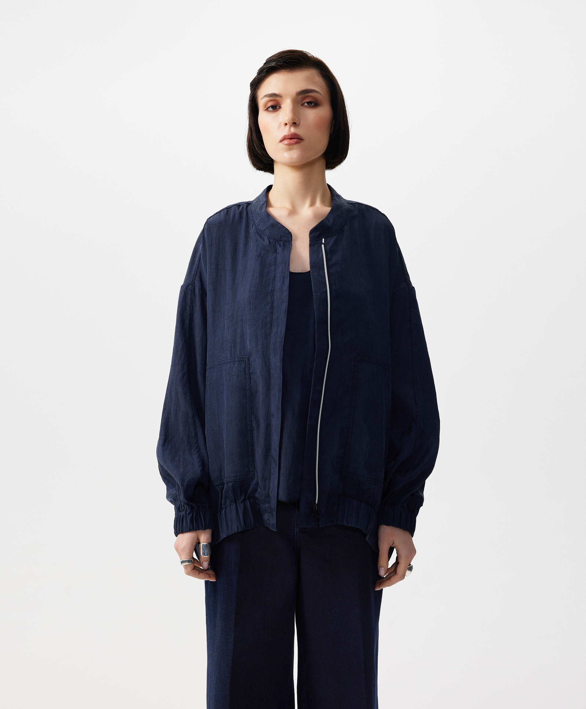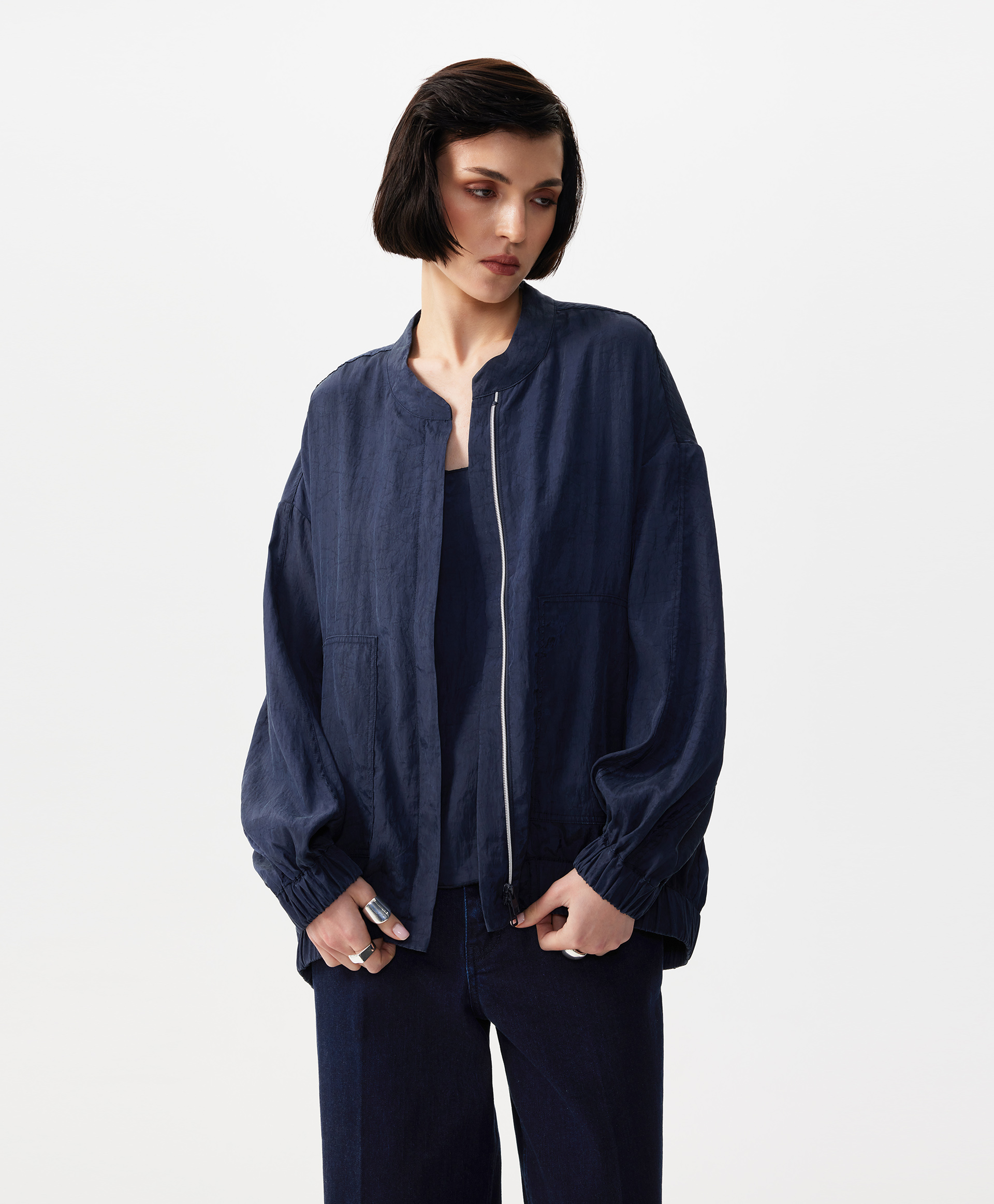 В жаркий летний день, когда на топ, майку, сарафан хочется накинуть что-то тонкое, невесомое, не создающее тепла, но формирующее многослойность, прохладный бомбер оверсайз - прекрасный вариант. Бомбер выполнен из струящейся шелковистой вискозной ткани с благородным матовым блеском, имеющей легкий жатый эффект. Заниженная линия спинки подчеркивает мягкость, женственность силуэта, создает современные пропорции в образе. Воротник-стойка застегивается на пластиковую молнию, скрытую элегантной супатной планкой. Крупные накладные карманы с вертикальными боковыми входами, оформленными листочками, создают удобство в эксплуатации вещи. Низ изделия и рукавов присборен на широкую резинку.