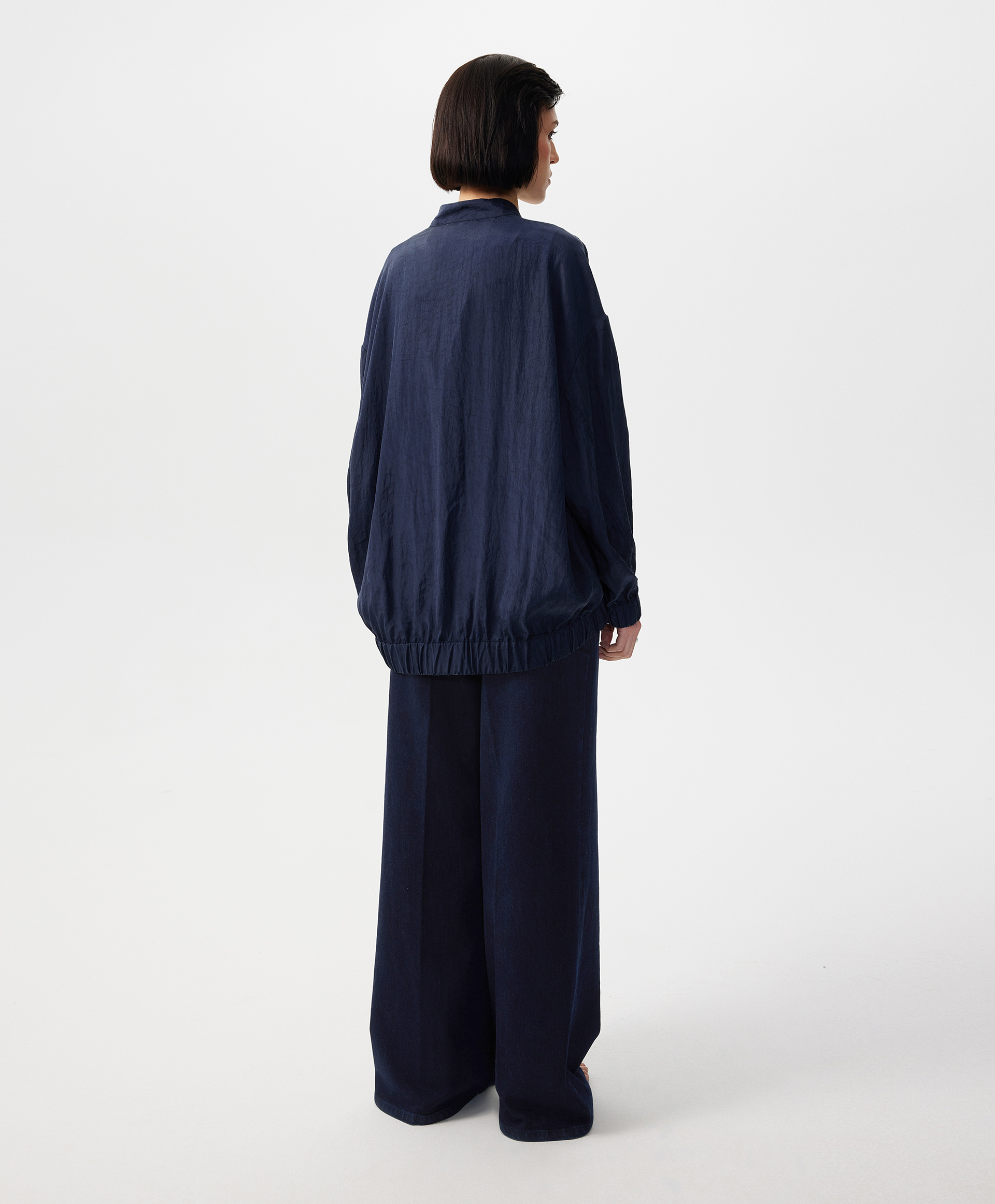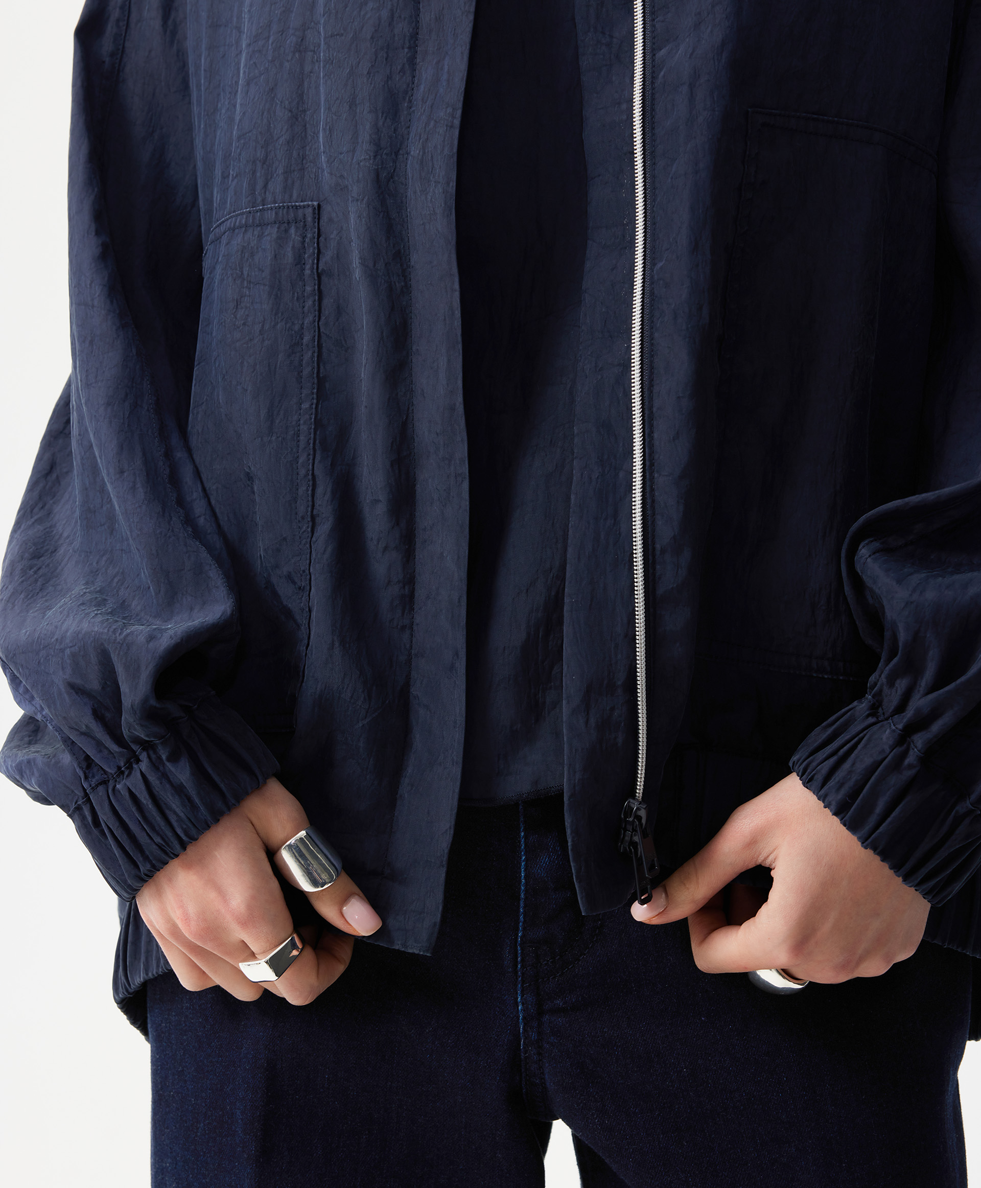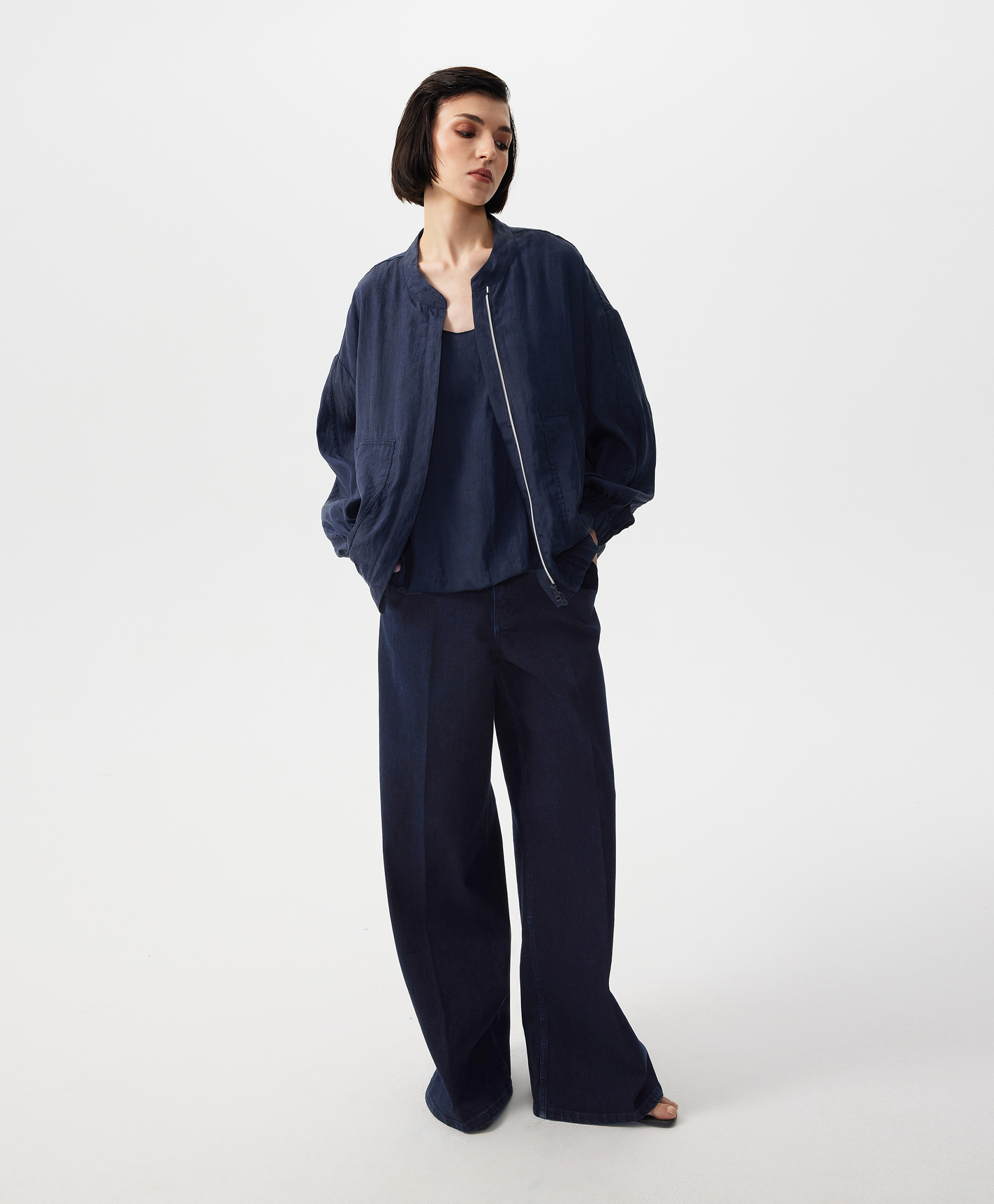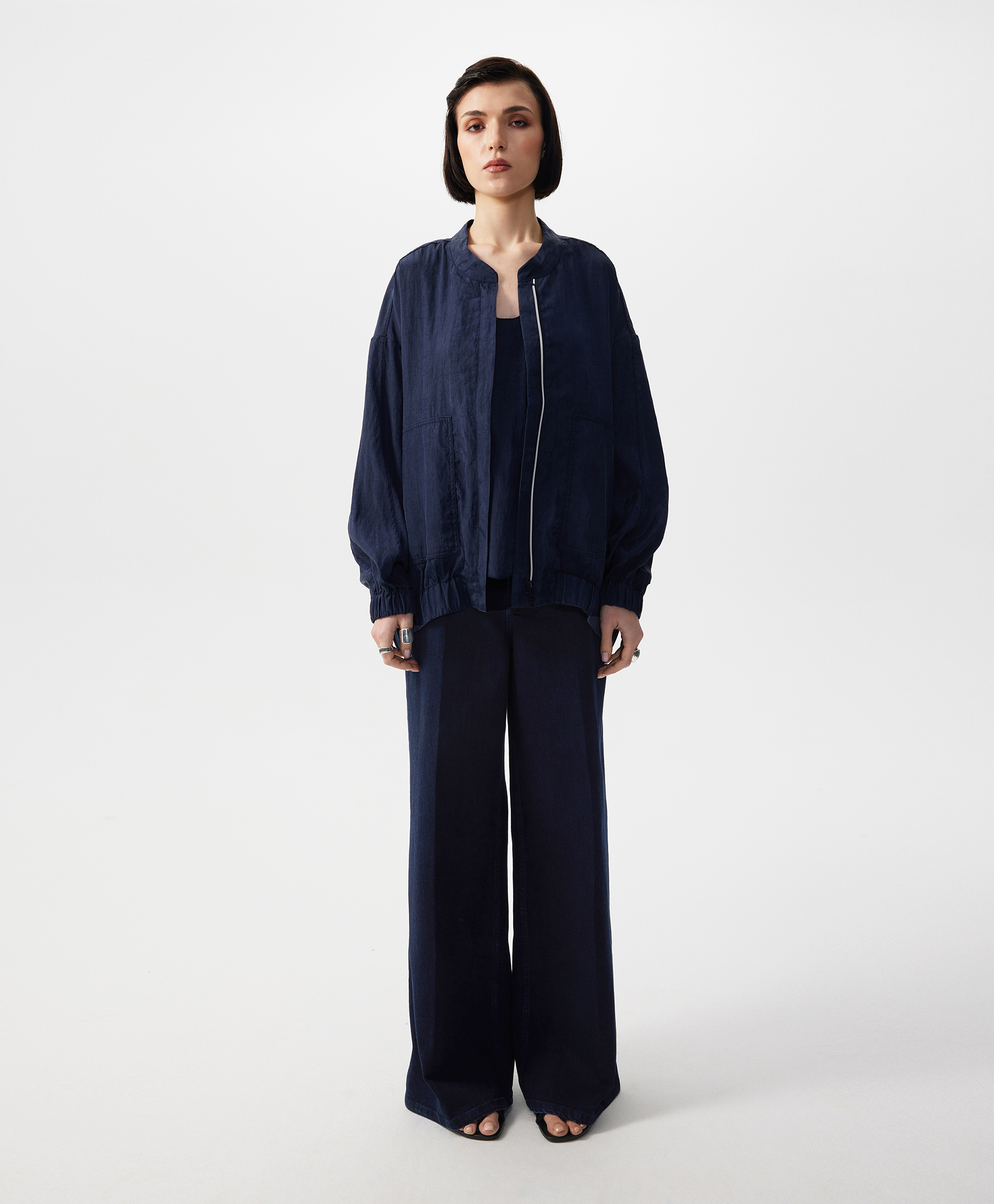 В жаркий летний день, когда на топ, майку, сарафан хочется накинуть что-то тонкое, невесомое, не создающее тепла, но формирующее многослойность, прохладный бомбер оверсайз - прекрасный вариант. Бомбер выполнен из струящейся шелковистой вискозной ткани с благородным матовым блеском, имеющей легкий жатый эффект. Заниженная линия спинки подчеркивает мягкость, женственность силуэта, создает современные пропорции в образе. Воротник-стойка застегивается на пластиковую молнию, скрытую элегантной супатной планкой. Крупные накладные карманы с вертикальными боковыми входами, оформленными листочками, создают удобство в эксплуатации вещи. Низ изделия и рукавов присборен на широкую резинку.