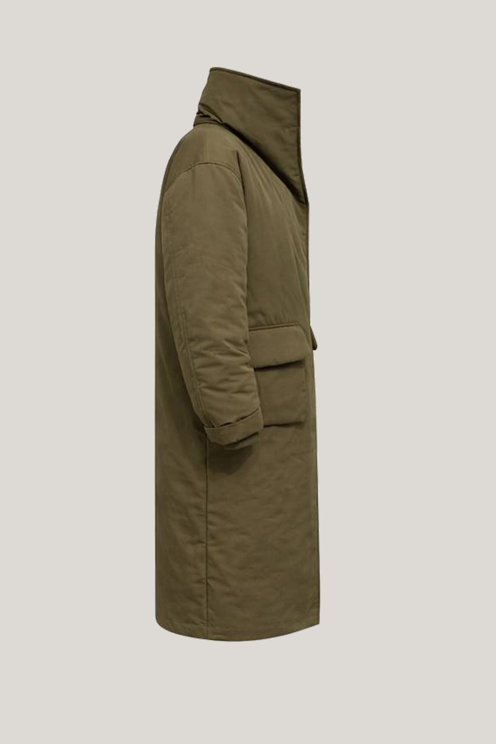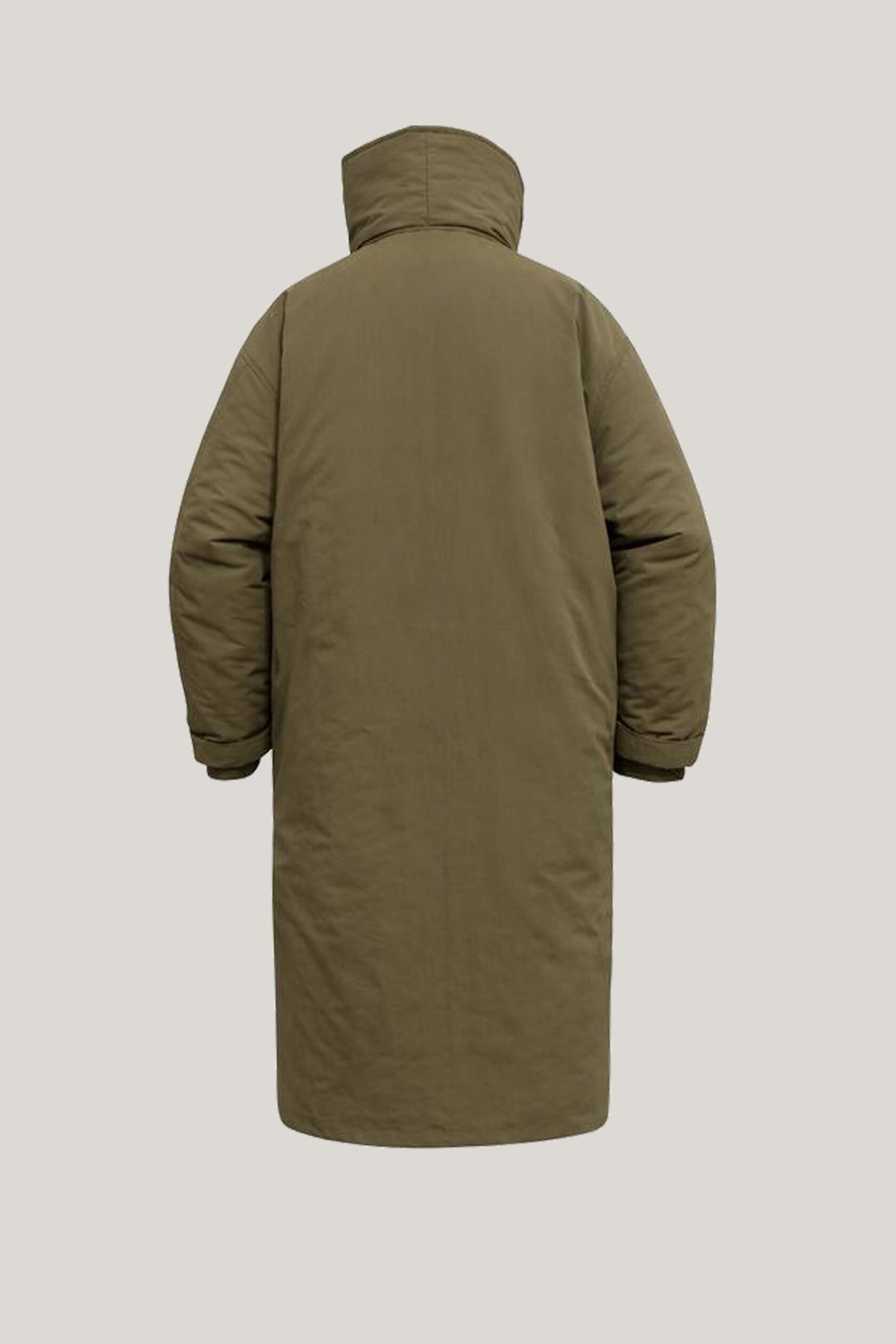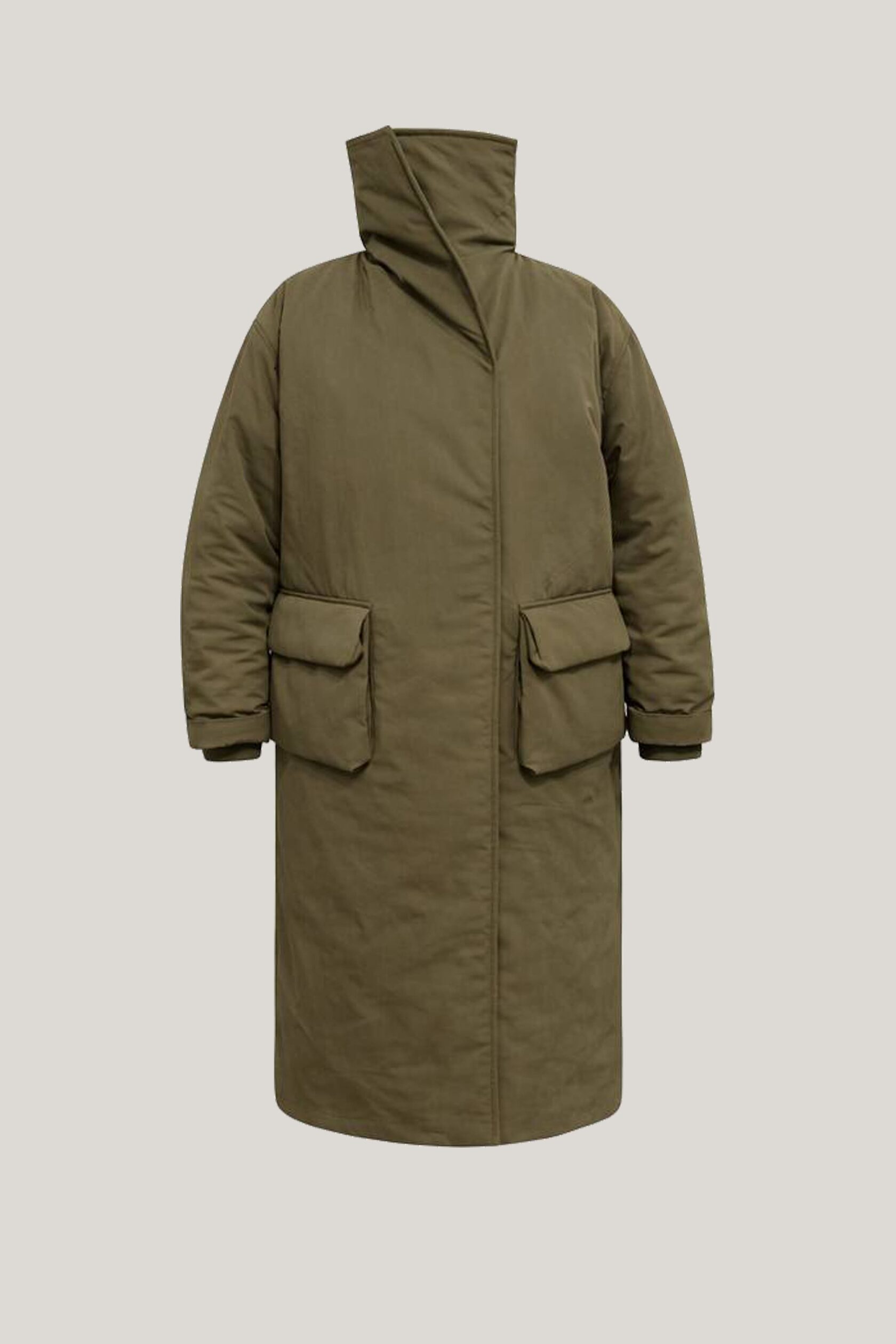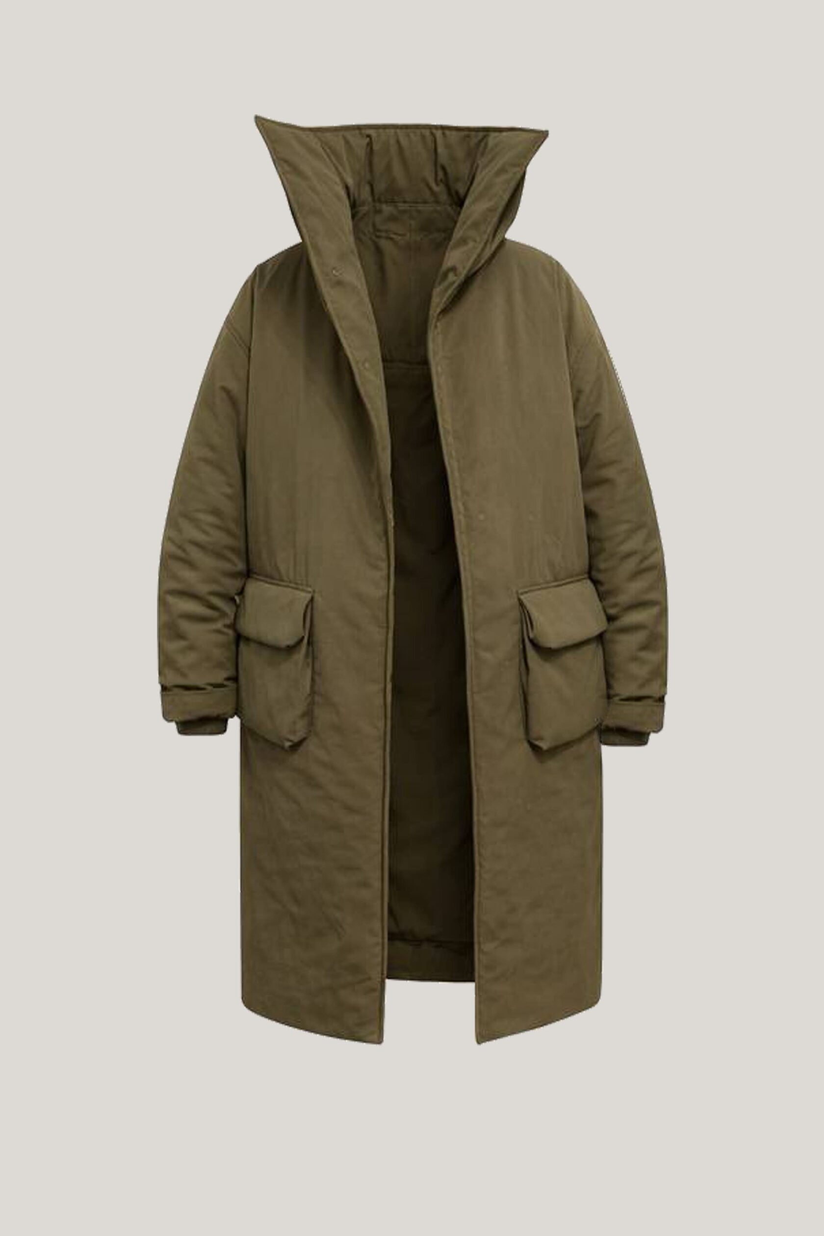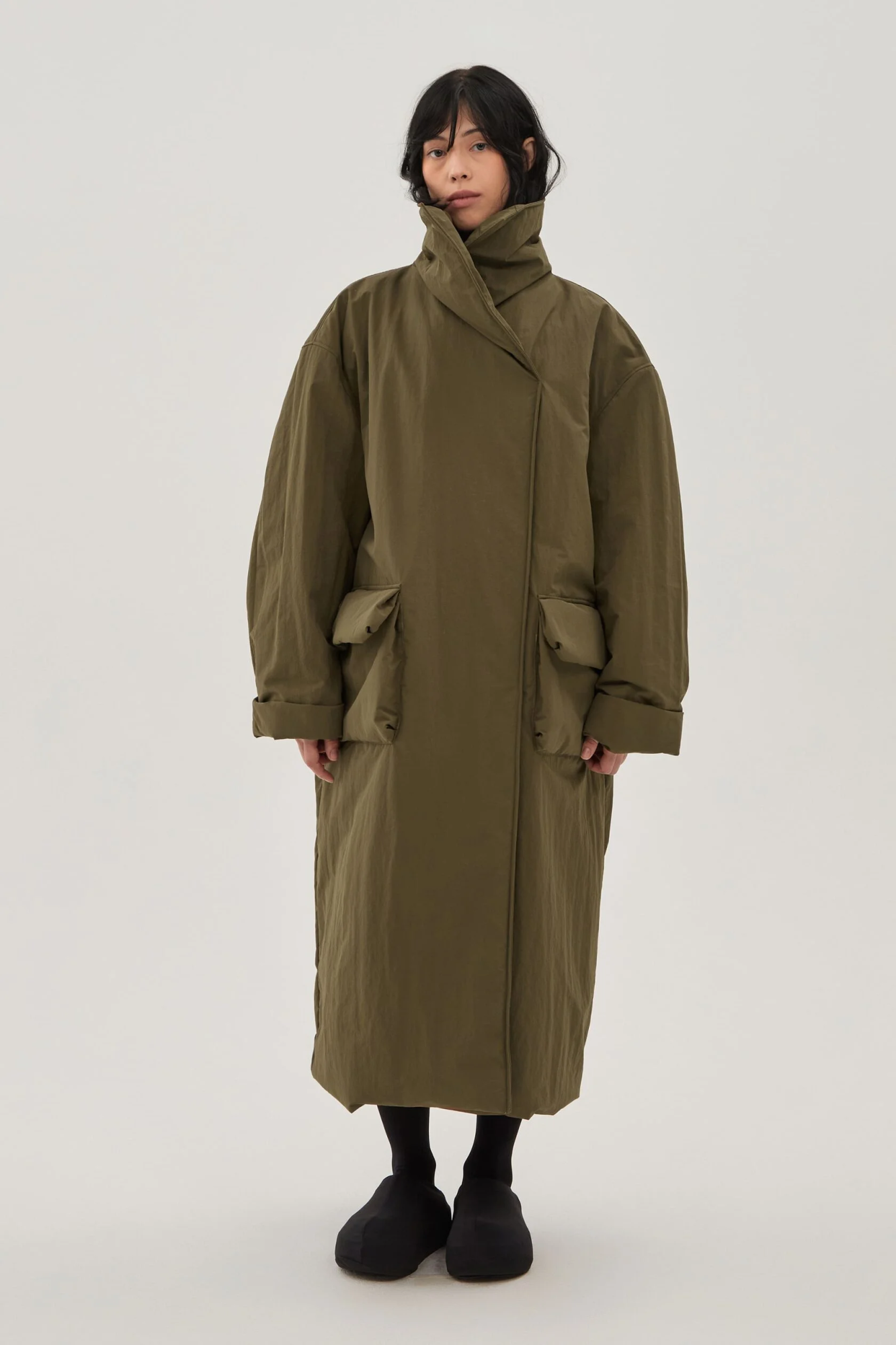 Объемная длинная макси куртка с пухлыми 3д деталями и высоким воротником стойкой. Уютный коконообразный крой, матовая ткань с фактурой слегка помятой бумаги.