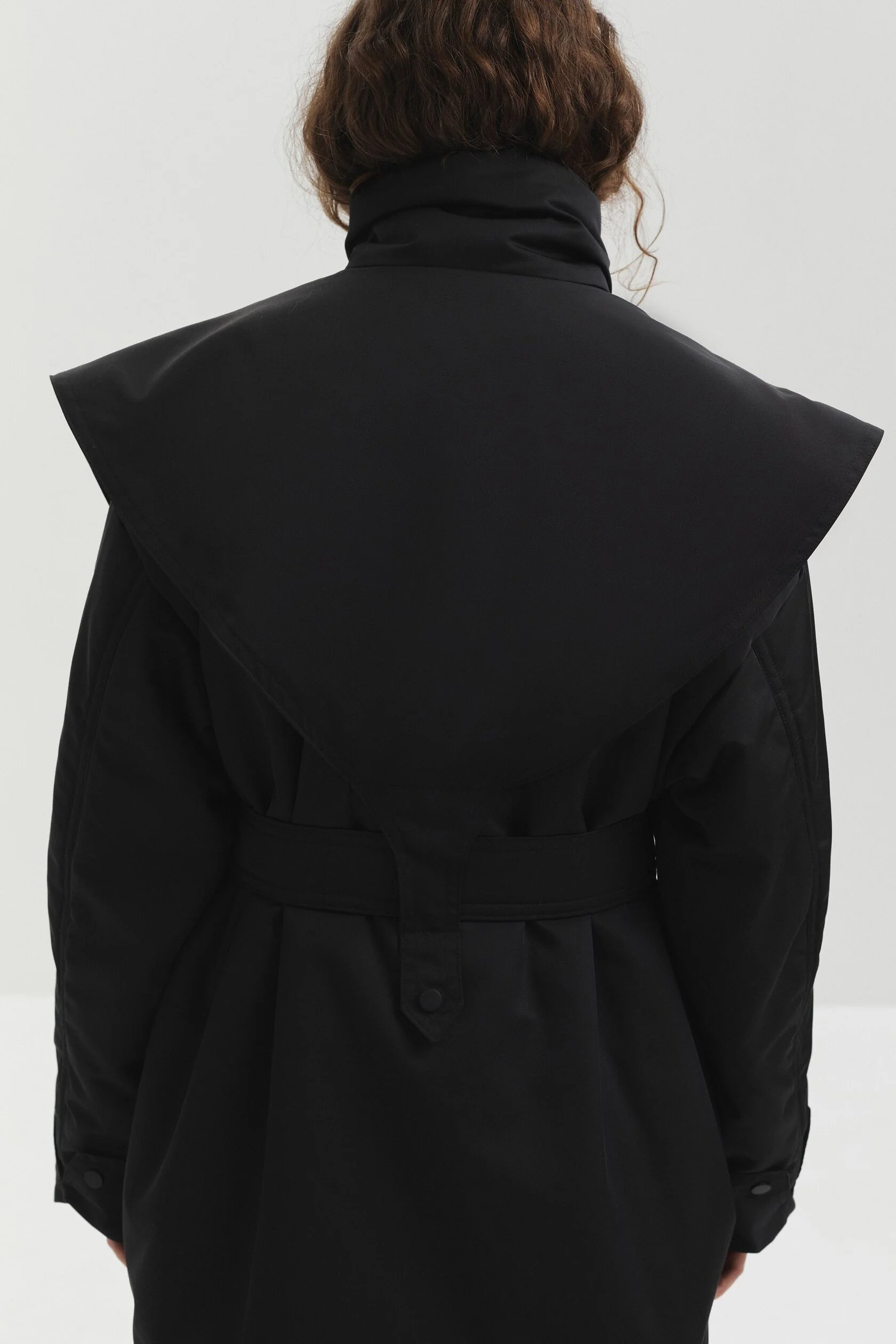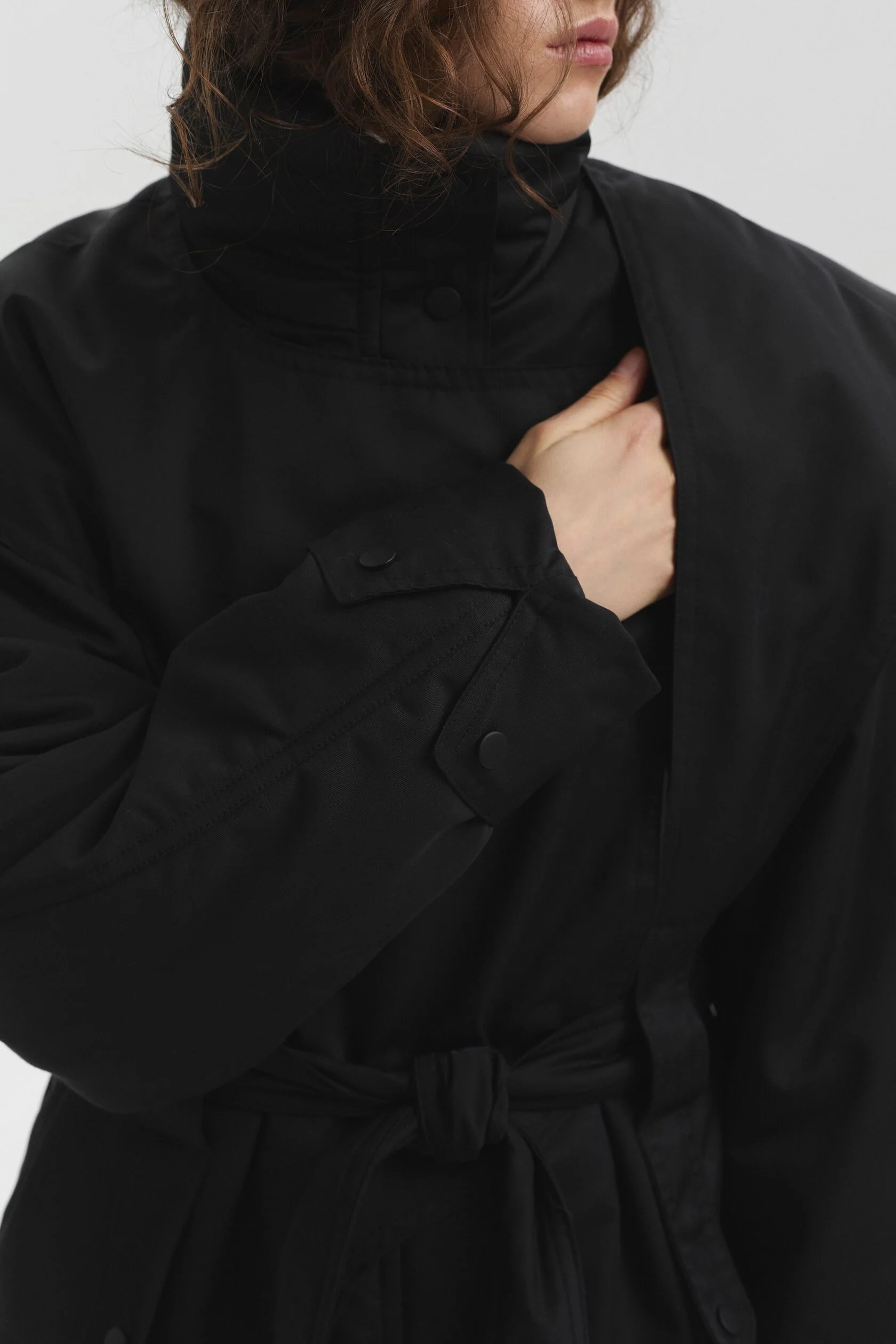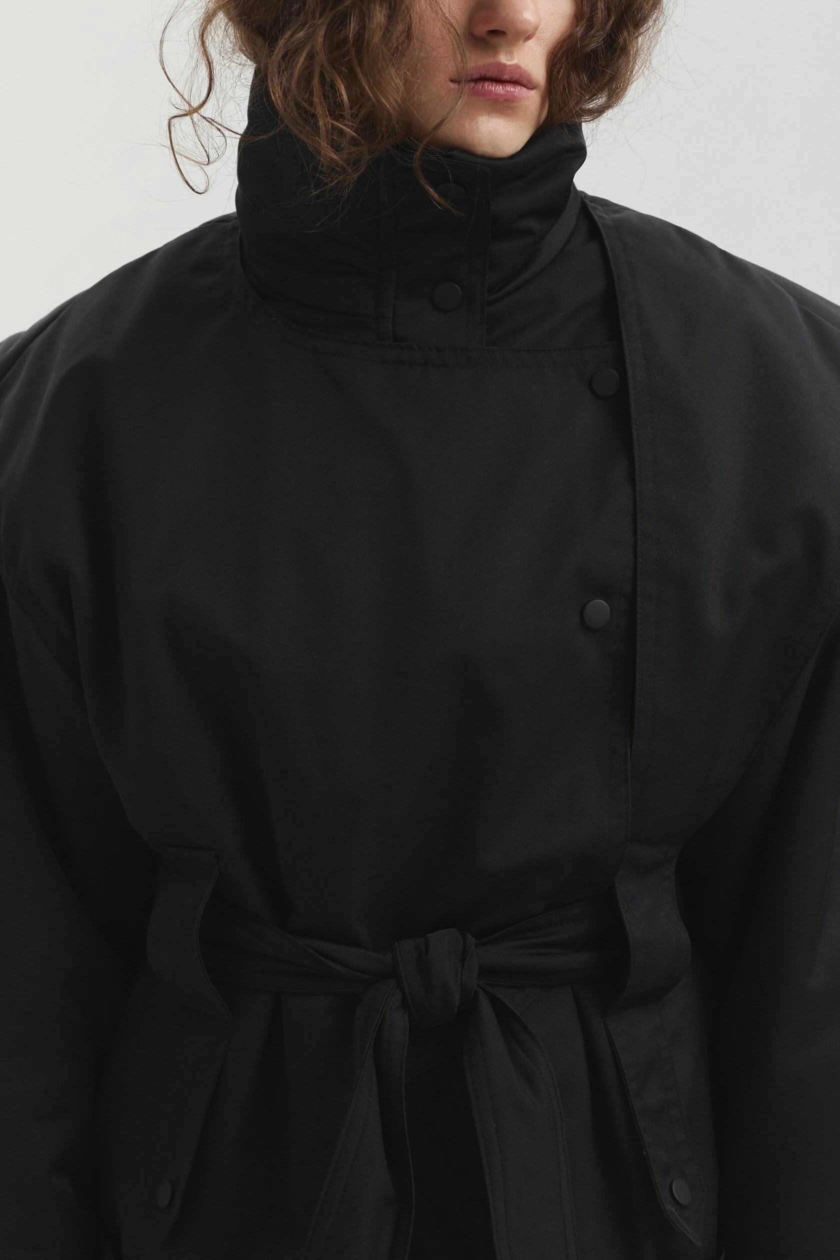 Куртка выполнена из мембранной ткани с водоотталкивающей пропиткой. Высокий воротник защищает от ветра и служит выразительной акцентной деталью. Конструктивные элементы придают изделию утончённый силуэт, а с помощью пояса прямой крой легко превращается в приталенный.