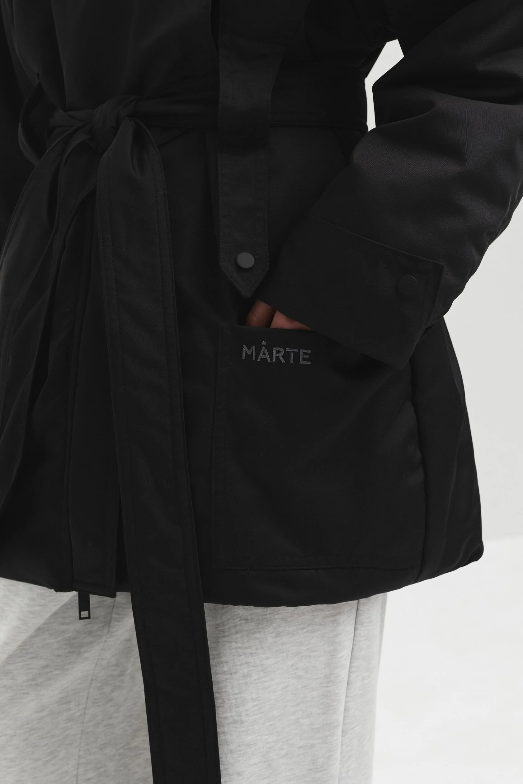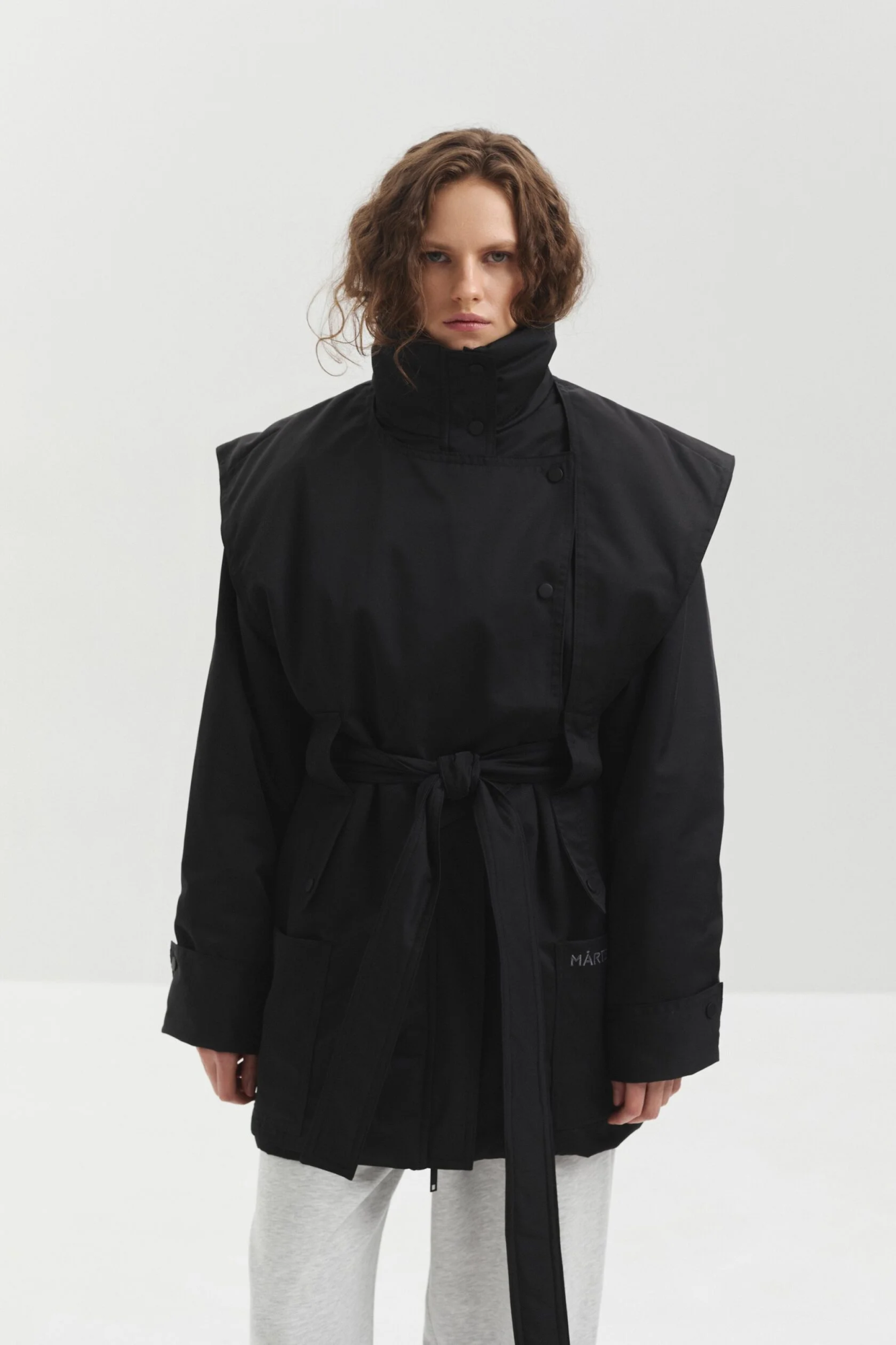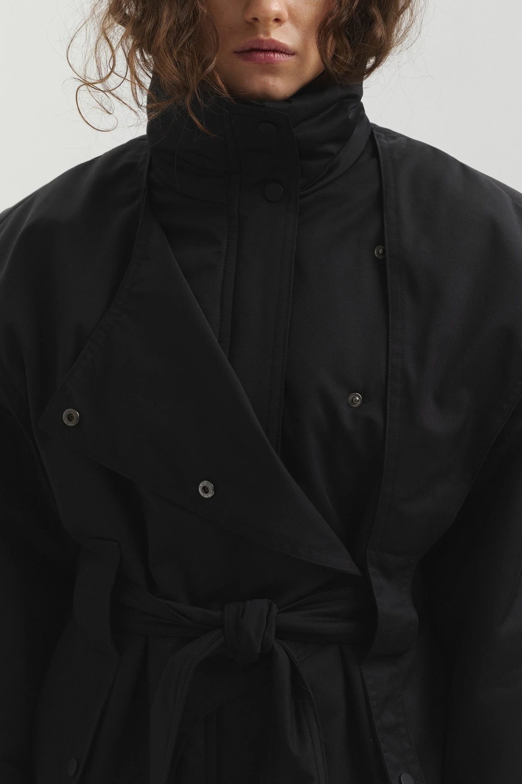Куртка выполнена из мембранной ткани с водоотталкивающей пропиткой. Высокий воротник защищает от ветра и служит выразительной акцентной деталью. Конструктивные элементы придают изделию утончённый силуэт, а с помощью пояса прямой крой легко превращается в приталенный.
