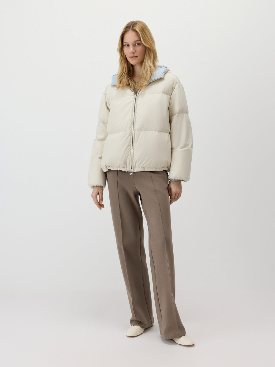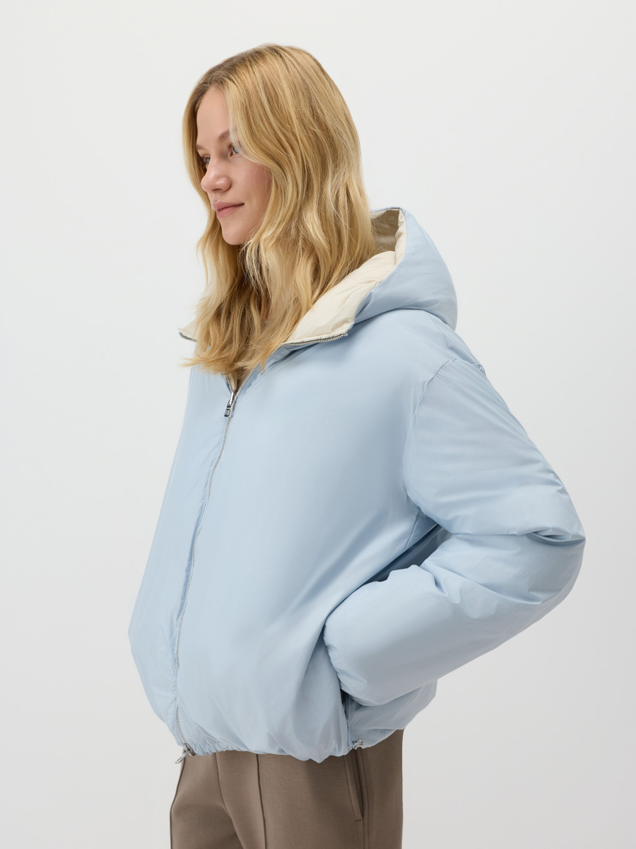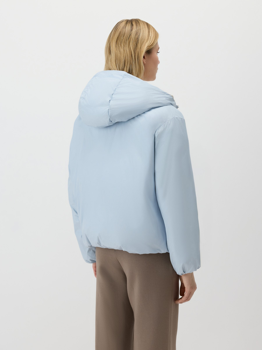 Двусторонняя куртка со стежкой, выполненная в разных цветах снаружи и изнутри. Модель прямого силуэта сшита из облегченной матовой ткани с наполнителем пух-перо. Несъемный анатомический капюшон, резинка внутри рукавов и кулиса по низу удерживают тепло. Молния расстегивается сверху и снизу, а боковые карманы незаметно встроены в швы.