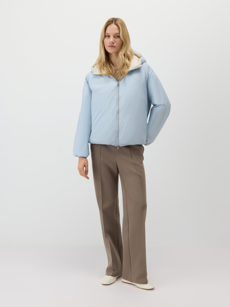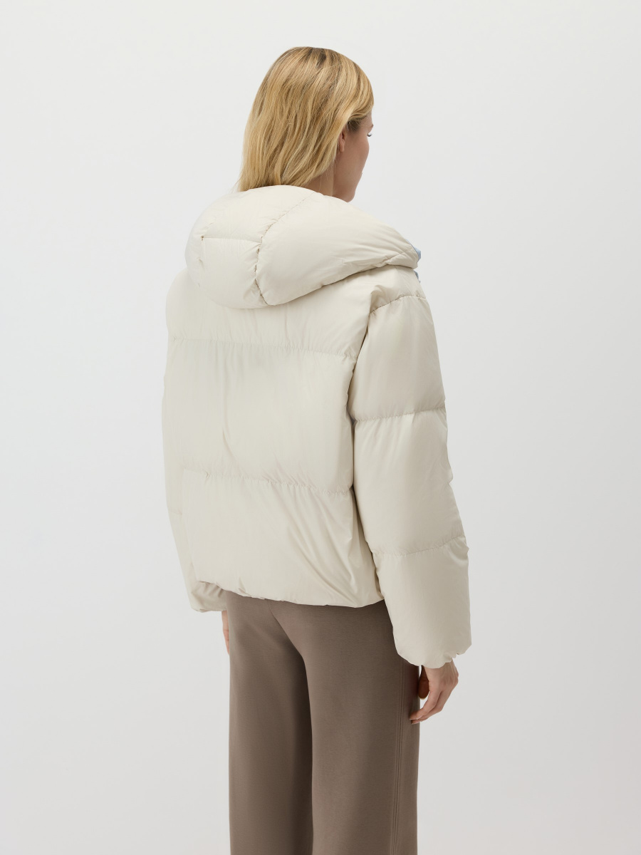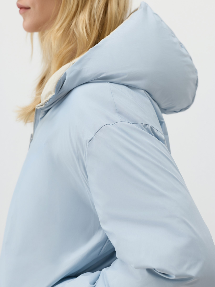 Двусторонняя куртка со стежкой, выполненная в разных цветах снаружи и изнутри. Модель прямого силуэта сшита из облегченной матовой ткани с наполнителем пух-перо. Несъемный анатомический капюшон, резинка внутри рукавов и кулиса по низу удерживают тепло. Молния расстегивается сверху и снизу, а боковые карманы незаметно встроены в швы.