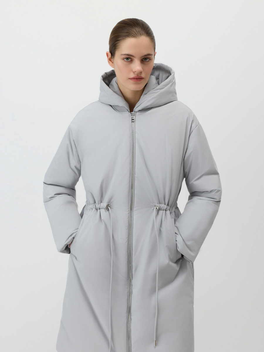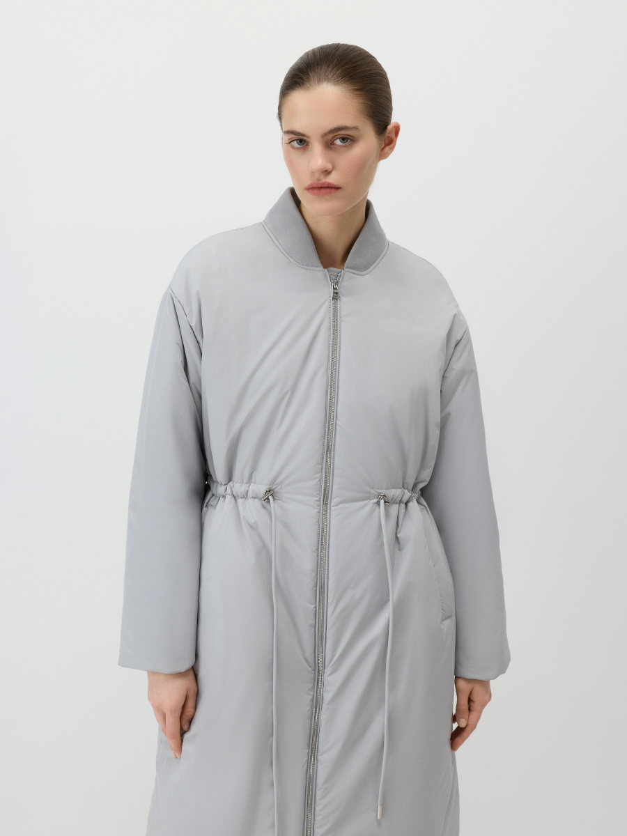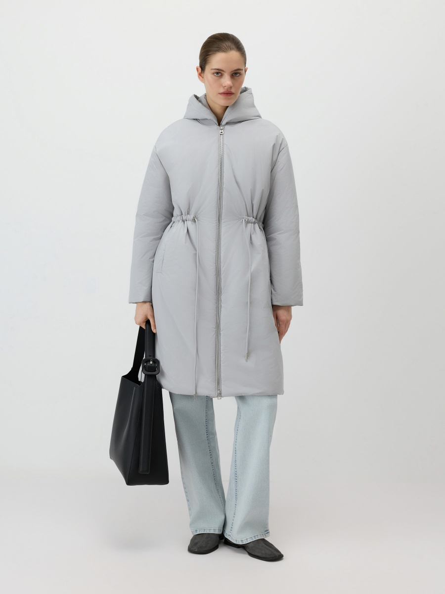 Утепленное пальто на молнии для первых холодных недель межсезонья. Удлиненная модель из прочной непродуваемой ткани, синтепоновым наполнителем и съемным анатомическим капюшоном. Прямой свободный крой регулируется двумя кулисами — на талии и по низу. Манжеты и воротник выполнены из мягкого трикотажа, а вместительные боковые карманы застегиваются на кнопки.