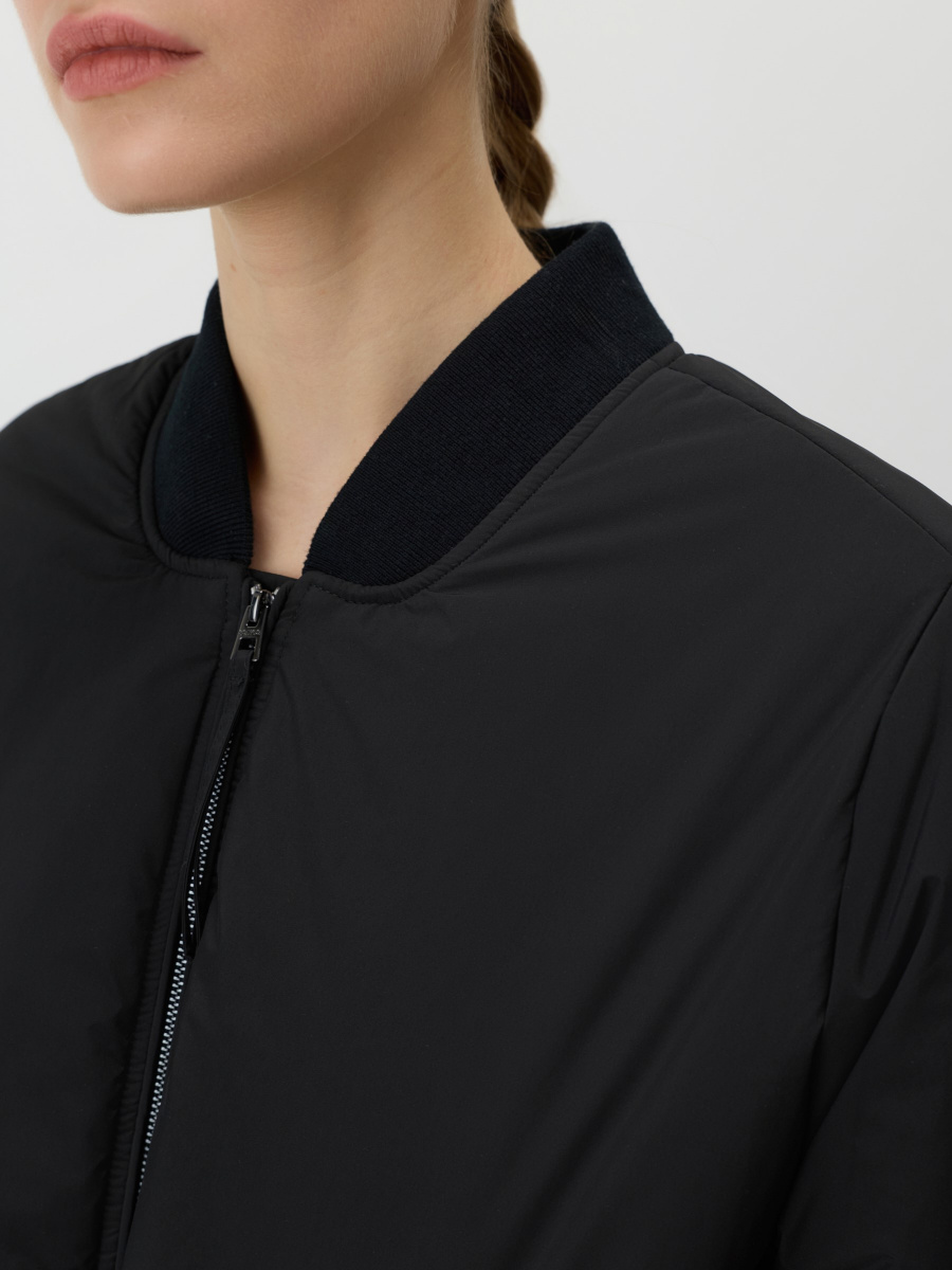 Куртка-бомбер из легкой непродуваемой ткани с синтепоновым наполнителем для прохладного межсезонья. Выполнена с мягким трикотажным воротником и манжетами. Под металлической молнией ветрозащитная планка, внутри по низу — кулиса для регулировки объема. Вместительные боковые карманы.