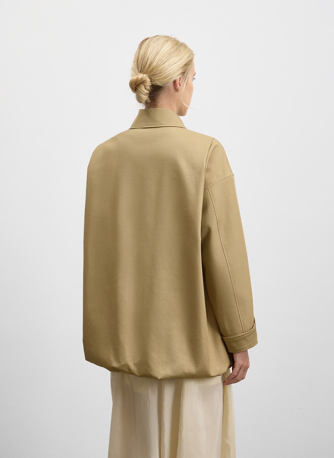 Двойные отстрочки акцентируют внимание на линиях силуэта, а кулиска на талии позволяет регулировать посадку. Спинку изделия мы выполнили в такой же технике, как и юбку-баллон, для создания объёма.