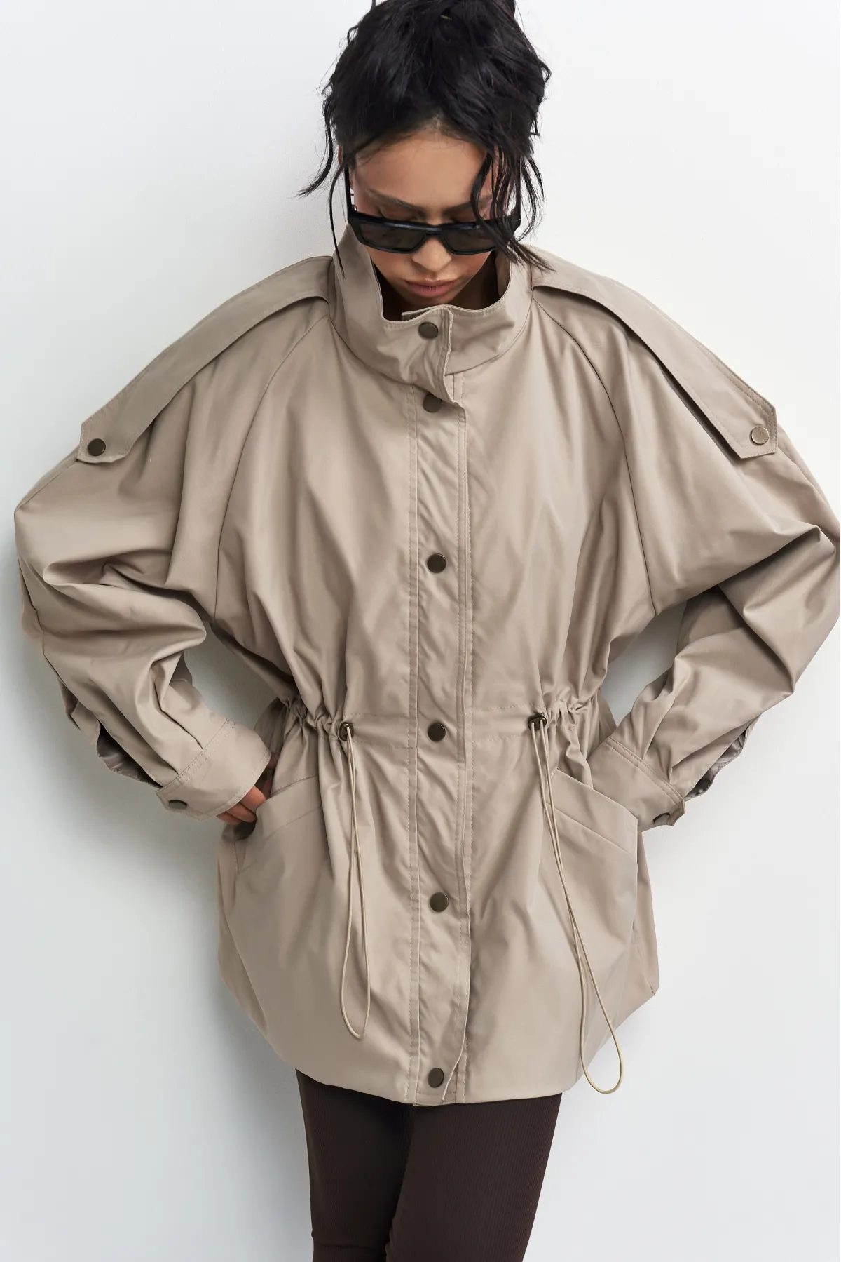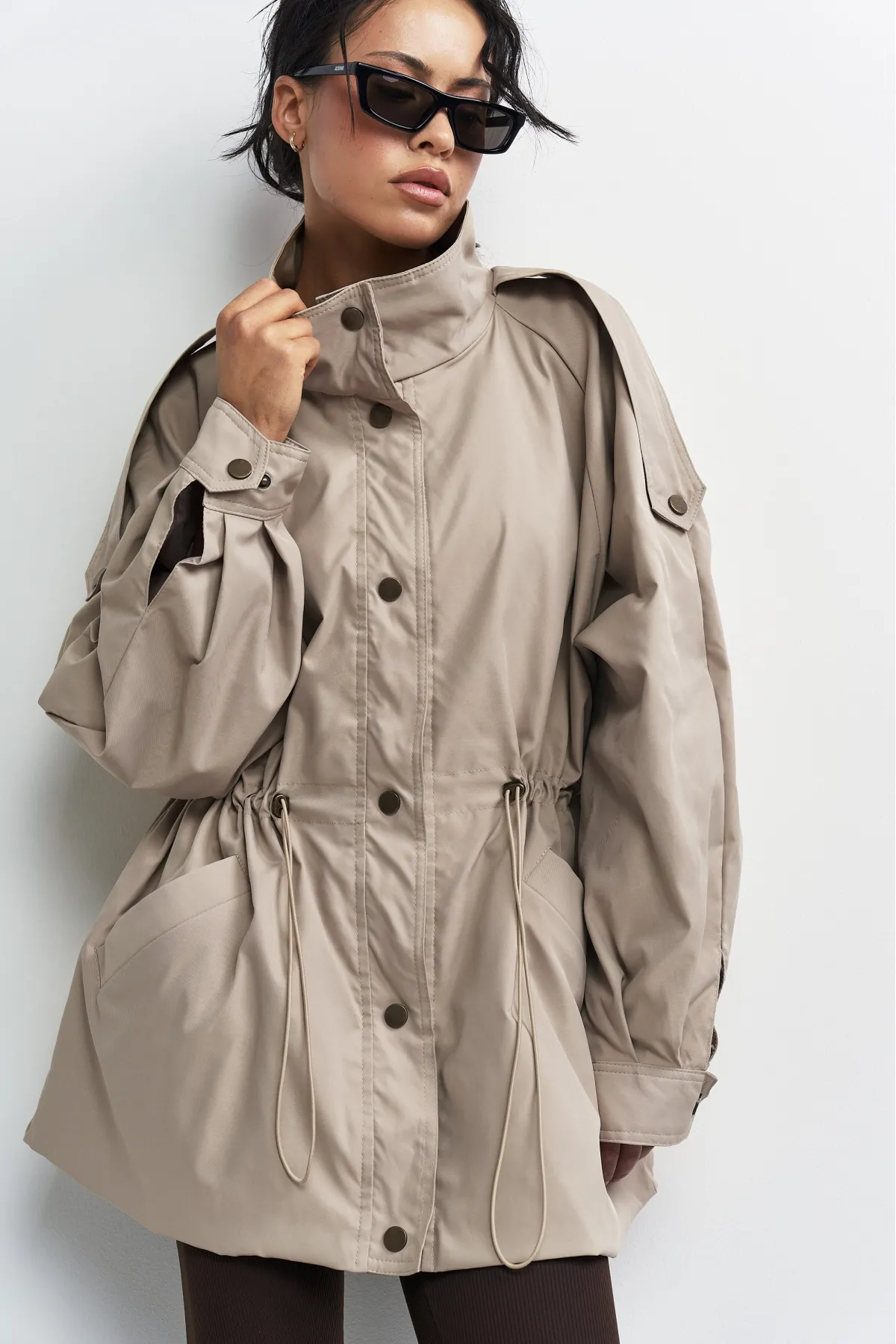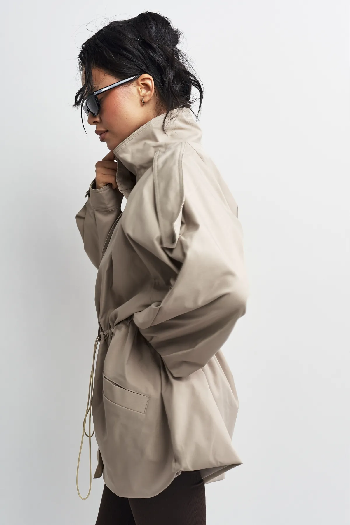 Объемная куртка-реглан на кулиске создана для стильных повседневных образов и динамичной жизни в городе — носите ее с джинсами и обувью на плоском ходу.