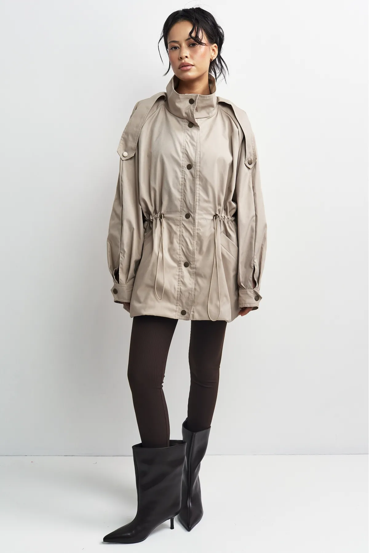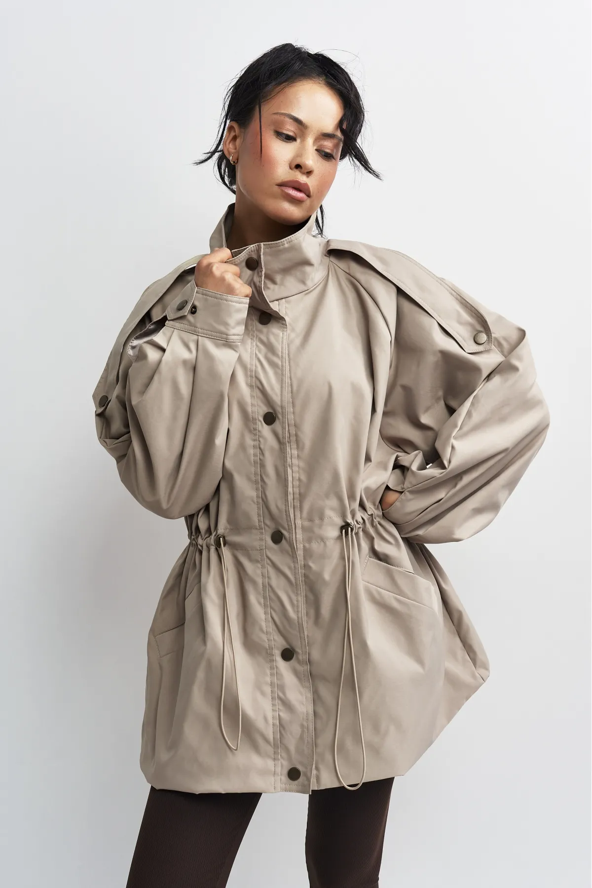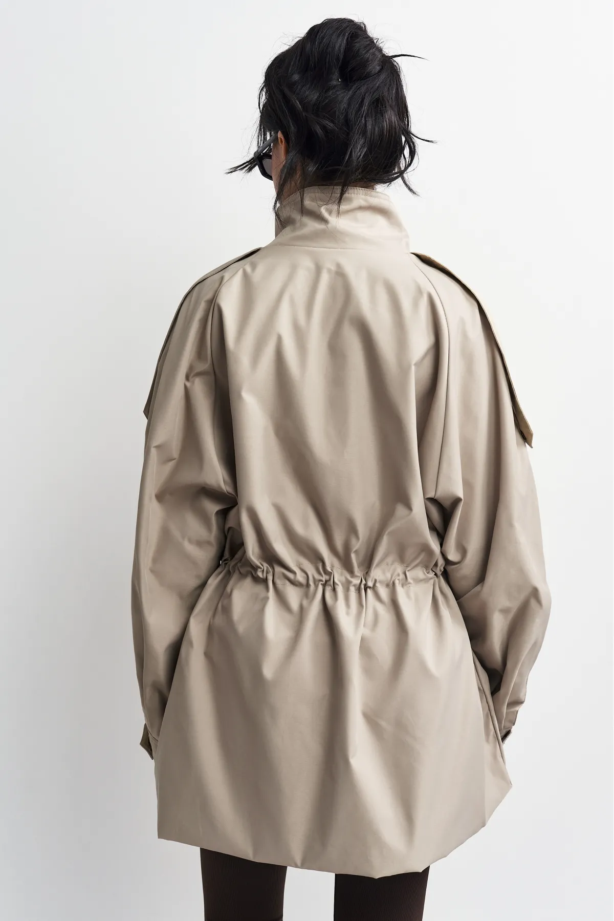Объемная куртка-реглан на кулиске создана для стильных повседневных образов и динамичной жизни в городе — носите ее с джинсами и обувью на плоском ходу.