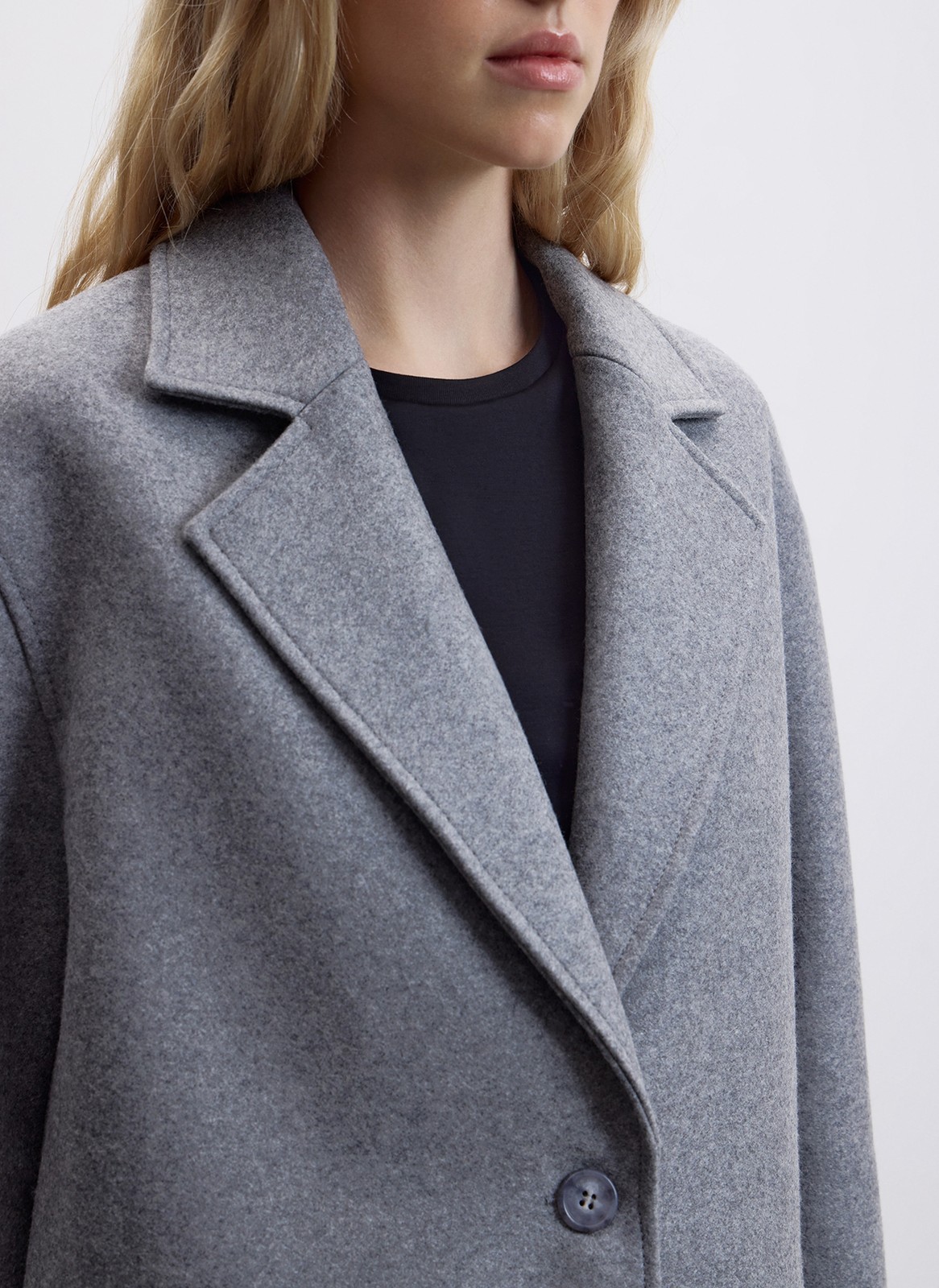 Комбинация шерсти высокого качества и нежного кашемира обеспечивает особую мягкость. Благодаря составу фактура пальто приобретает благородный лоск и блеск.