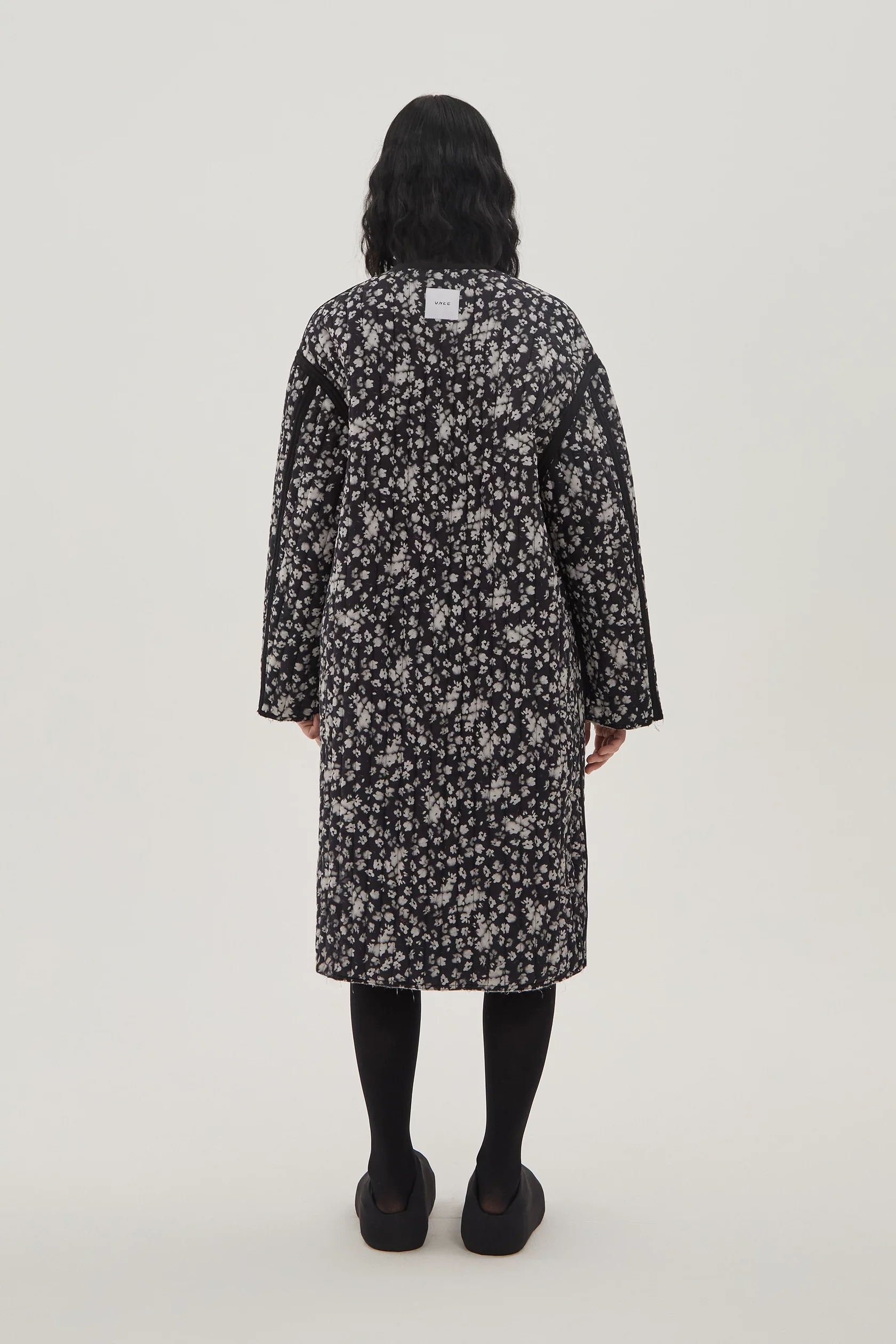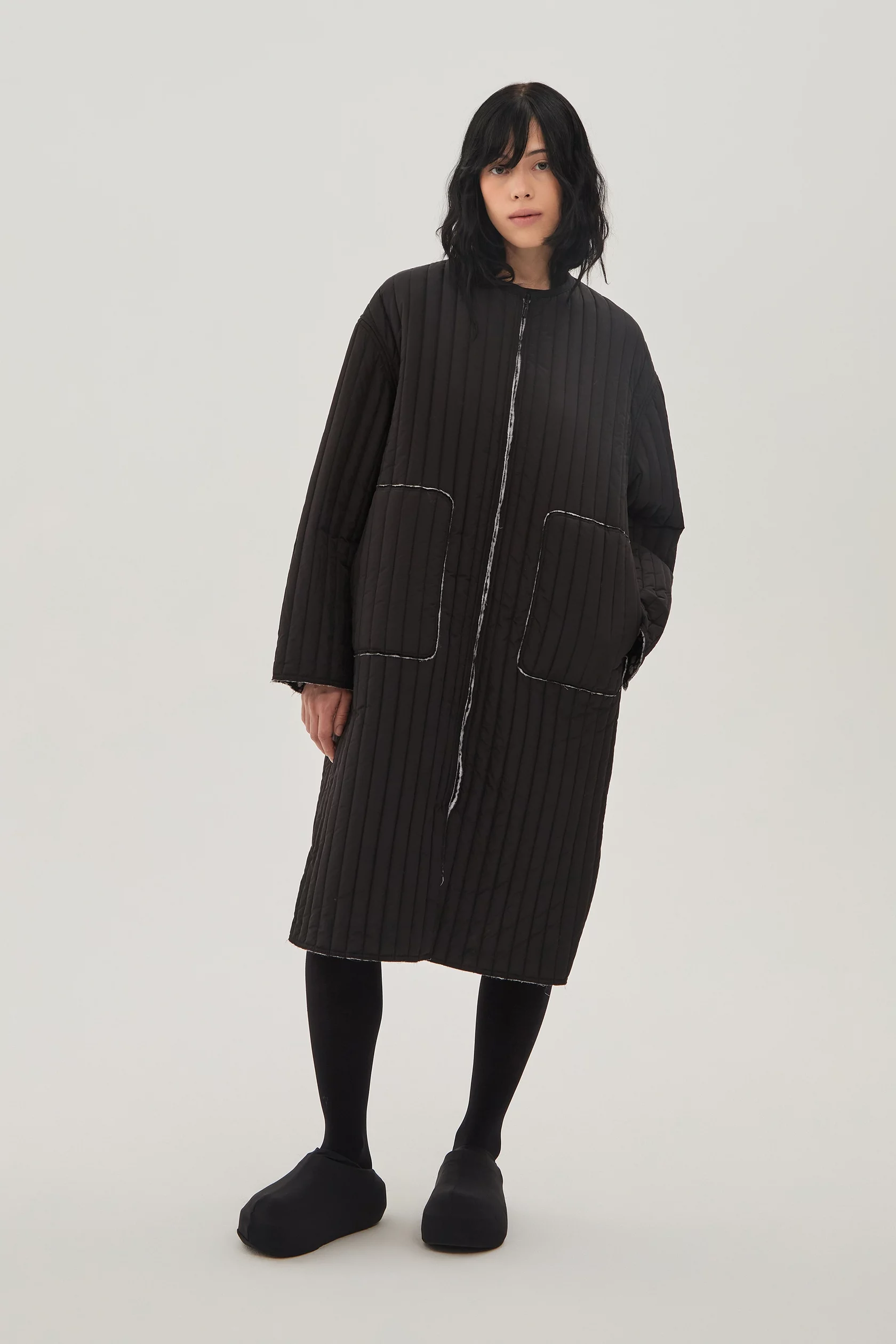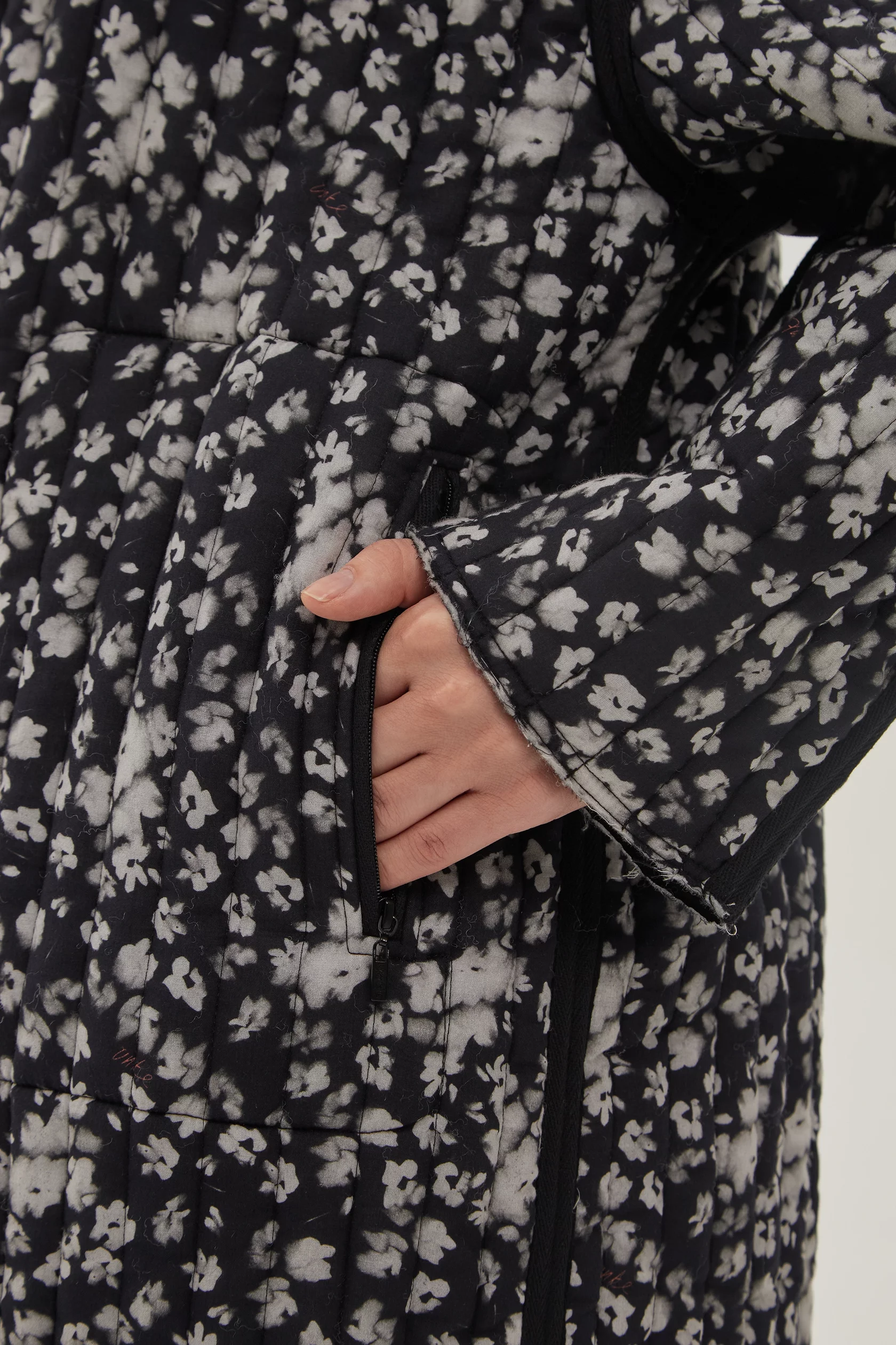 Стеганое пальто на тонком лекгом утеплителе. Верхняя ткань - ветро- и влагозащитная, внутренняя ткань - хлопок с почерковым принтом в виде размытых цветов. Эту вещь можно носить как черной стороной наверх, так и цветочной, обе стороны имеют карманы. Застежка на молнию, карманы, низ и низ рукавов специально обработаны с открытым срезом для придания ощущения незавершенности.