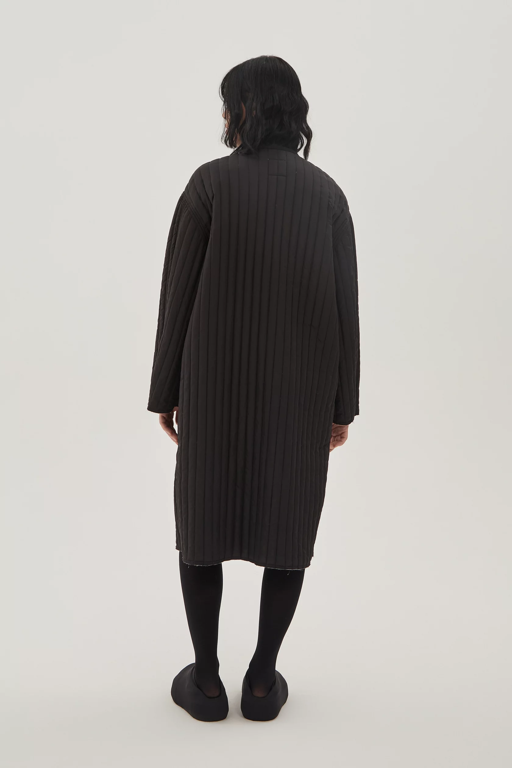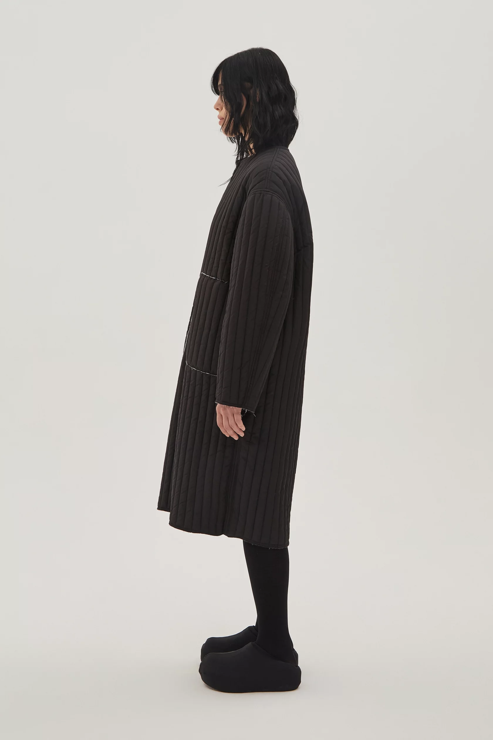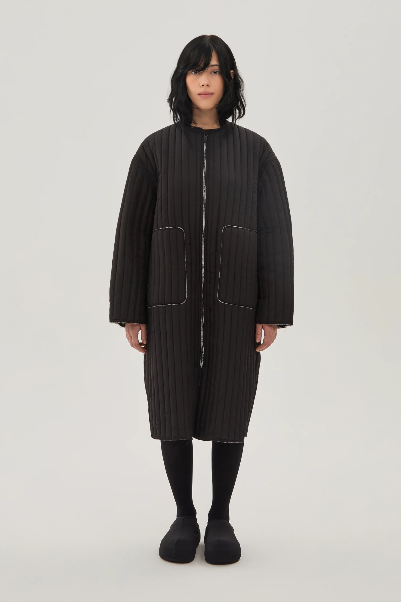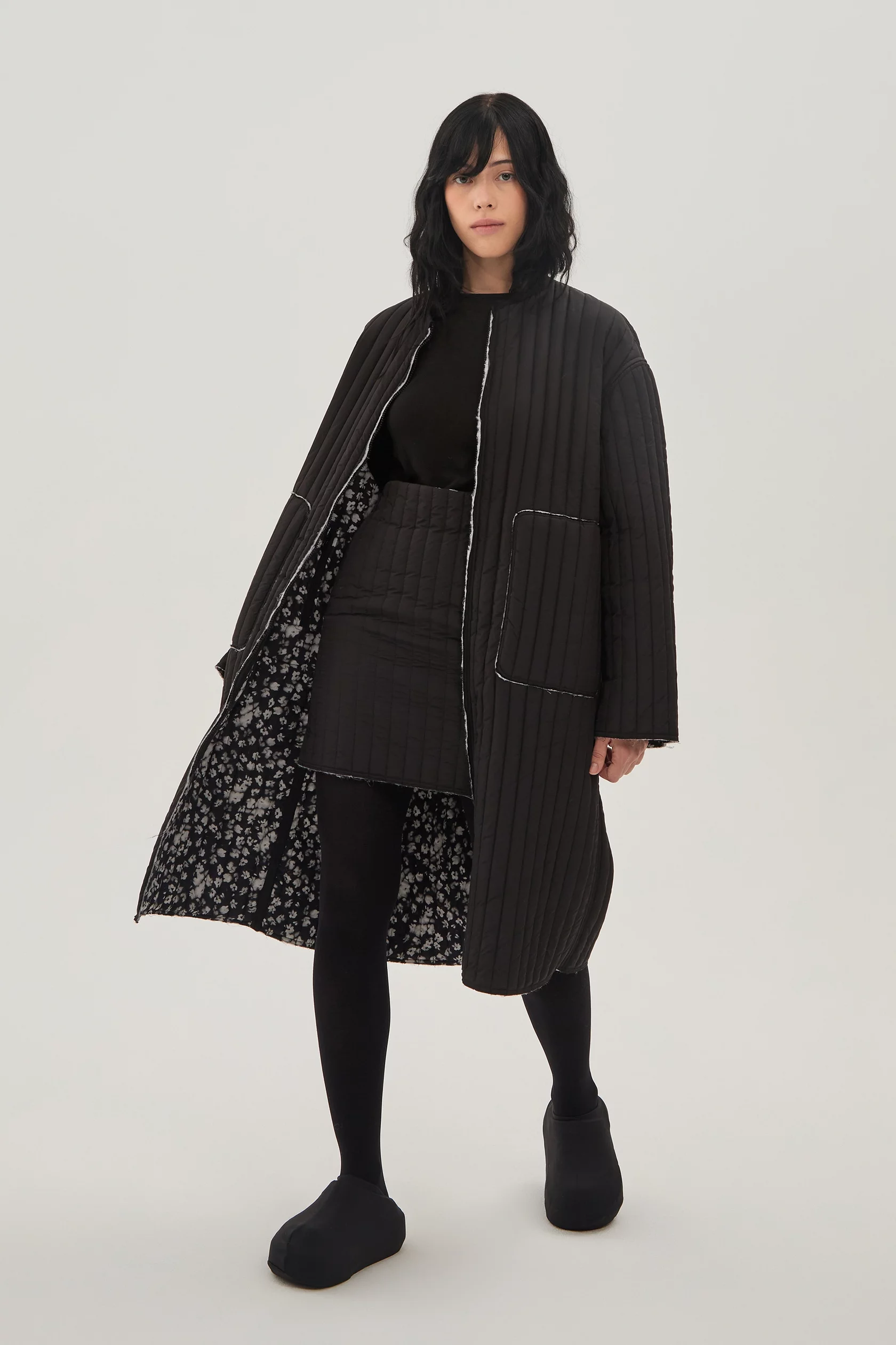 Стеганое пальто на тонком лекгом утеплителе. Верхняя ткань - ветро- и влагозащитная, внутренняя ткань - хлопок с почерковым принтом в виде размытых цветов. Эту вещь можно носить как черной стороной наверх, так и цветочной, обе стороны имеют карманы. Застежка на молнию, карманы, низ и низ рукавов специально обработаны с открытым срезом для придания ощущения незавершенности.