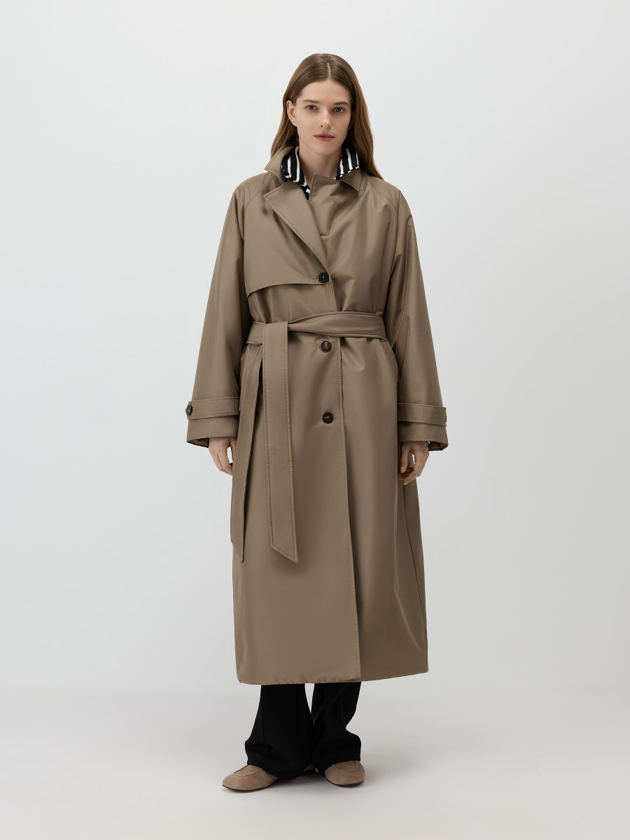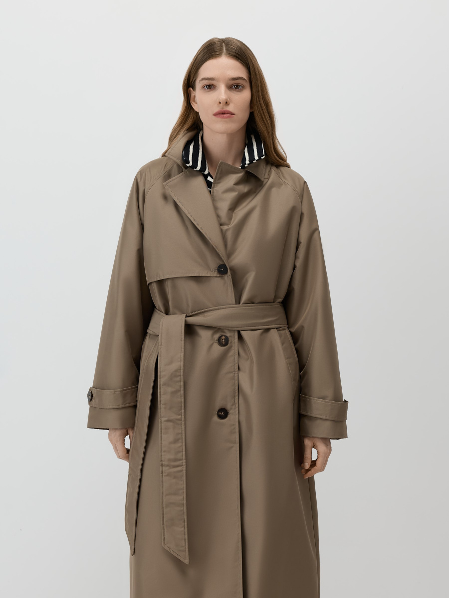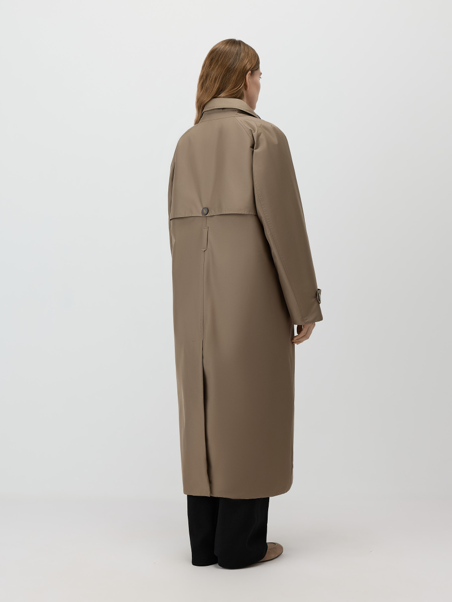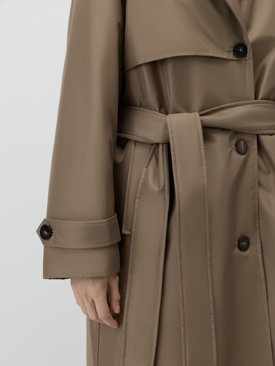 Полупальто-плащ в стиле классического тренча, выполненное в утепленном варианте. Модель сшита из плотной плащевой ткани и дополнена теплой стеганой подкладкой. Съемная манишка с капюшоном помогает защититься от ветра и холода. Рукава оформлены декоративными хлястиками с пуговицами, на спинке предусмотрена шлица для свободы шага.