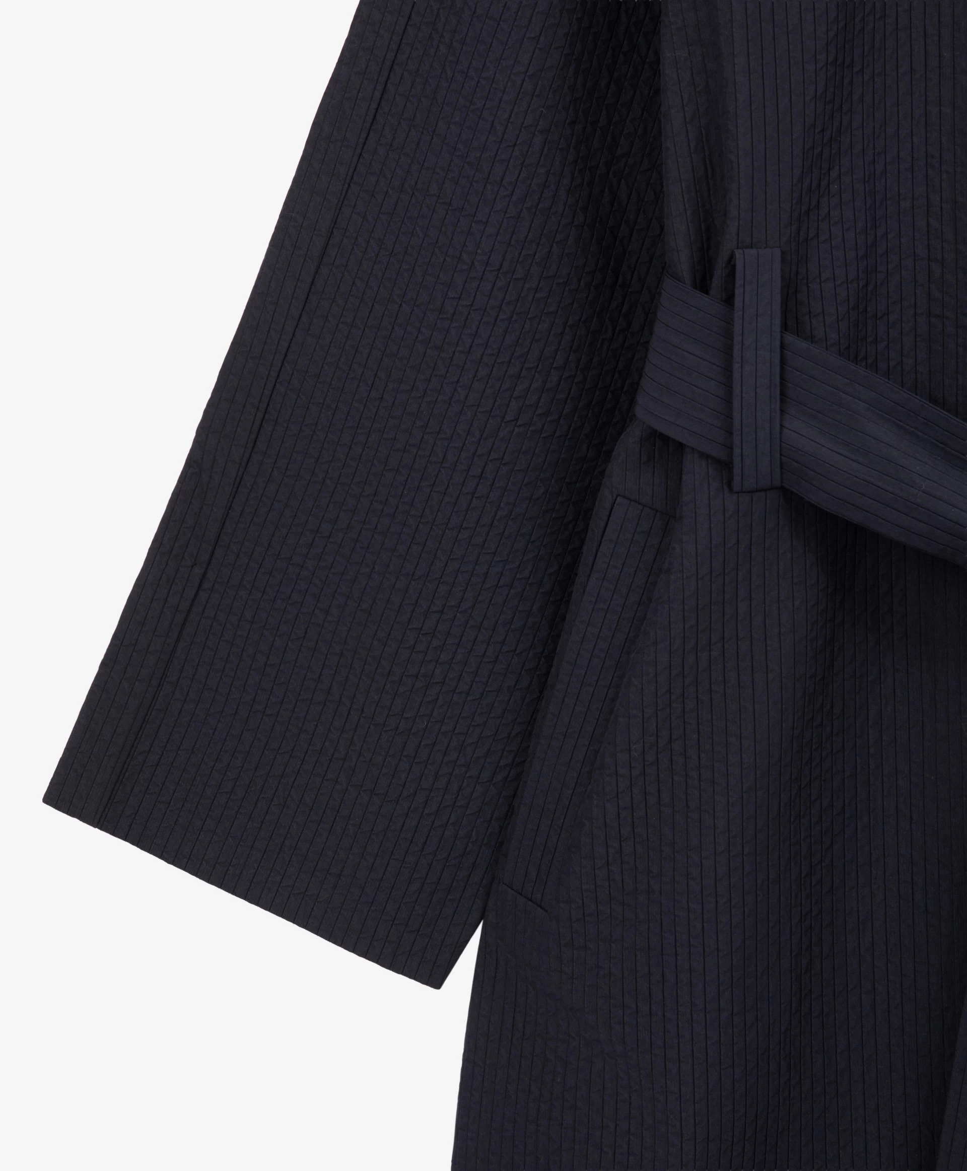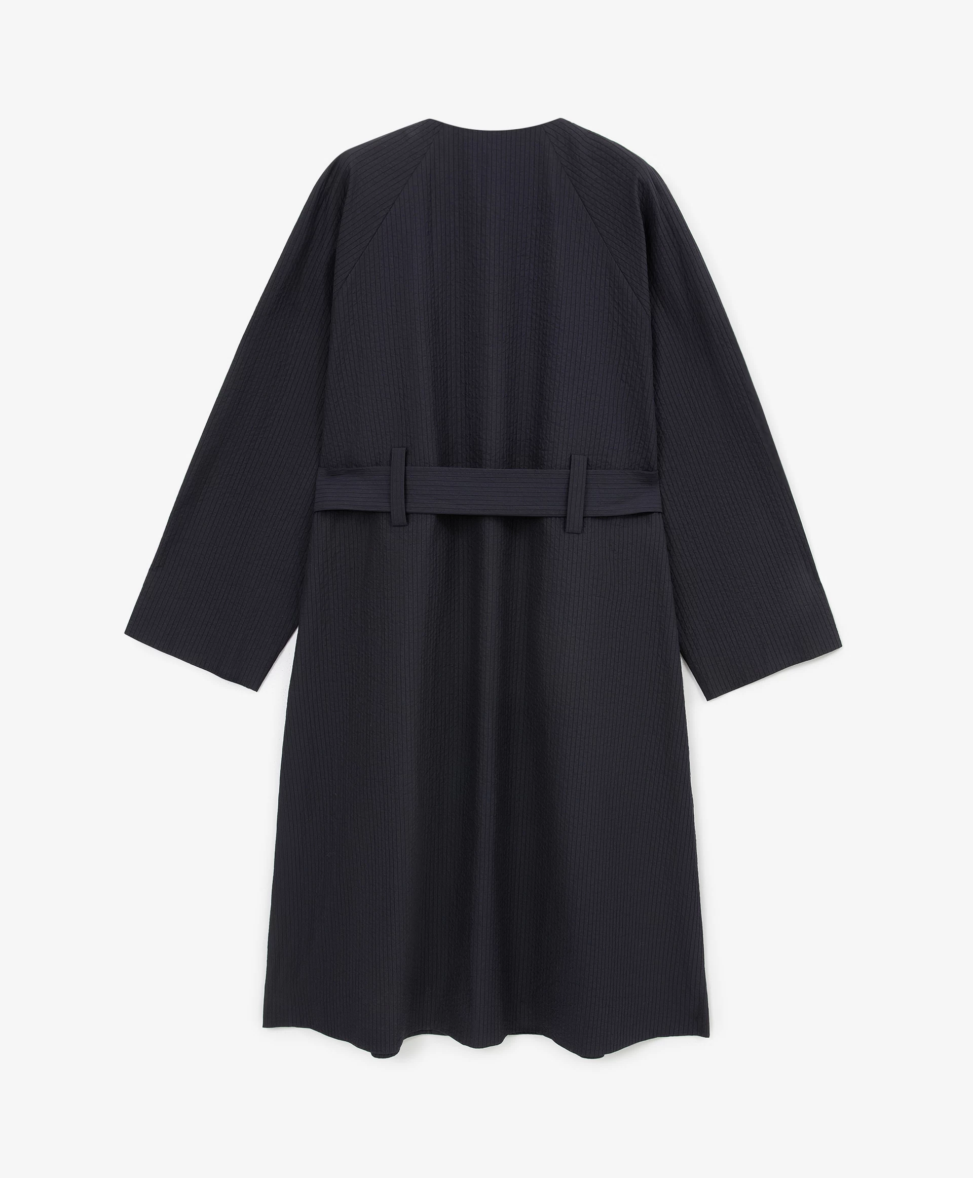 Когда настроение требует сезонного обновления, но погода напоминает о том, что жаркие дни еще впереди, легкий плащ без подкладки - прекрасная возможность для завершения весенне-летних образов. Плащ-пыльник прямой свободной формы выполнен из ткани с доминирующим содержанием хлопка, имеющей выразительную вертикальную жатую структуру. Он прекрасно держит форму, очень приятен при тактильном контакте, практичен, неприхотлив в уходе. Форма модели с рукавами реглан делает силуэт мягким и женственным. О-образная горловина без воротника, а также застежка на металлические пришивные кнопки, невидимые снаружи, подчеркивают строгость и минималистичность дизайнерского решения. Длинные шлевки придают плащу элегантность, а также имеют немаловажное функциональное значение, позволяя завязывать пояс на нескольких уровнях, удовлетворяя потребности женщин разного роста. Карманы-листочки создают удобство в эксплуатации вещи.
