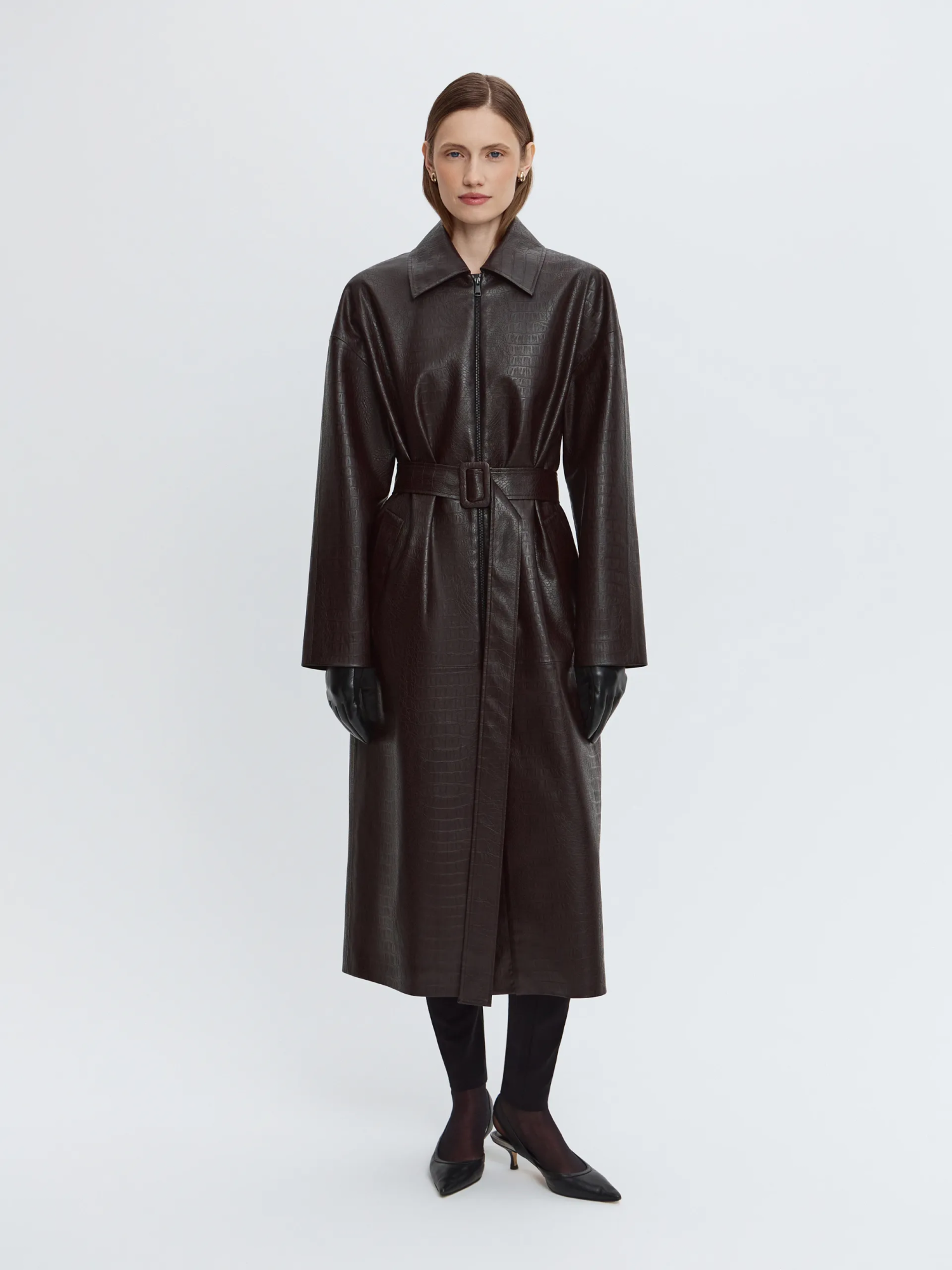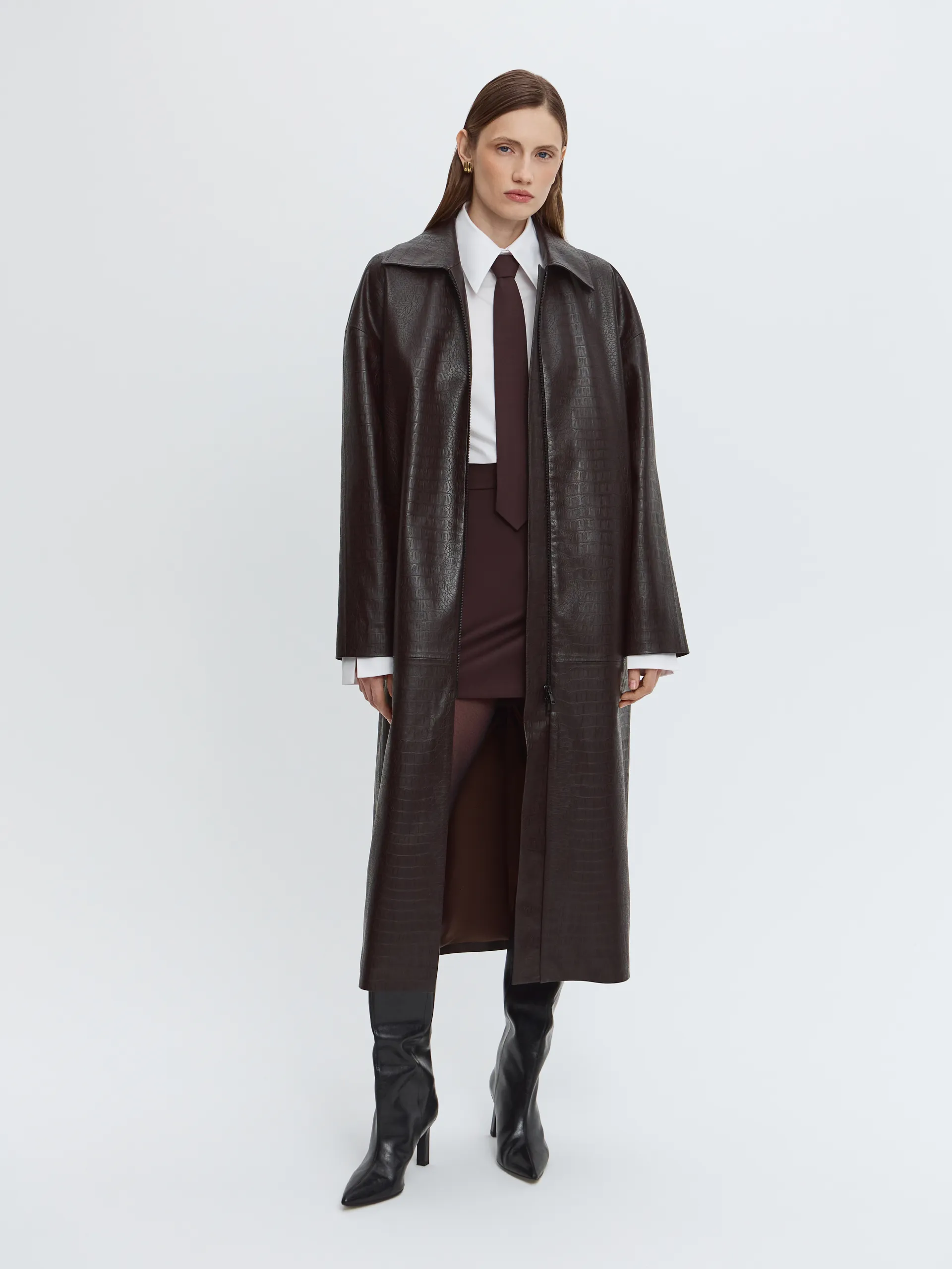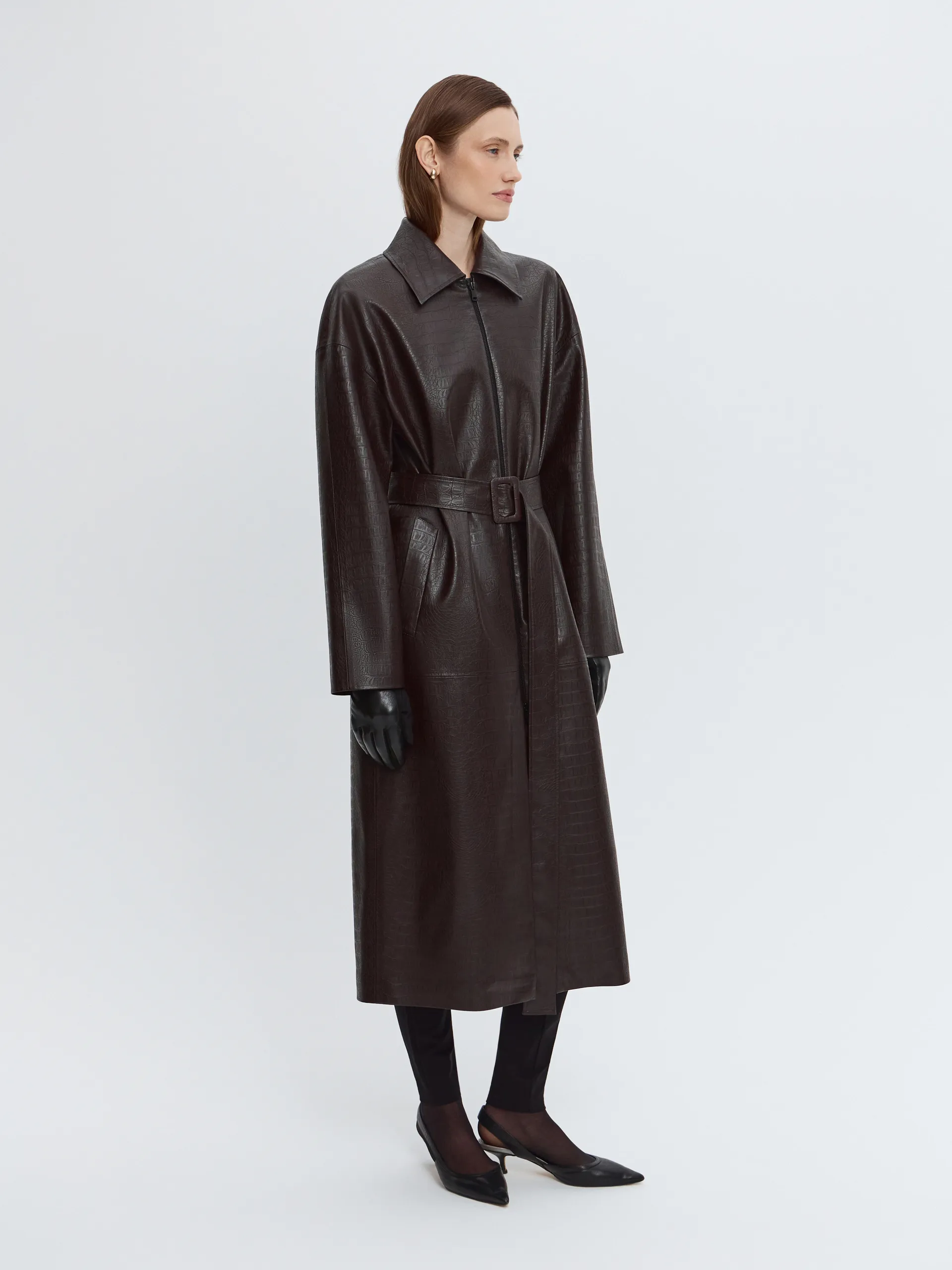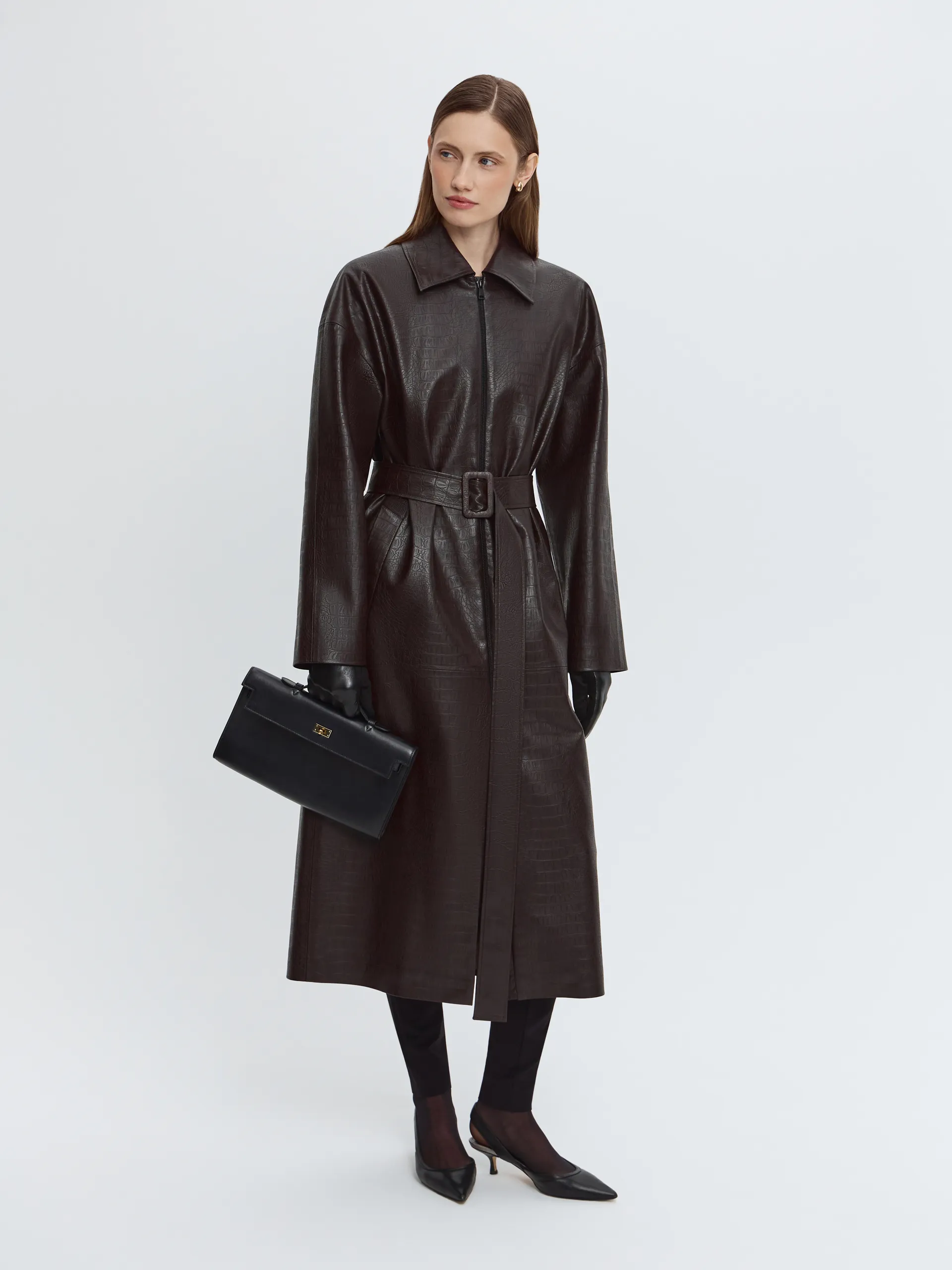 Модель длины миди выполнена из фактурной экокожи в шоколадном оттенке. Мягкая пластика материала позволяет плащу красиво драпироваться при завязывании пояса, формируя выразительный силуэт. Застёжка на молнии добавляет функциональности и подчёркивает современный характер модели. Плащ легко адаптируется под разные стили и смотрится собранно как в застёгнутом виде, так и нараспашку.