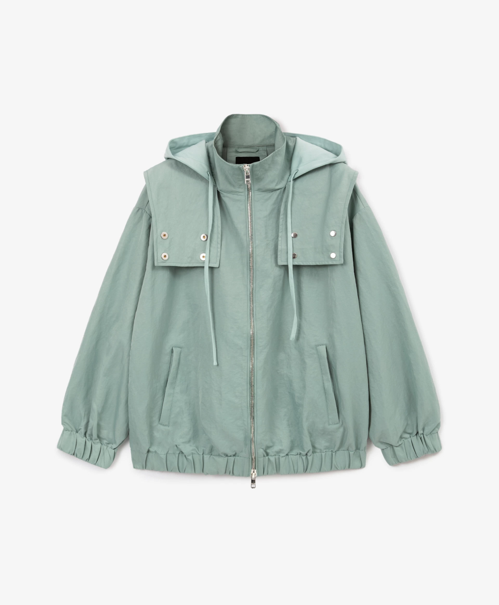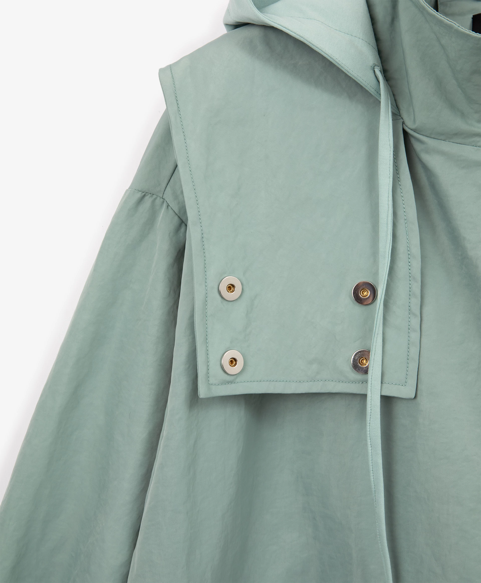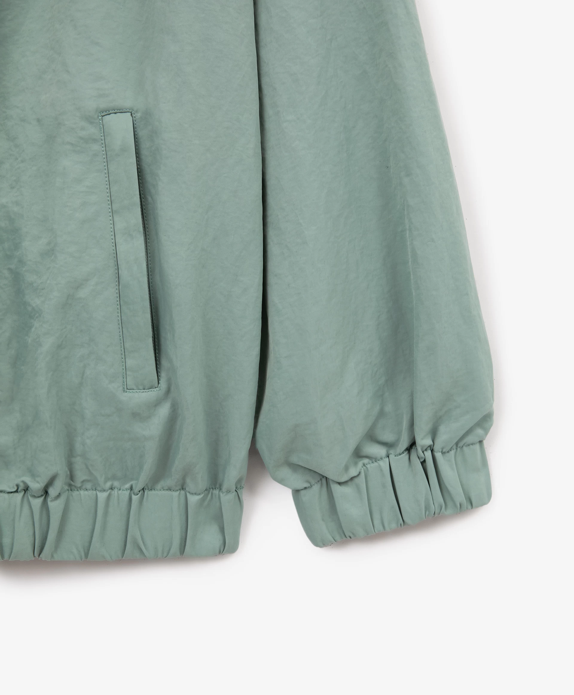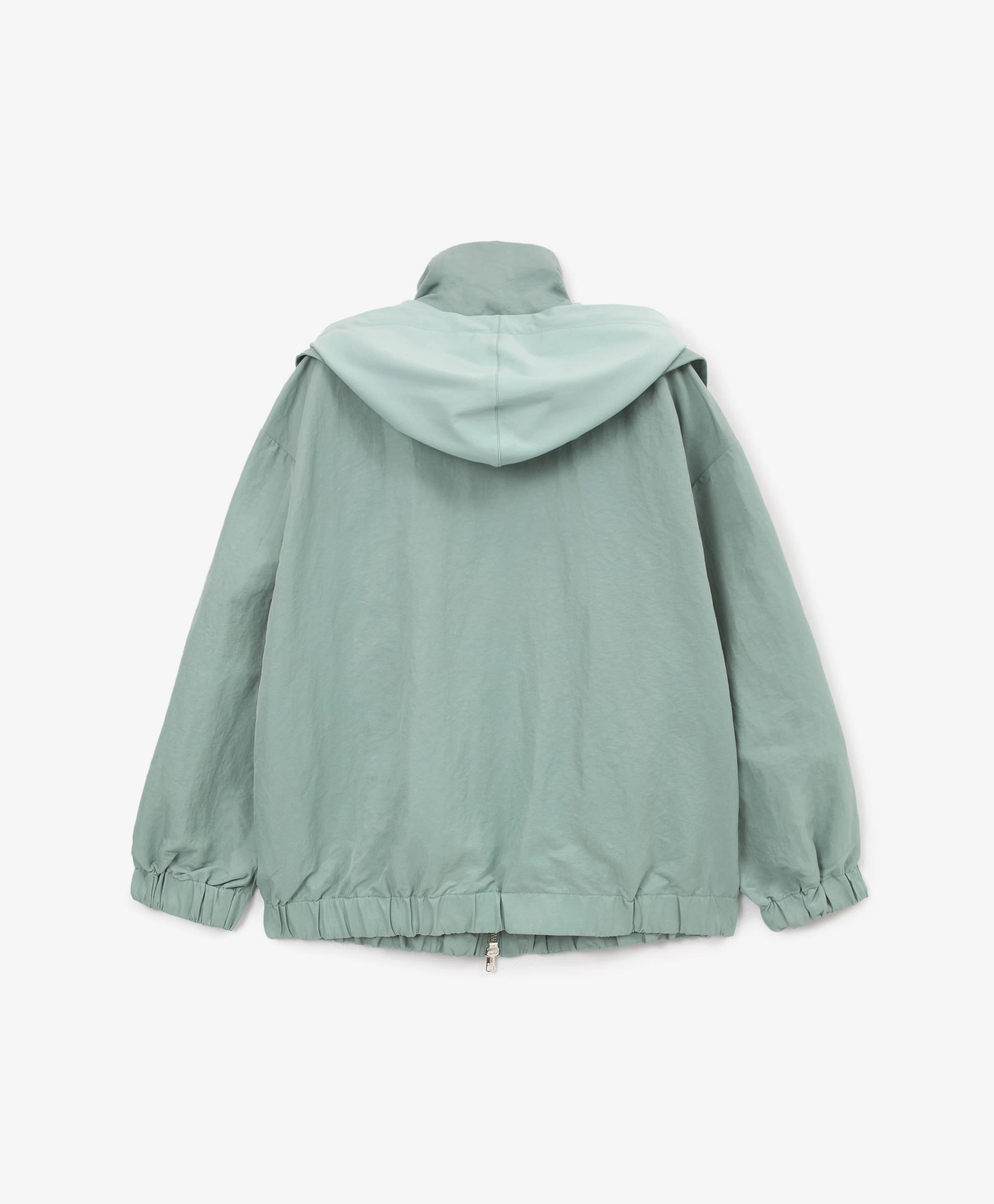 Ветровка силуэта оверсайз из плотной влагостойкой плащовки дополнит гардероб женщины стильной функциональной вещью, которая проявит себя с лучшей стороны в условиях непогоды. Ветровка без подкладки выполнена из формоустойчивой нейлоновой плащовки с легким крэш эффектом. Благородный матовый блеск на интересной деликатной фактуре придает ей особое звучание. Модная форма - бомбер и целый ряд интересных и важных для эксплуатации изделия деталей: удобных прорезных карманов на молнии, металлической молнии с двумя пуллерами на центральной застежке, высокой стойке делают ветровку модной, комфортной, современной. Изюминка модели - неотстегивающийся трикотажный капюшон с кордами из плотного интерлока, усиленный высоким воротником на магнитных кнопках. Капюшон, хоть и не является влагостойким, обеспечивает уют, тепло, приятный тактильный контакт. Кроме того, капюшон подчеркивает интересную игру фактур между матовым трикотажем и скользящей шелковистой плащовкой, создавая стильный акцент.