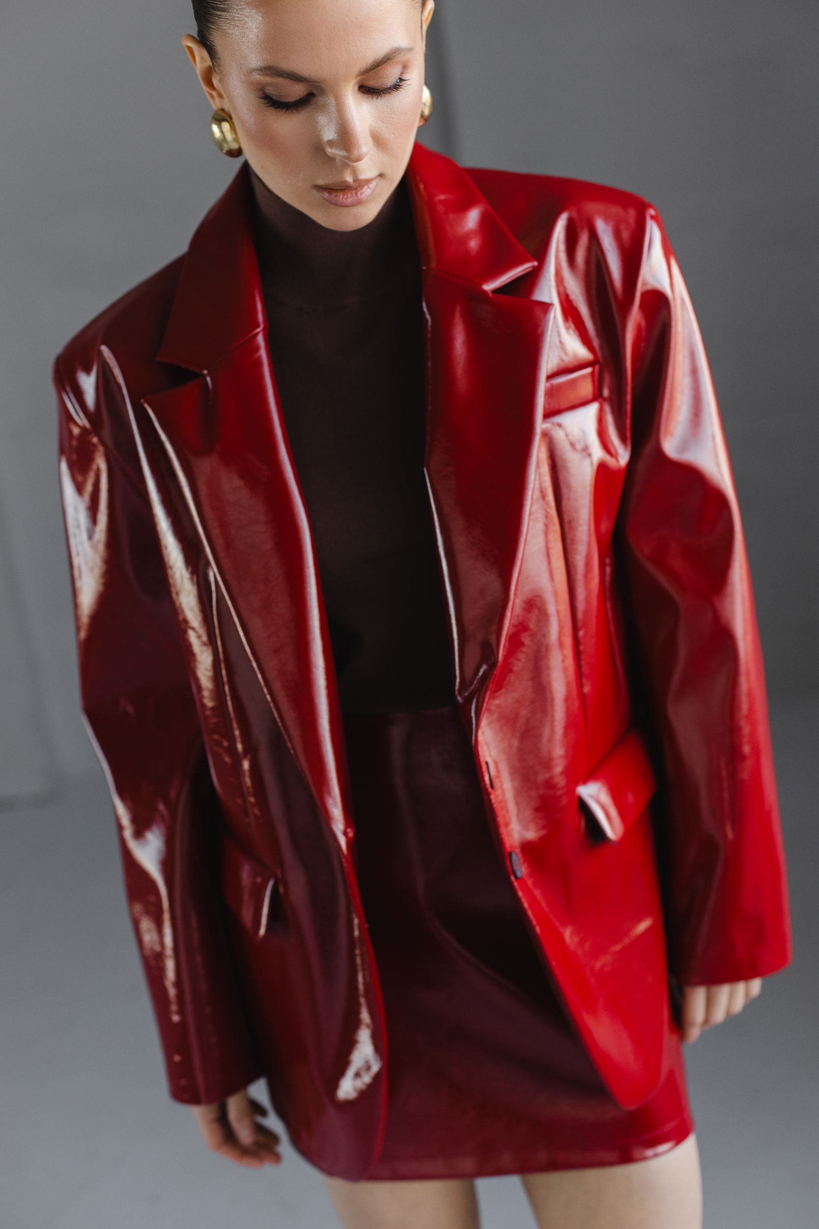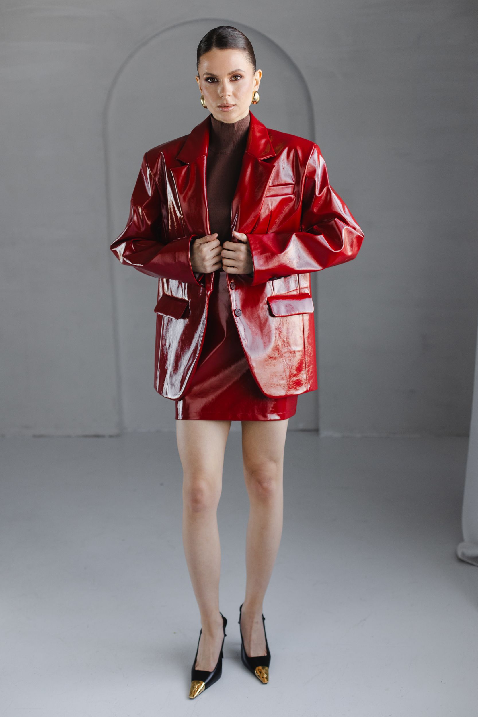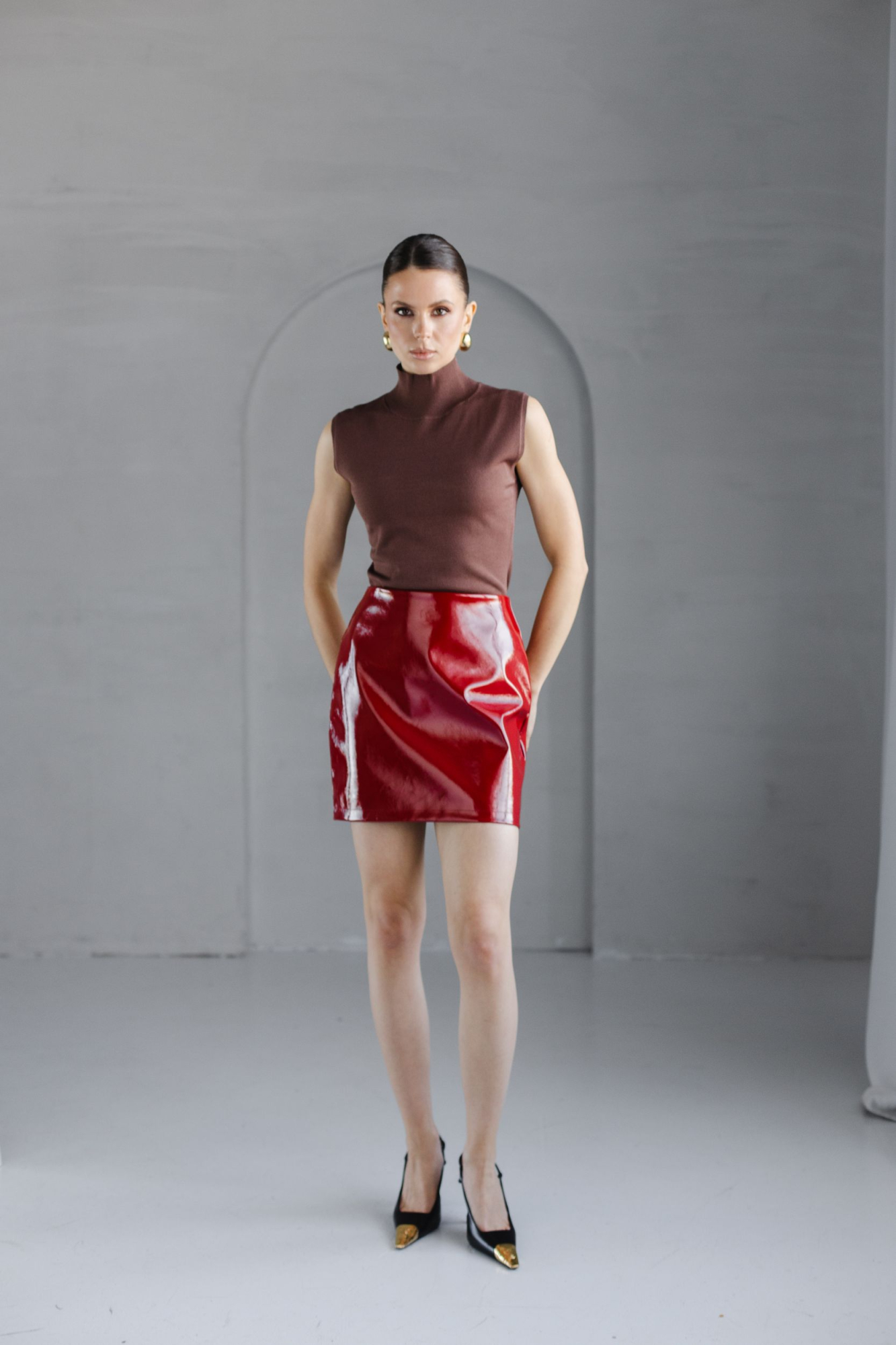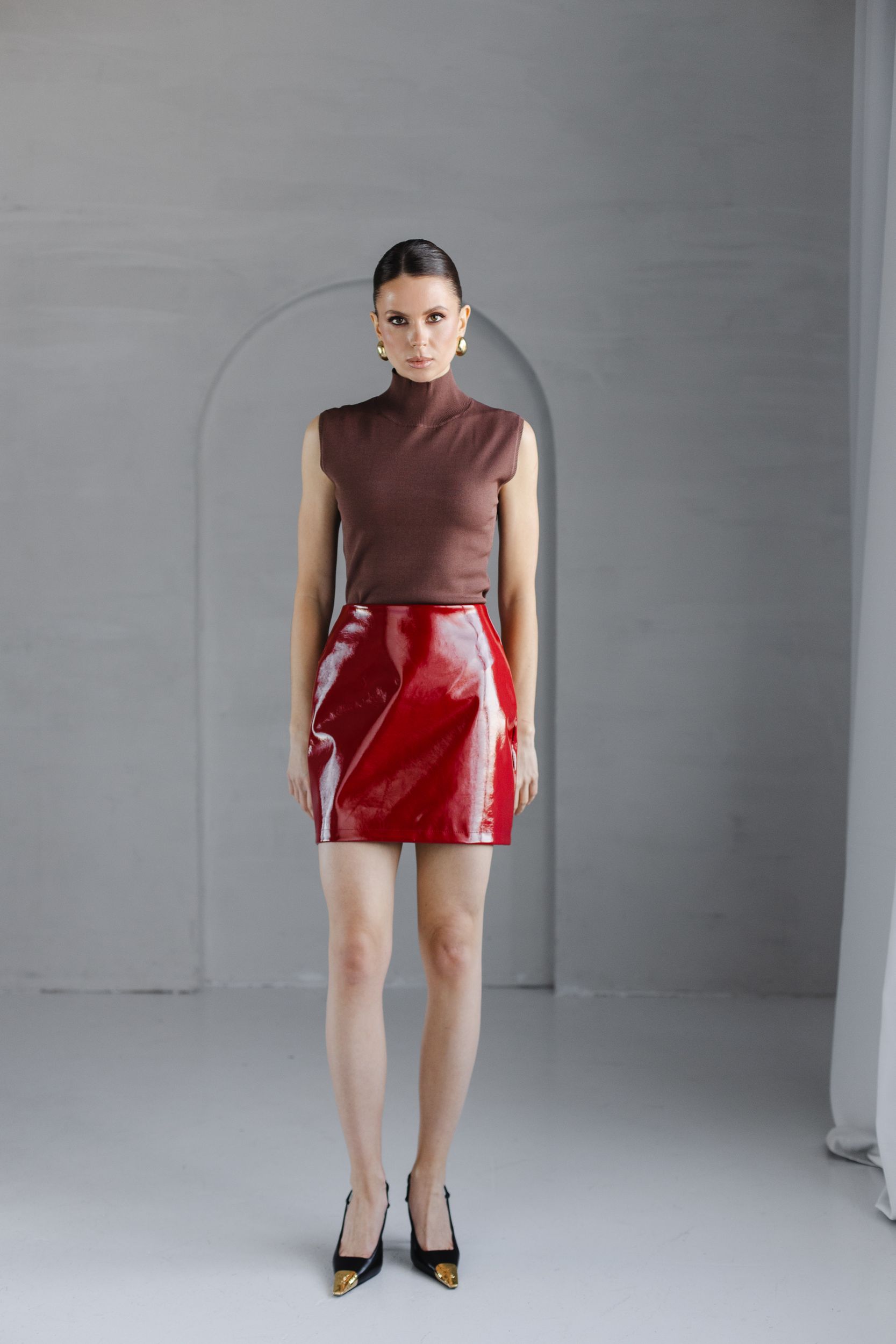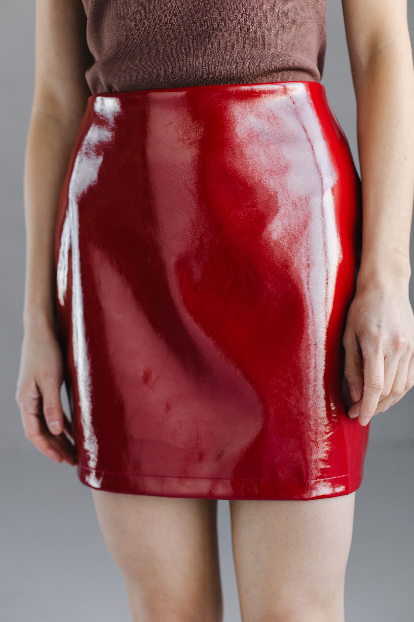 Юбка из искусственной кожи с глянцевым эффектом.