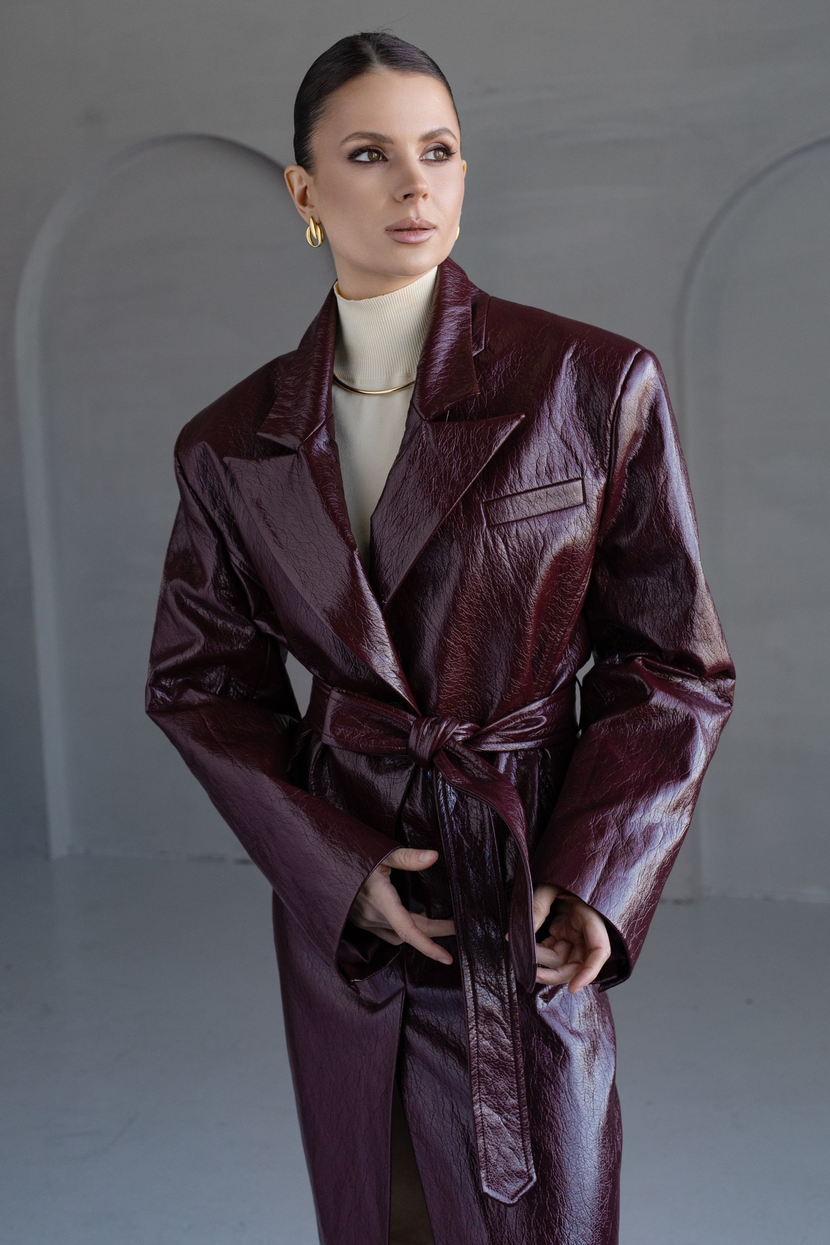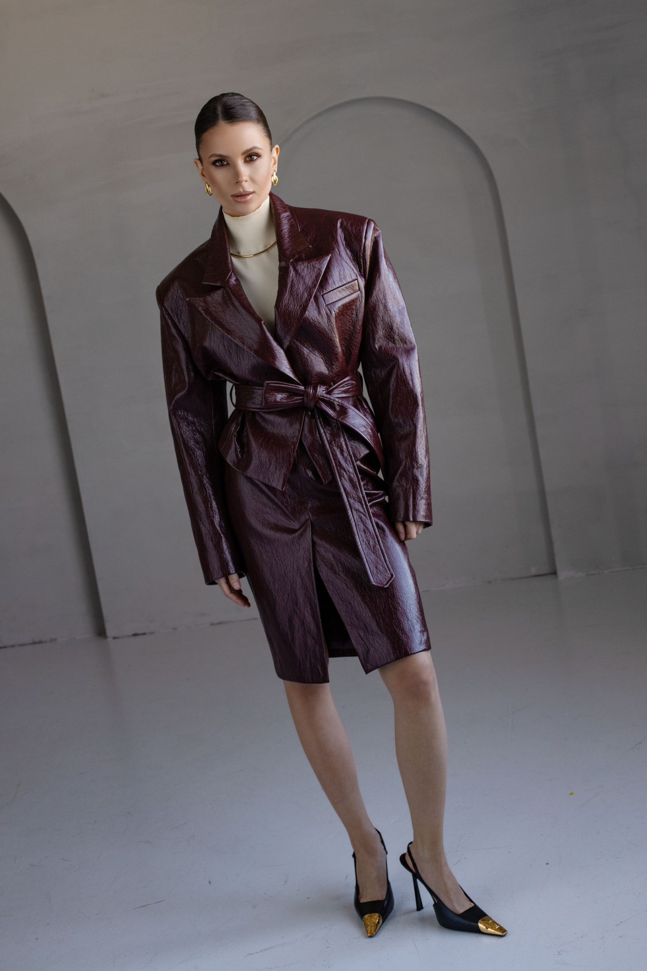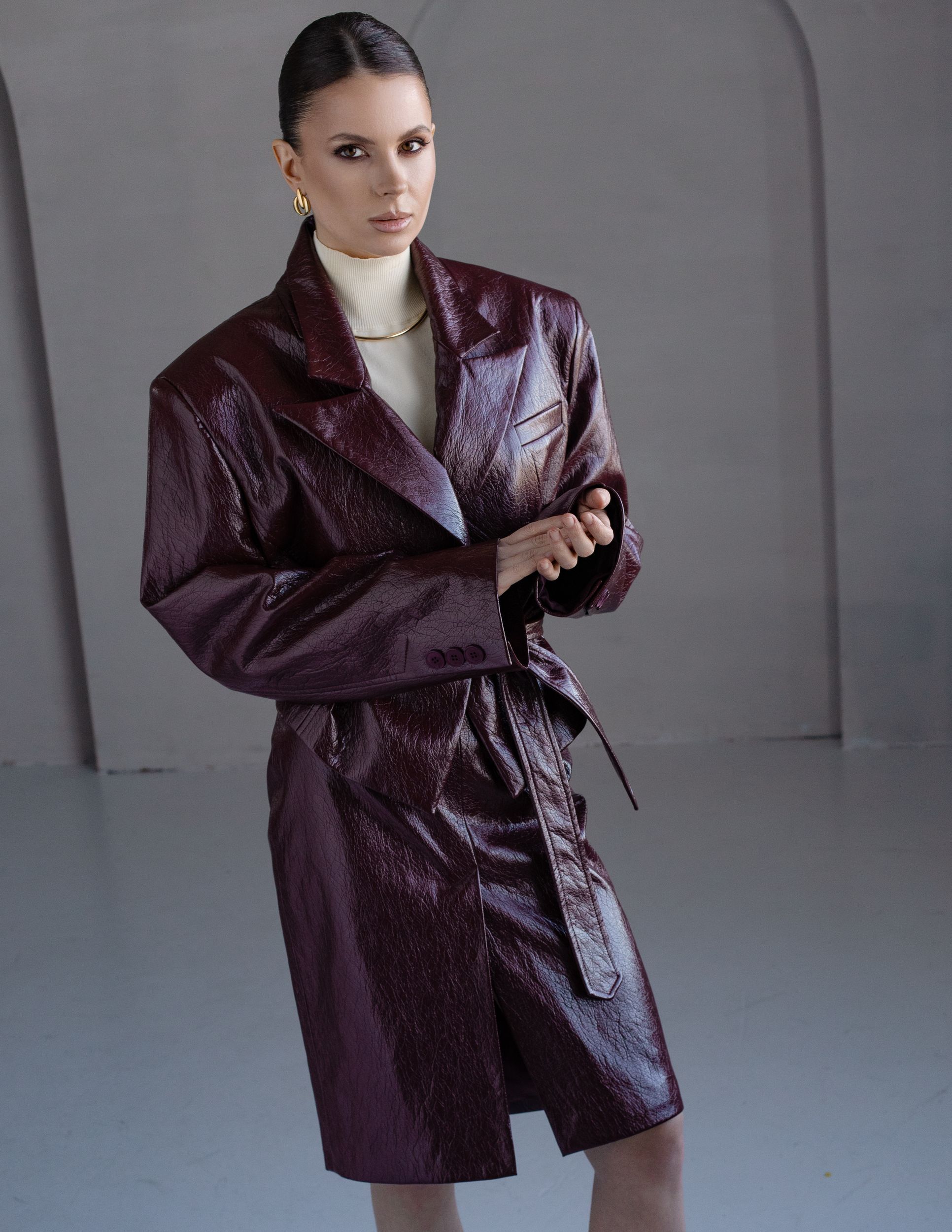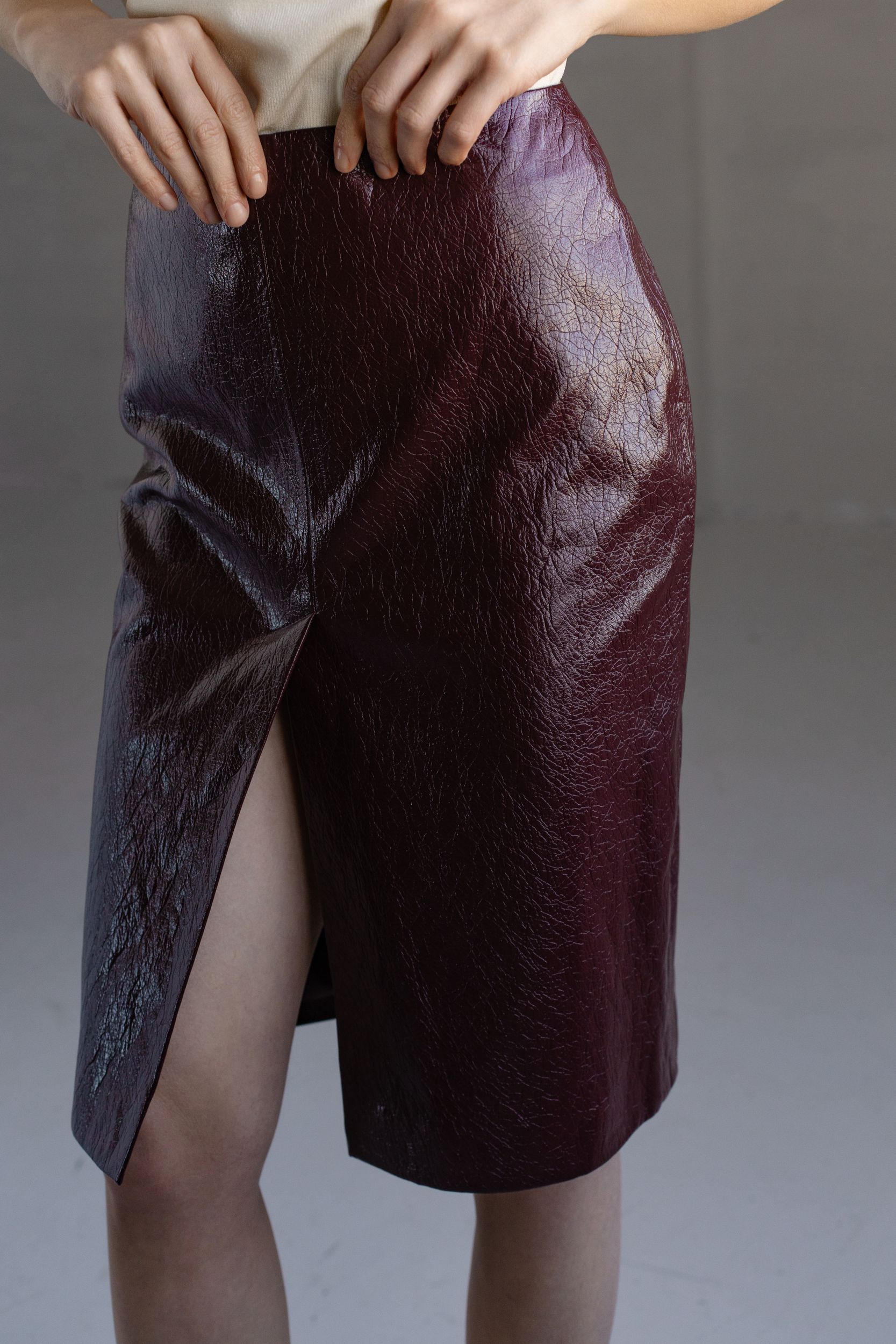 Юбка из искусственной фактурной кожи в темно-бордовом оттенке.