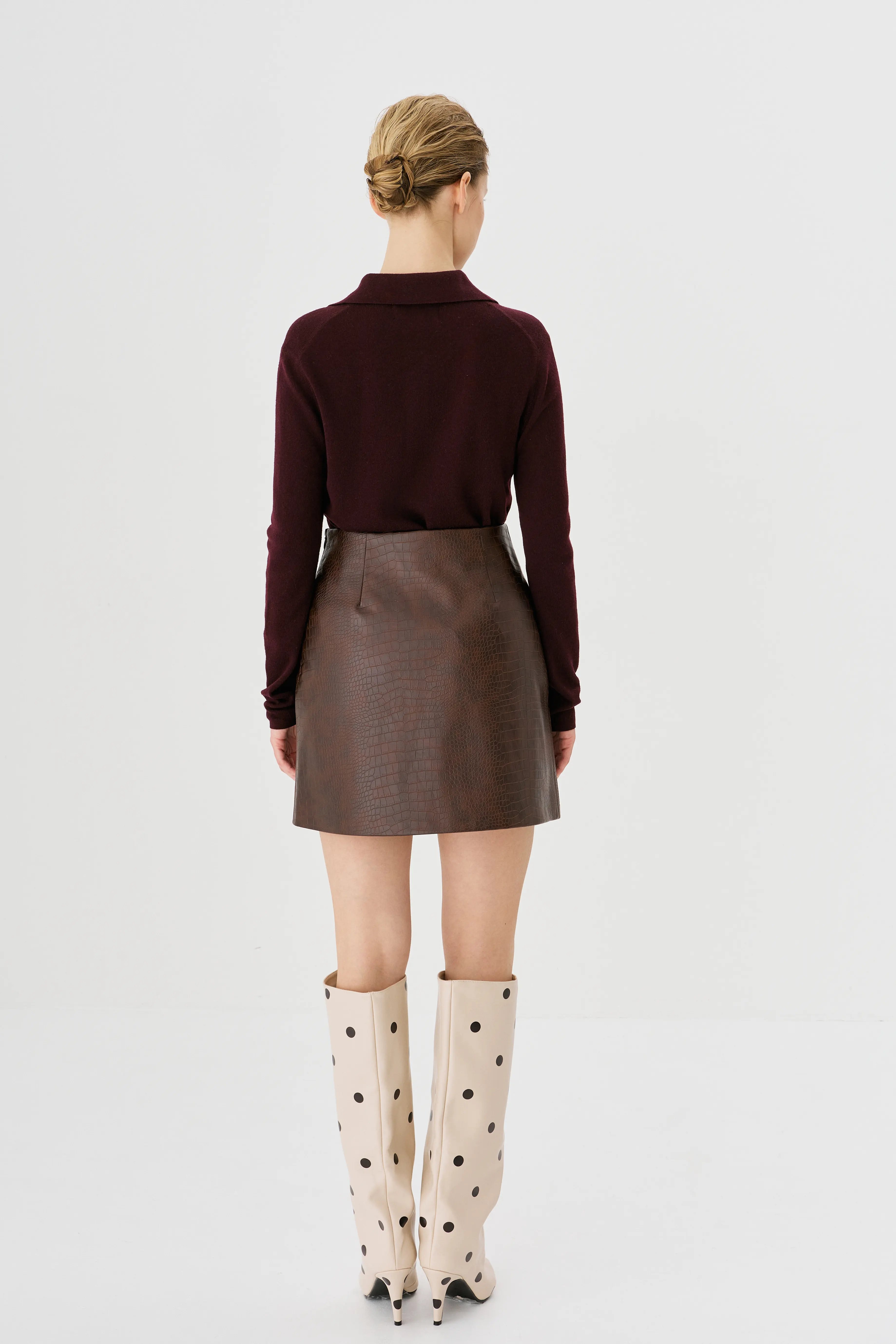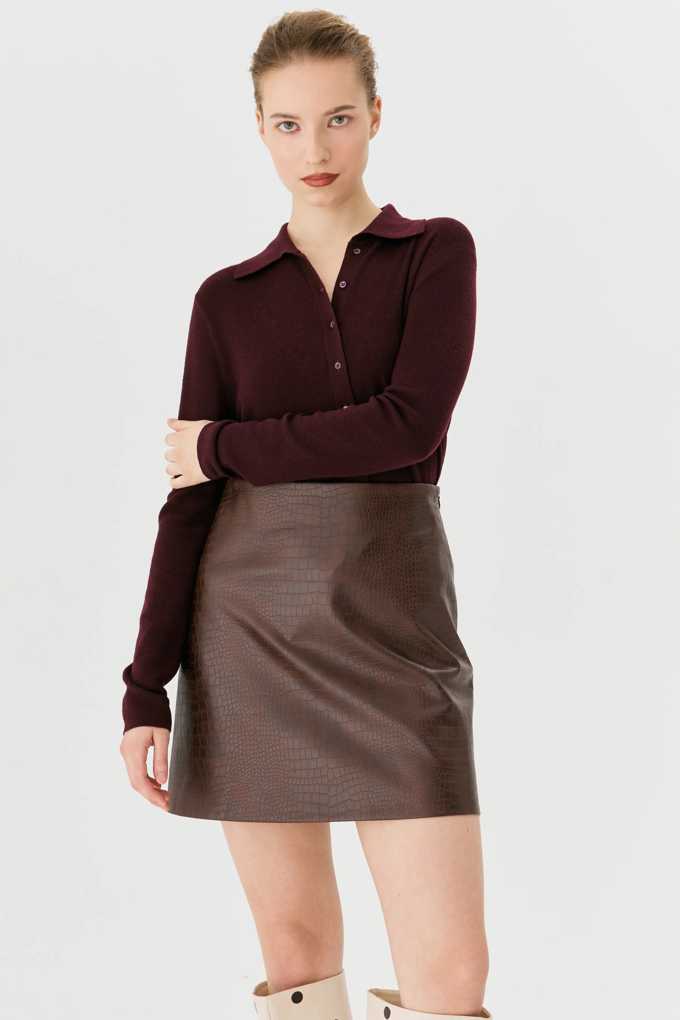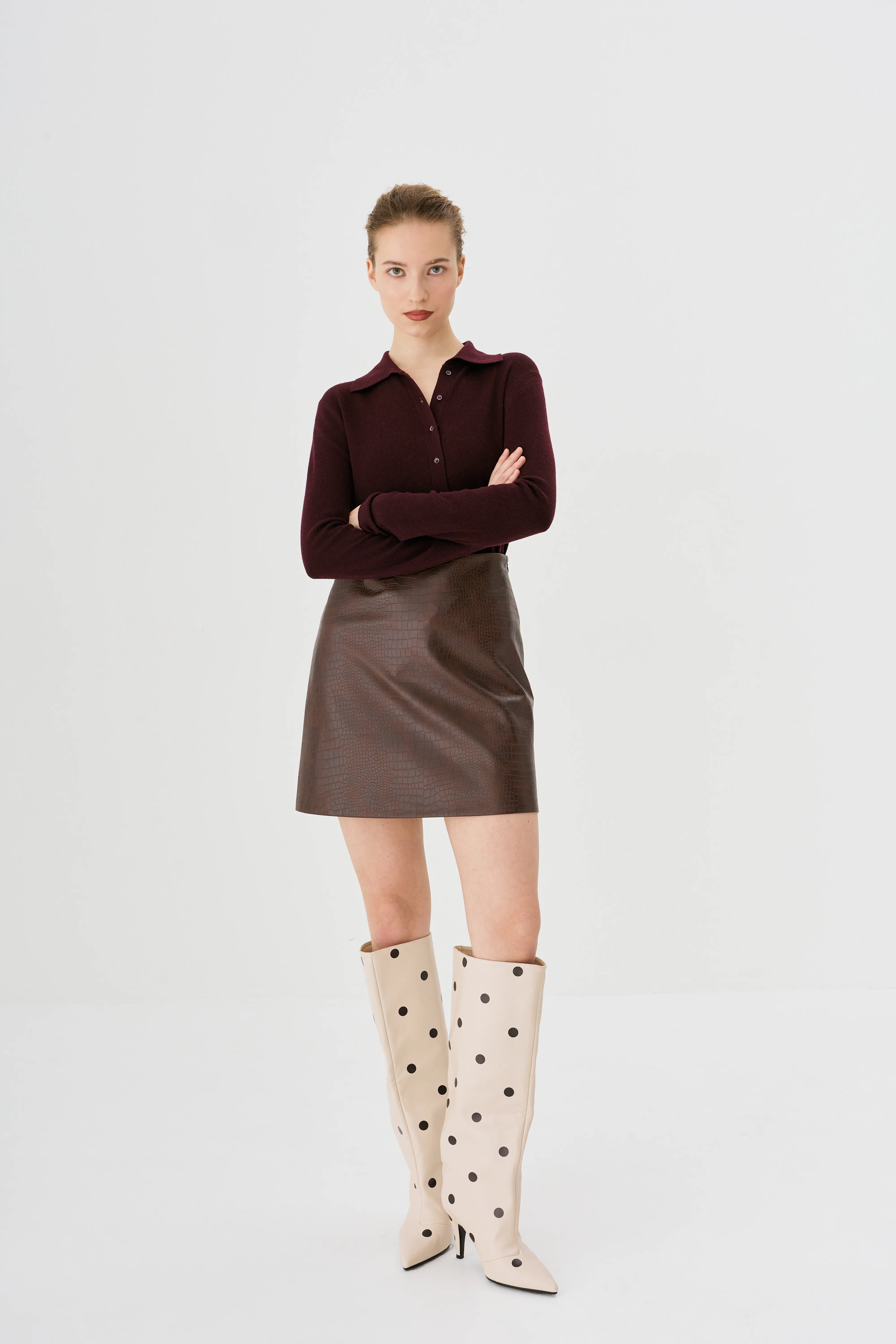 Смелая мини-юбка из экокожи с фактурным тиснением — идеальный баланс смелости и комфорта! Расширяющийся крой от высокой талии создает свободный силуэт, скрывая бедра и подчеркивая талию. Экокожа устойчива к износу, легко чистится и выглядит премиально. Идеальна с укороченными топами, свитерами или рубашками — от вечеринок до прогулок.