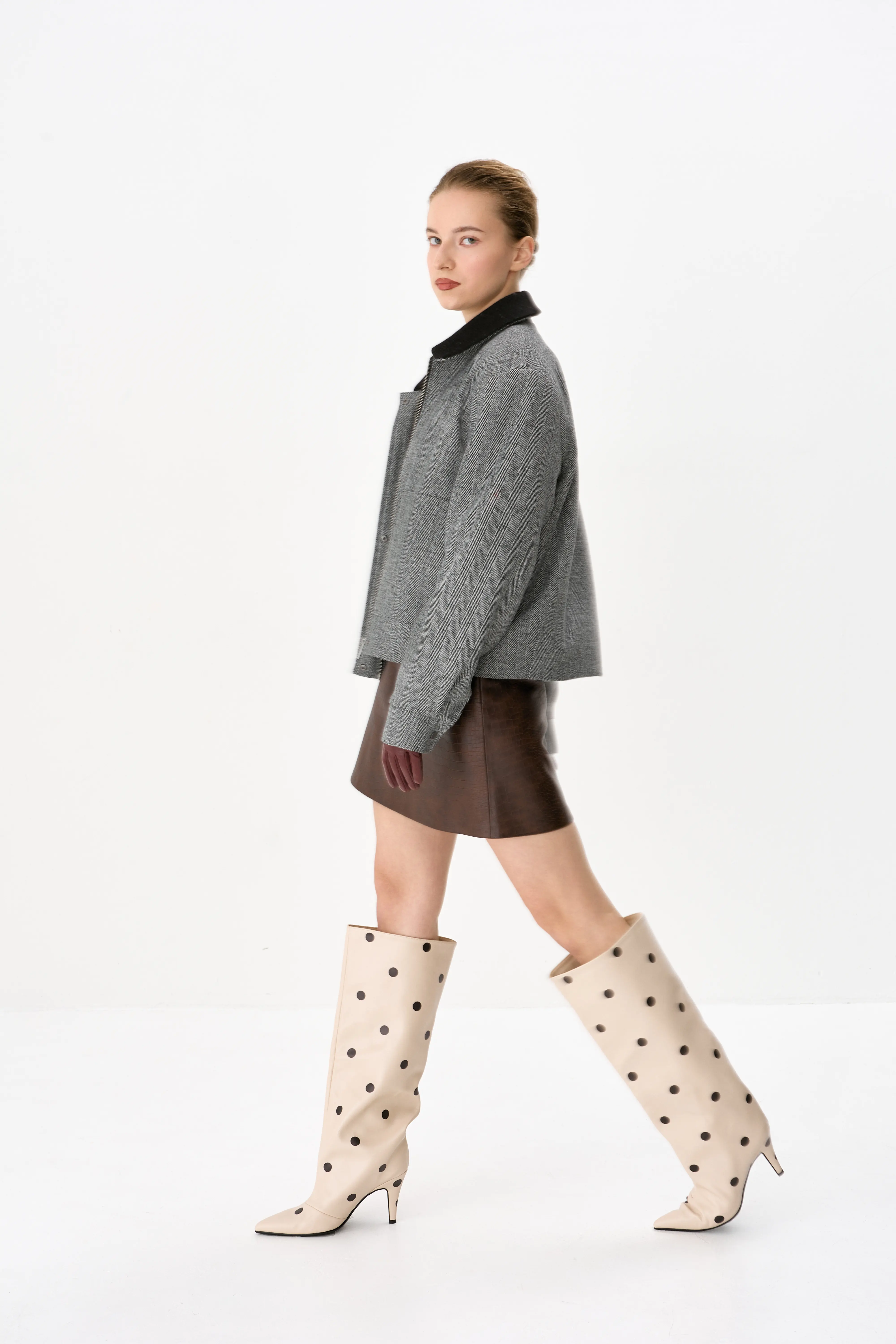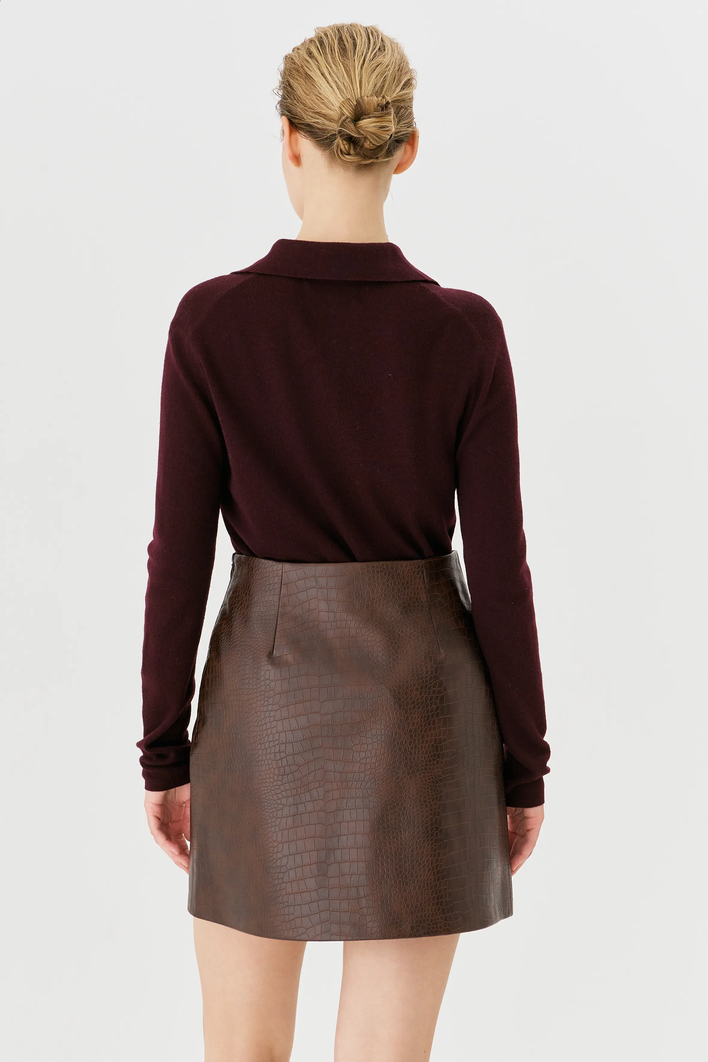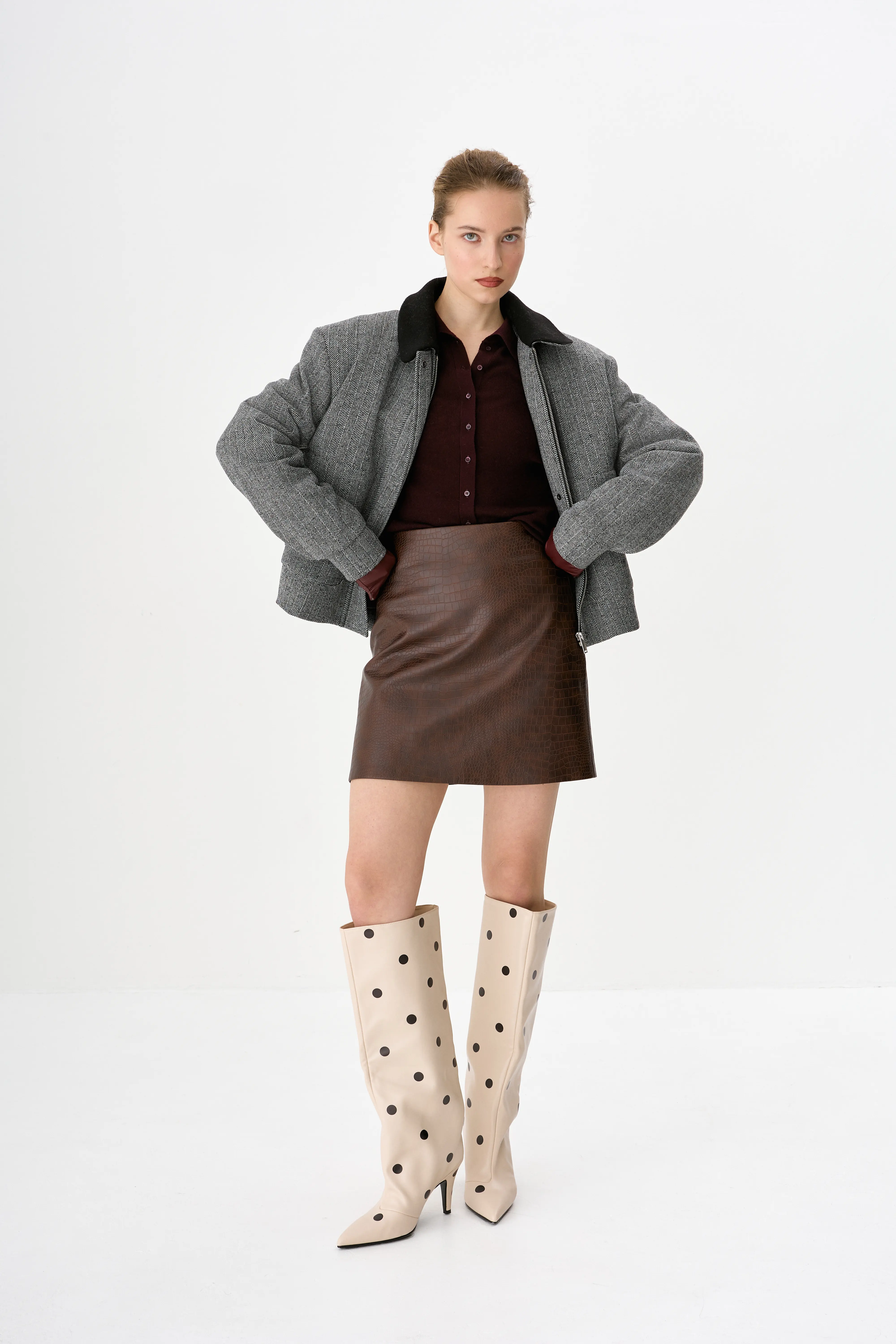 Смелая мини-юбка из экокожи с фактурным тиснением — идеальный баланс смелости и комфорта! Расширяющийся крой от высокой талии создает свободный силуэт, скрывая бедра и подчеркивая талию. Экокожа устойчива к износу, легко чистится и выглядит премиально. Идеальна с укороченными топами, свитерами или рубашками — от вечеринок до прогулок.