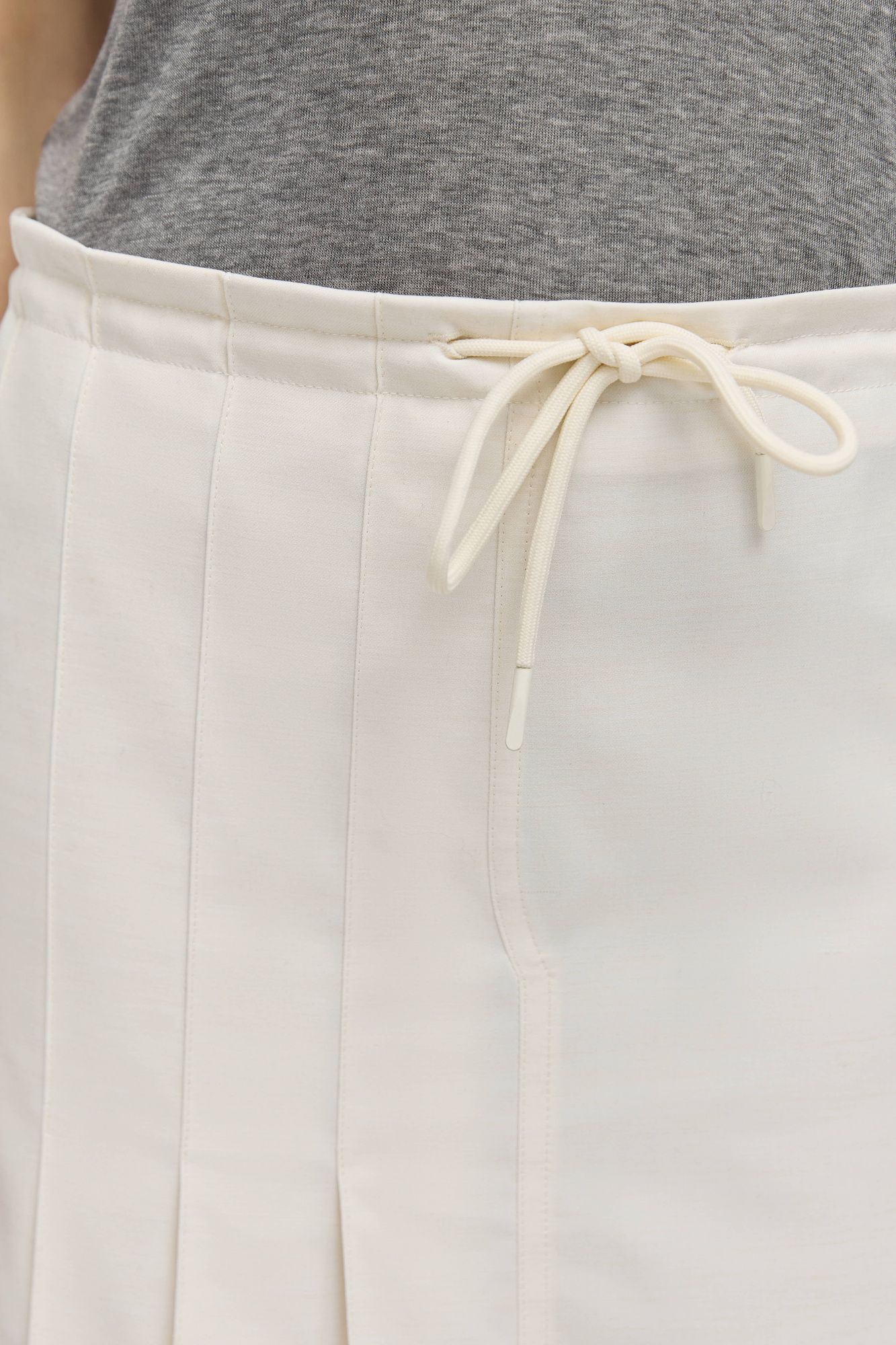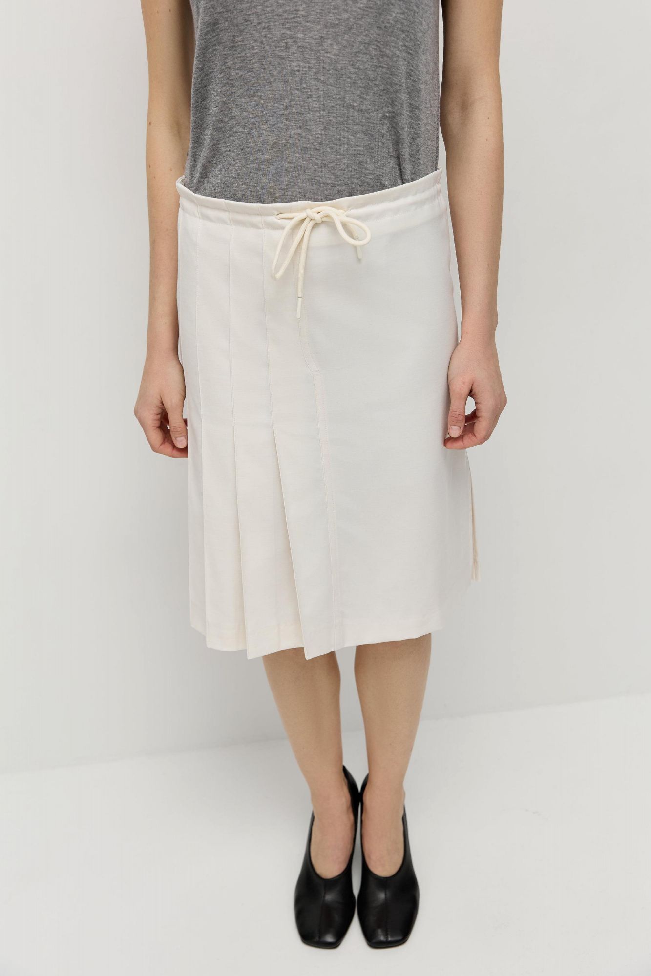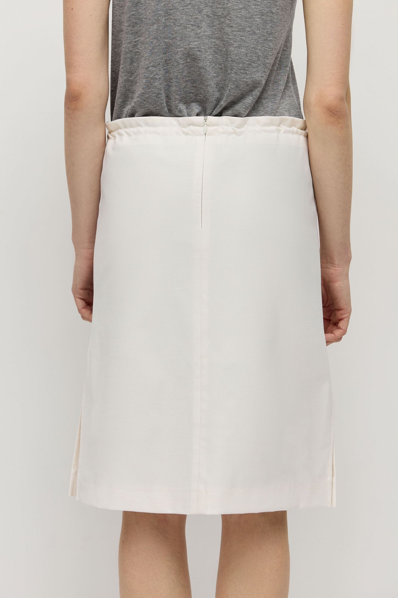 У юбки слегка трапецевидная форма, средняя посадка, внутри кулиски есть шнур для регулировки посадки. Передняя часть юбки состоит из двух частей: правая половина в фактурную складку, левая половина гладкая.