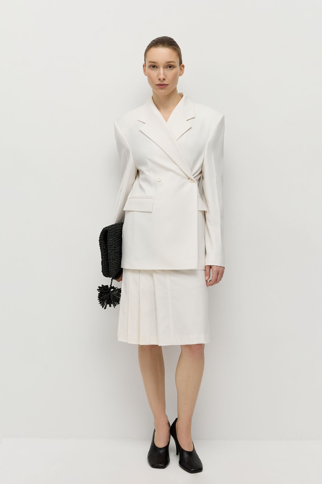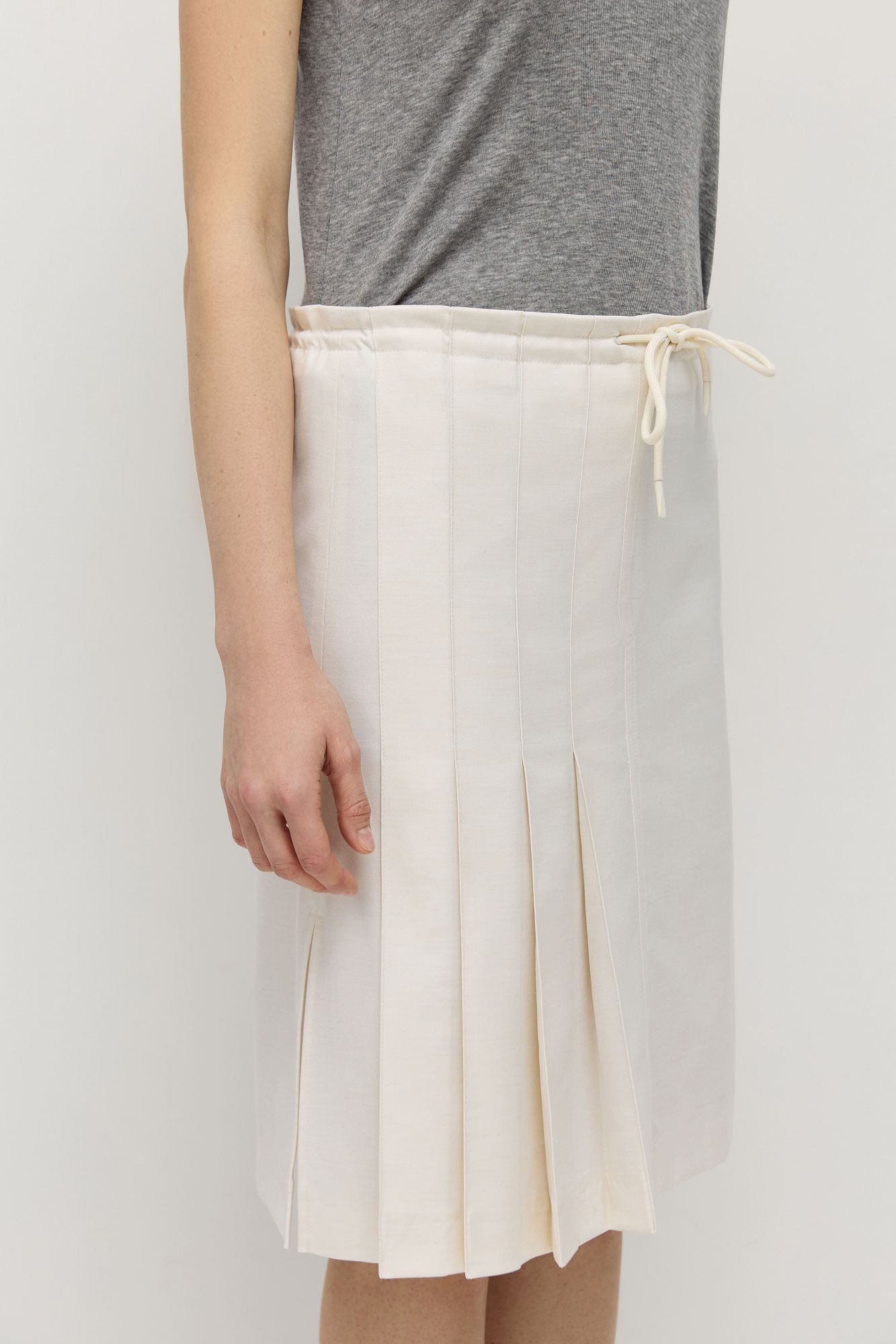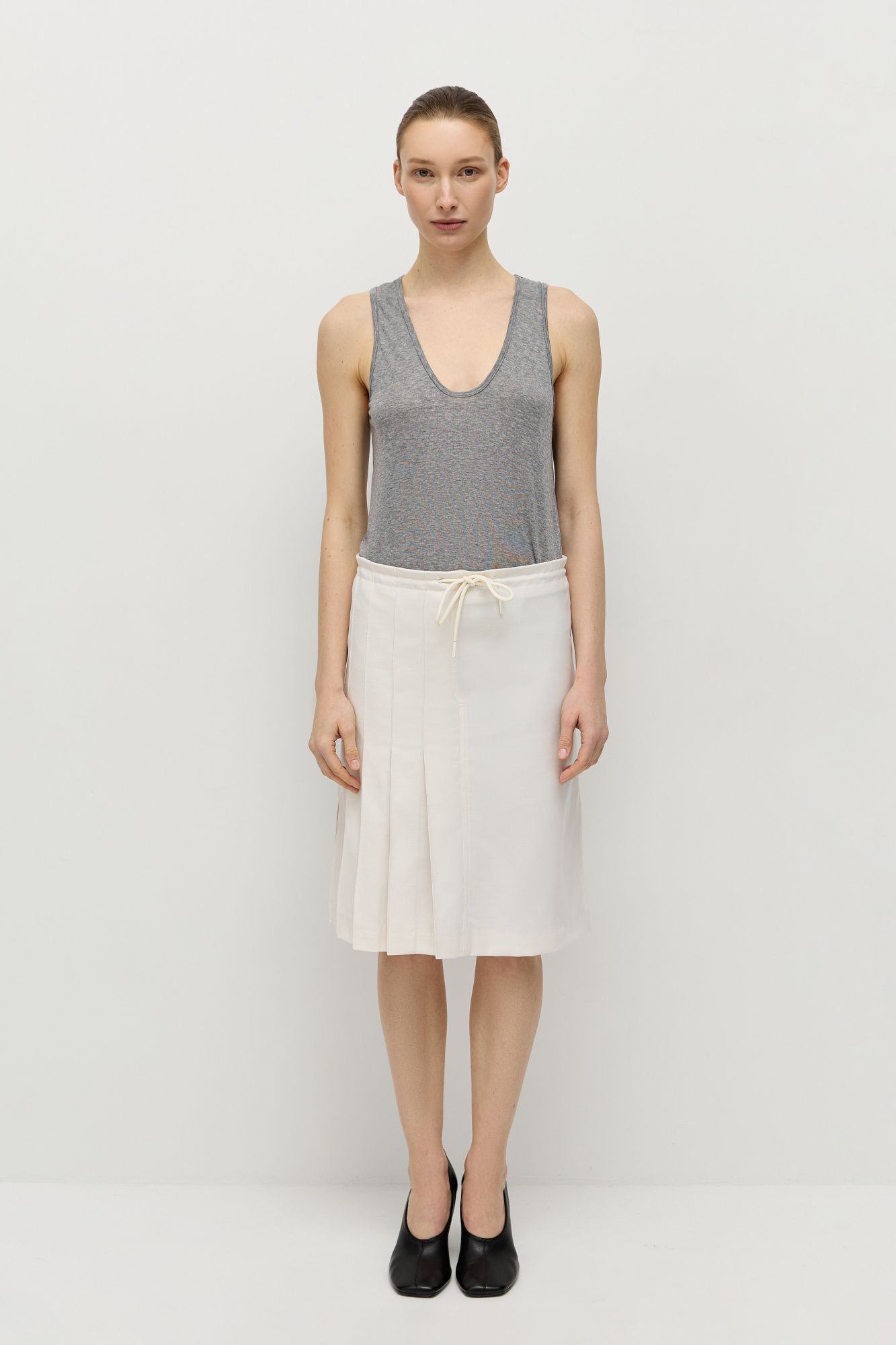 У юбки слегка трапецевидная форма, средняя посадка, внутри кулиски есть шнур для регулировки посадки. Передняя часть юбки состоит из двух частей: правая половина в фактурную складку, левая половина гладкая.