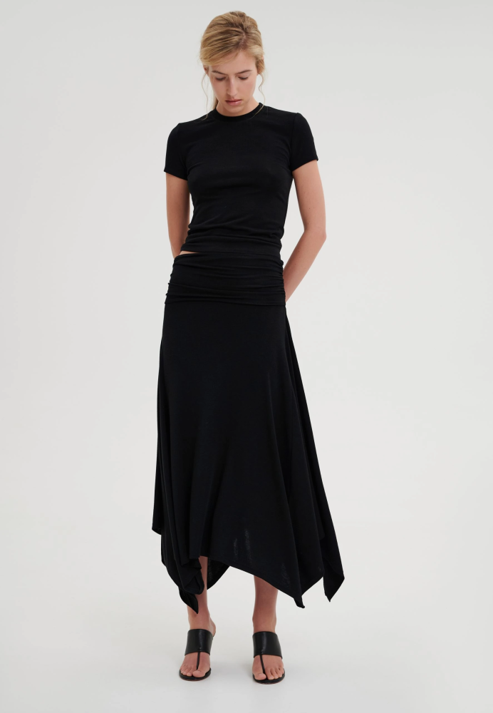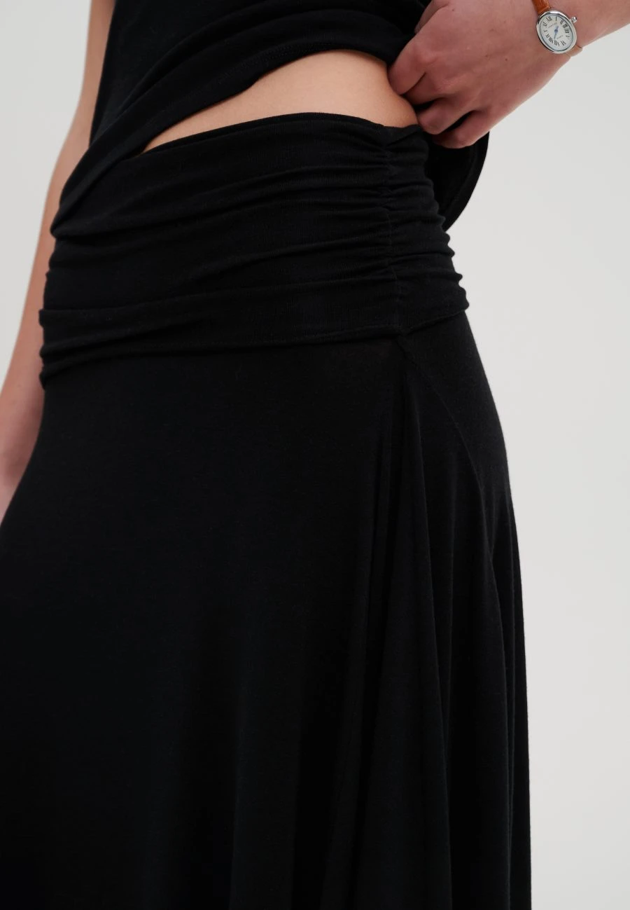 Юбка ассиметричного кроя в универсальном черном оттенке. Ассиметричный крой с клиньями по низу и широкий отворот по линии талии создают динамику движения и добавляют образу графичности. Модель выполнена из тенселя с добавлением шерсти. Материал легко драпируется, приятен к телу и сохраняет комфорт в течении дня. Юбка гармонично сочетается с лонгсливом, образуя цельный минималистичный комплект.