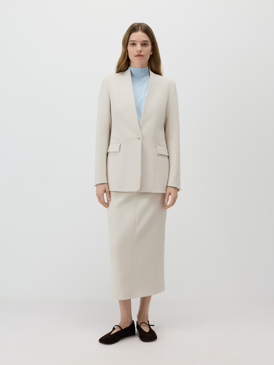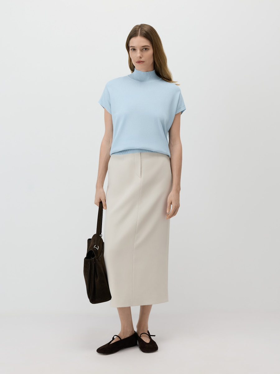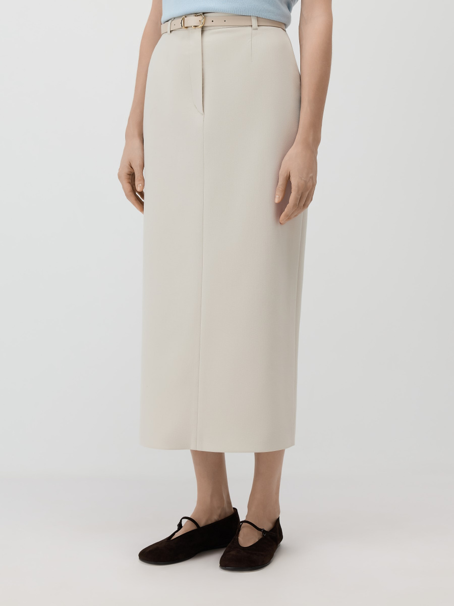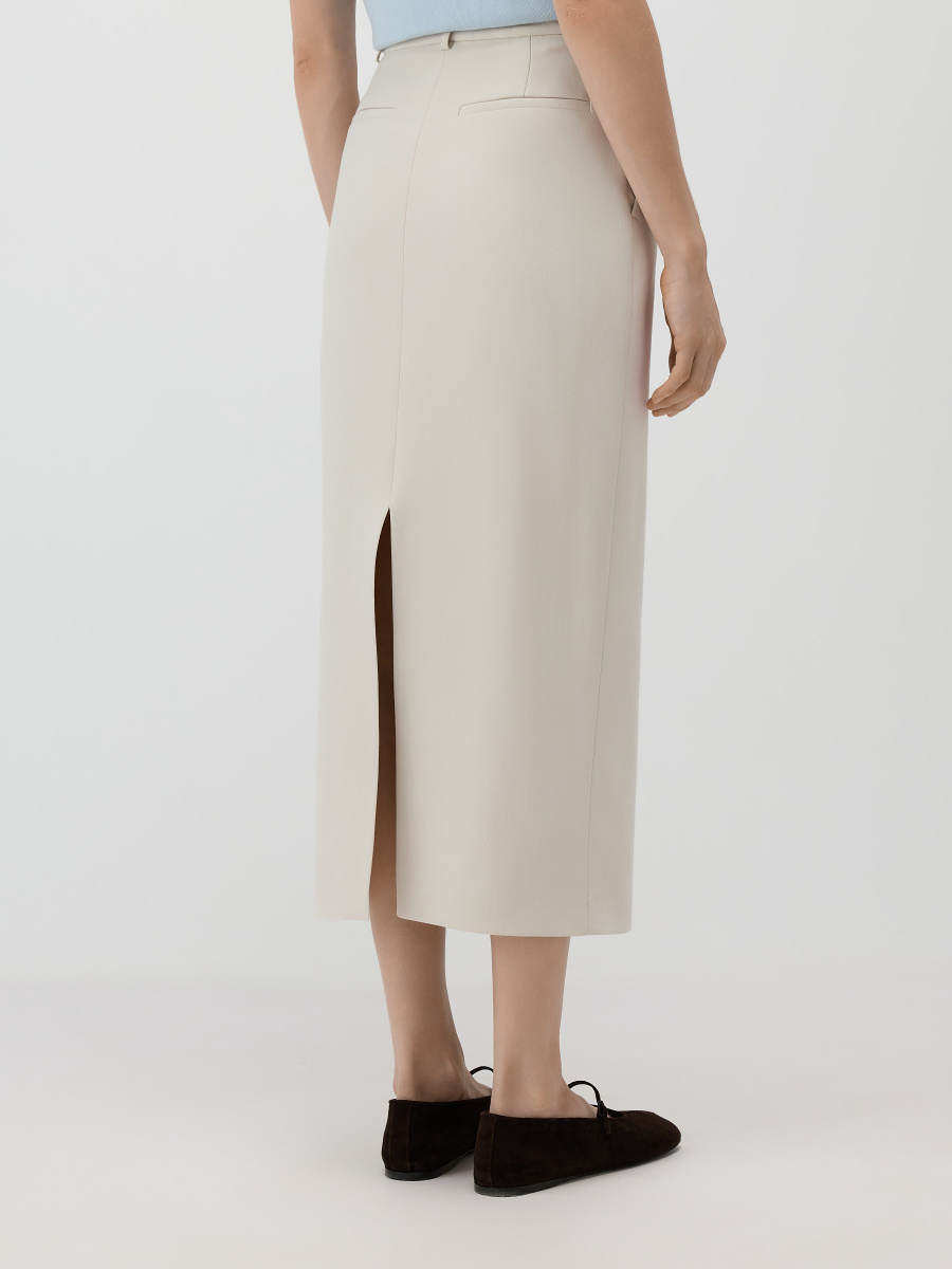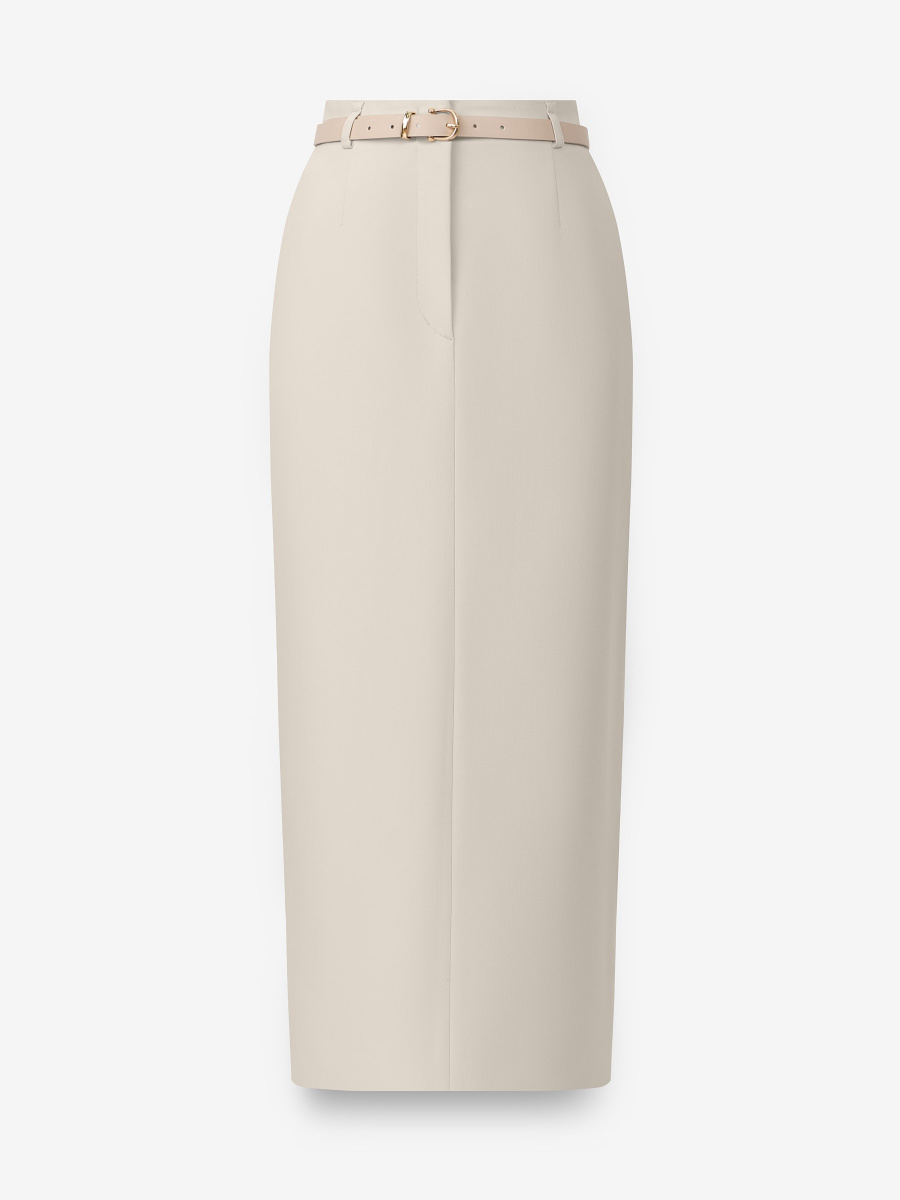 Прямая юбка миди из немнущейся костюмной поливискозы, ориентированная на теплый сезон. Сложного кроя, с эластичной вставкой на поясе для моделирования посадки и раскрытой шлицей, обеспечивающей свободный шаг. Шлевки, функциональные боковые и задние карманы-имитации, скользящая подкладка по всей длине, застежка на молнию, крючок и пуговицу. В комплекте ремень из экокожи в тон.