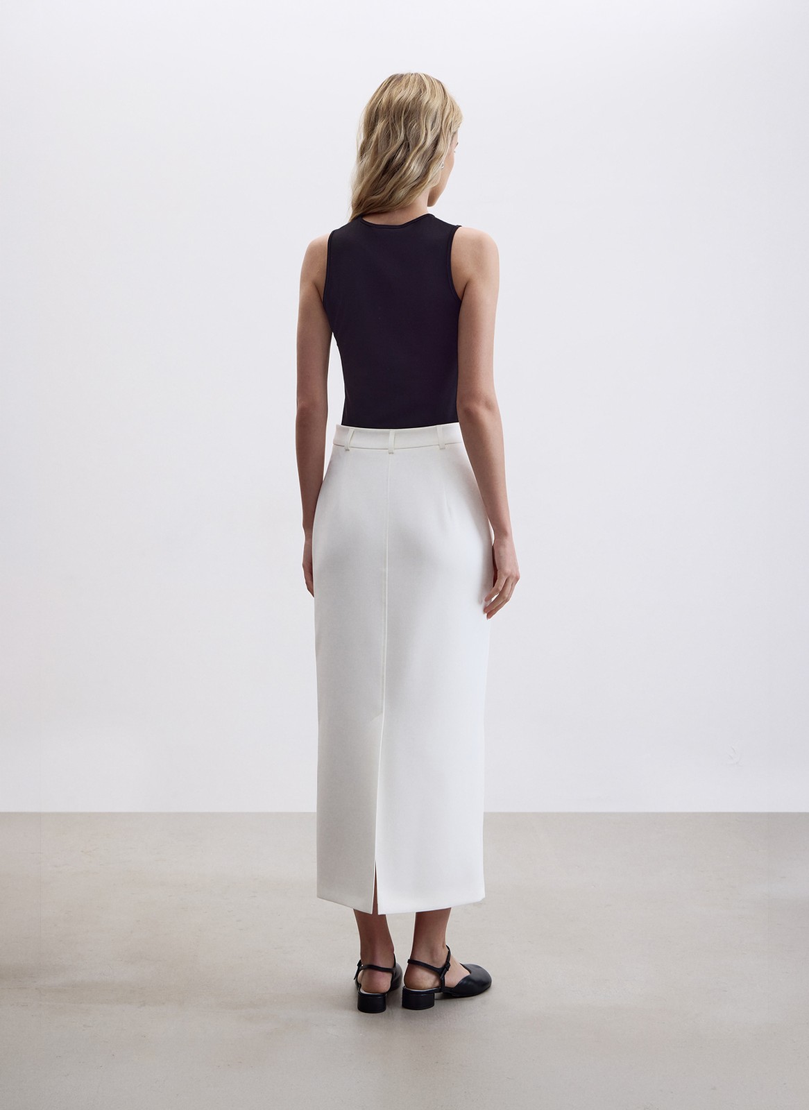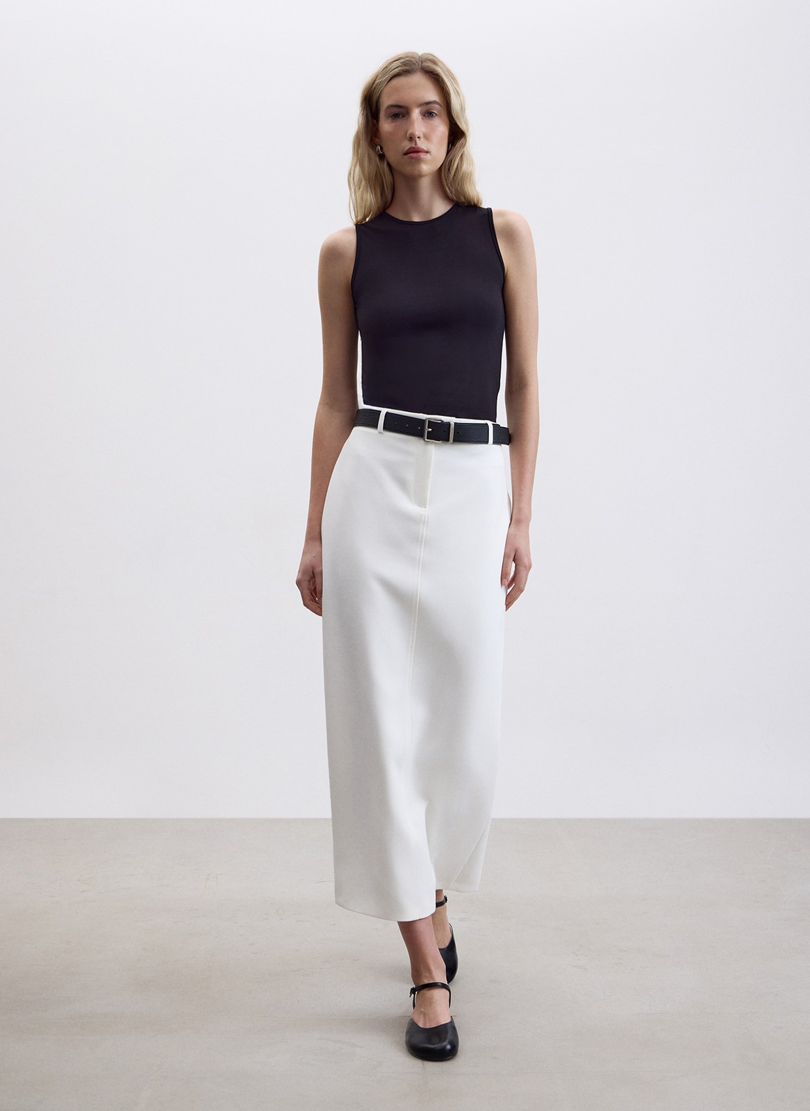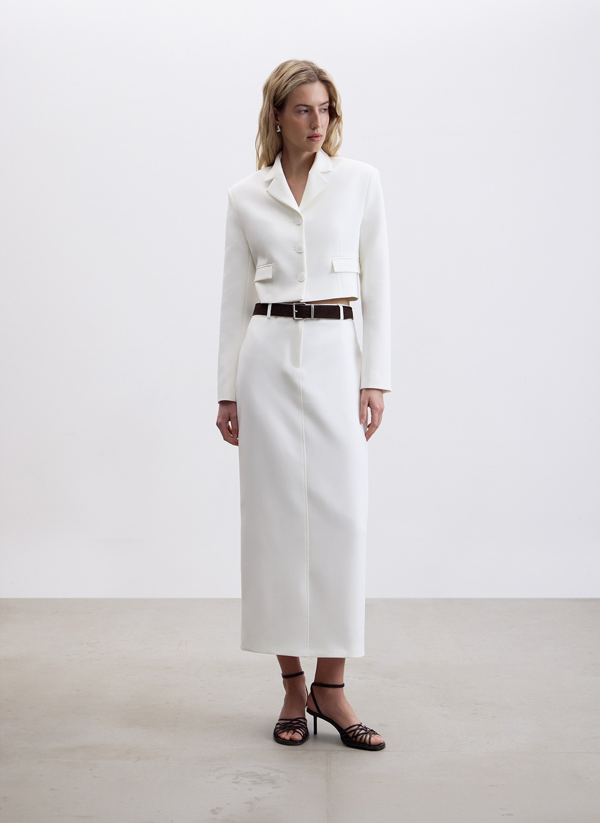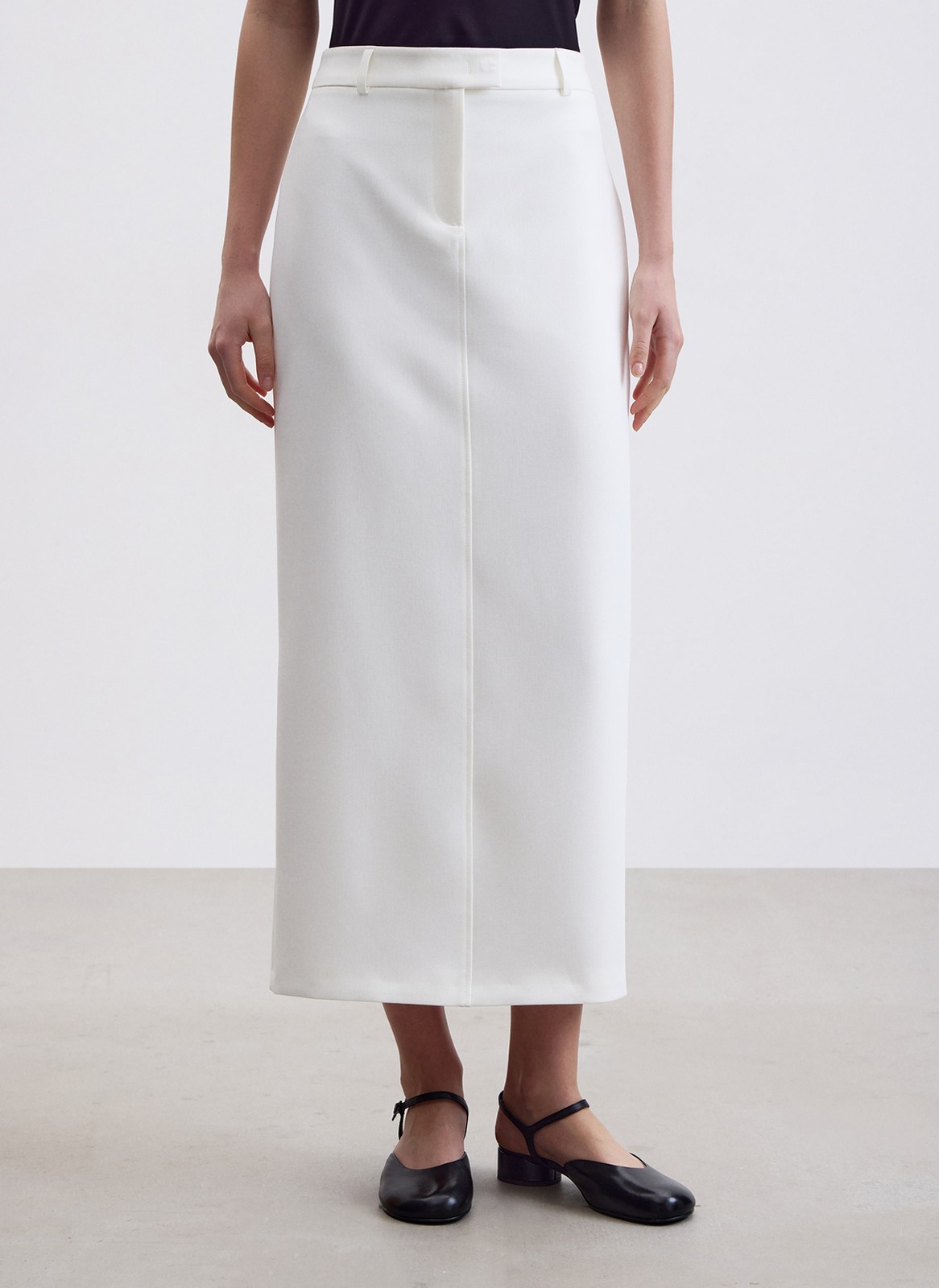 Прямой, чуть облегающий крой подчёркивает фигуру, а шлица обеспечивает комфорт при ходьбе.
